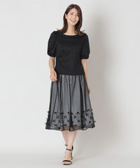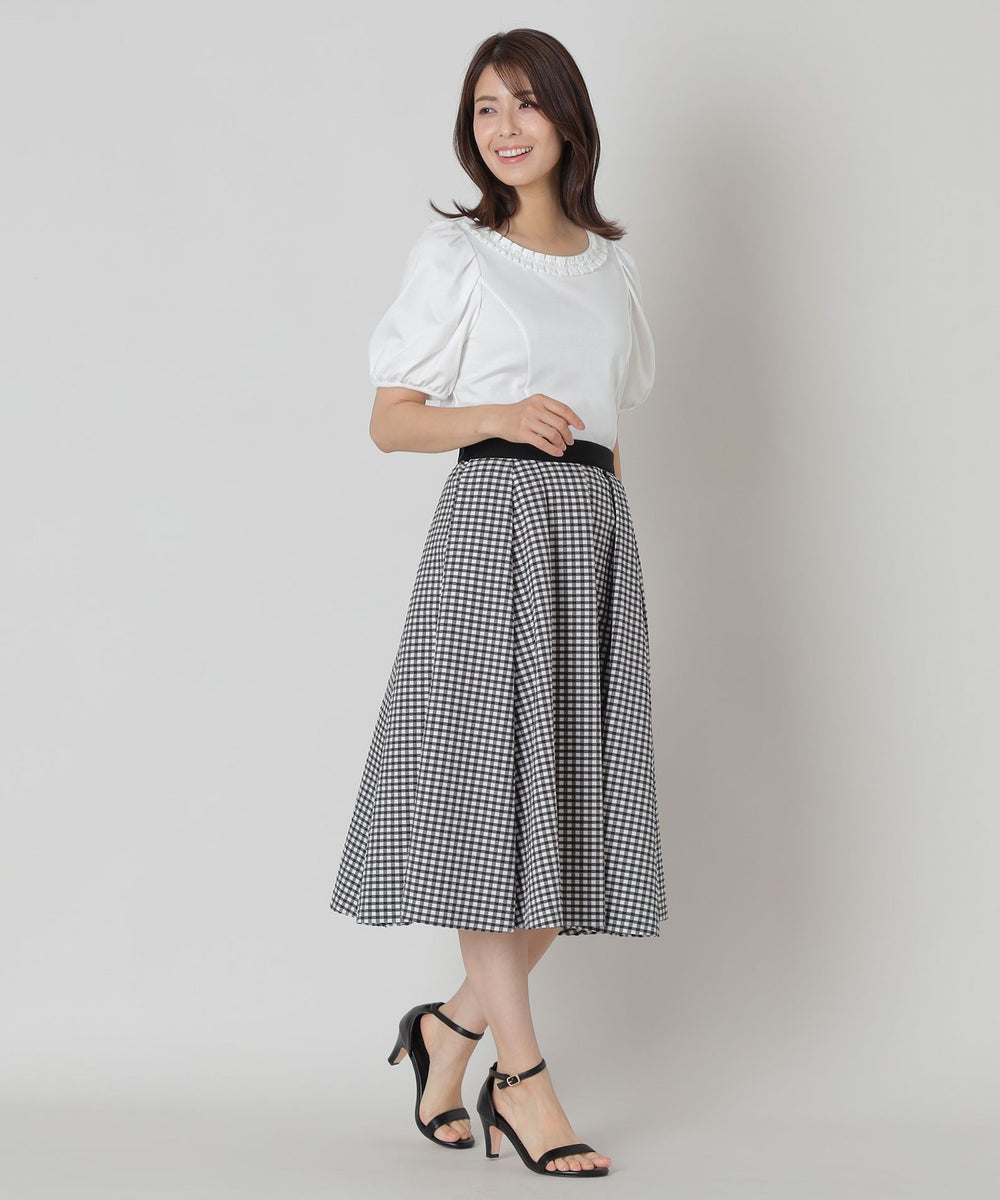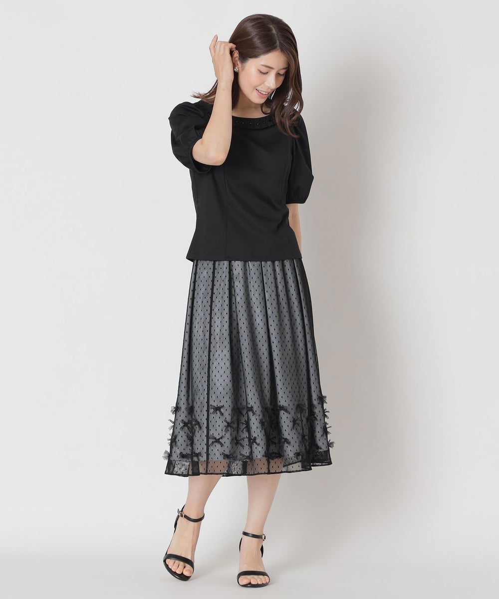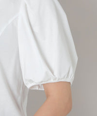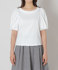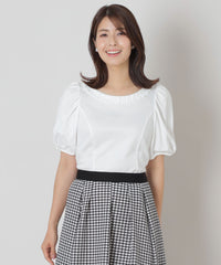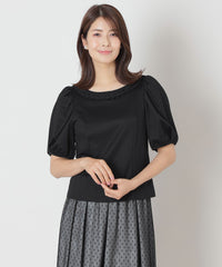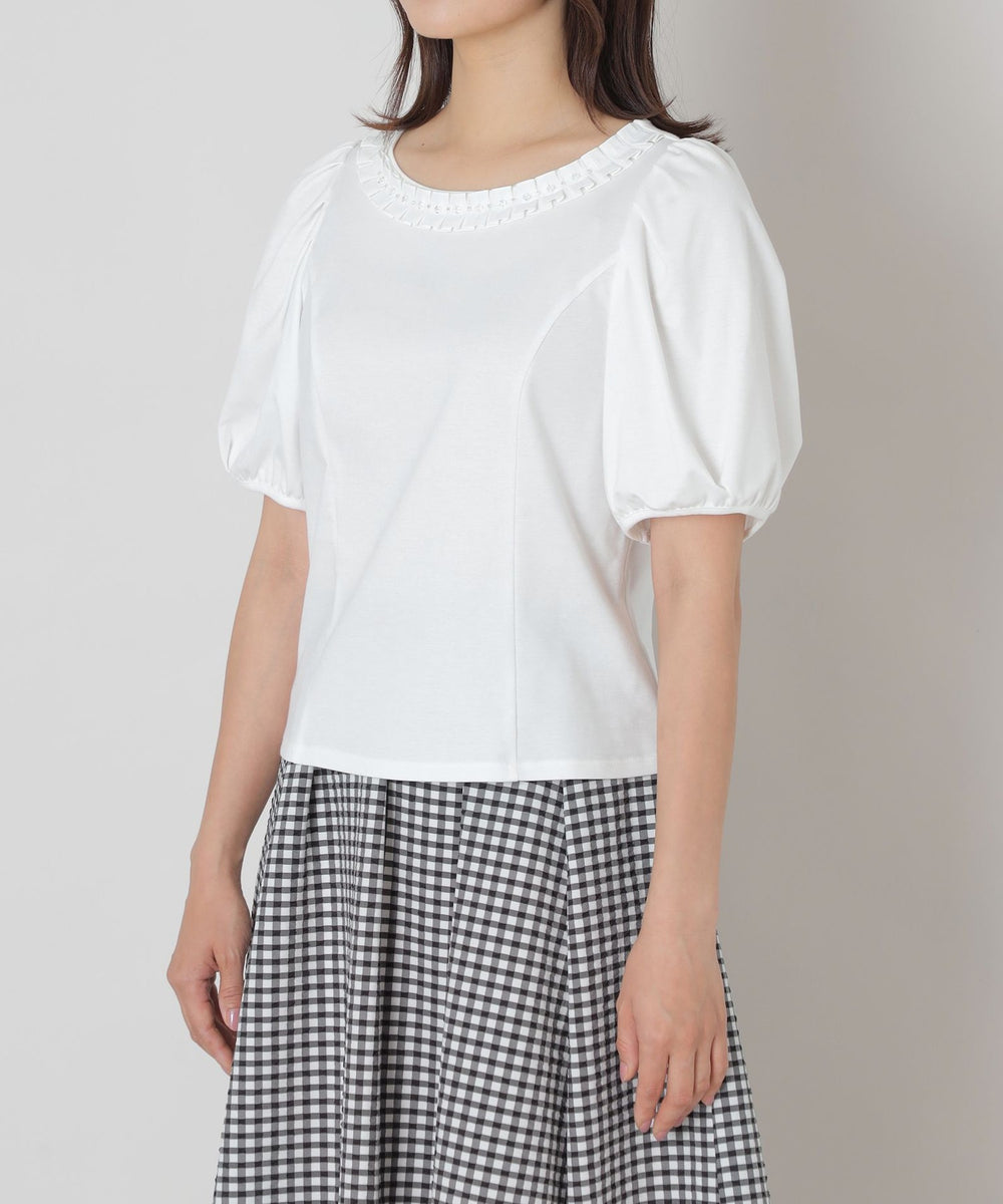 襟元にタックで立体感を出したリボンディテールと、さりげなく輝くビジューをあしらった華やかなカットソープルオーバー。パネル切り替えによる美しいシルエットと、ふんわりとしたギャザー袖が可愛らしさを引き立てます。上品でありながら、一枚で華のある着こなしがかなうアイテムです。