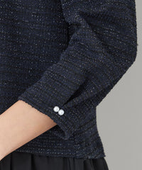 高級感のあるリッチな質感ときちんとしたシルエットを保つ耐摩耗性・防シワ性が特徴で、シーズンレスに快適に着用できるツイード素材を使用しています。別布には柔らかく軽量で、薄手ながらも透けにくい高密度タフタを使用し、全体の着心地と機能性を高めています。