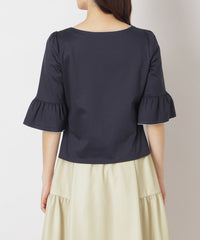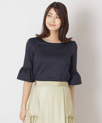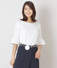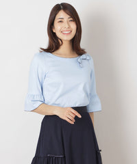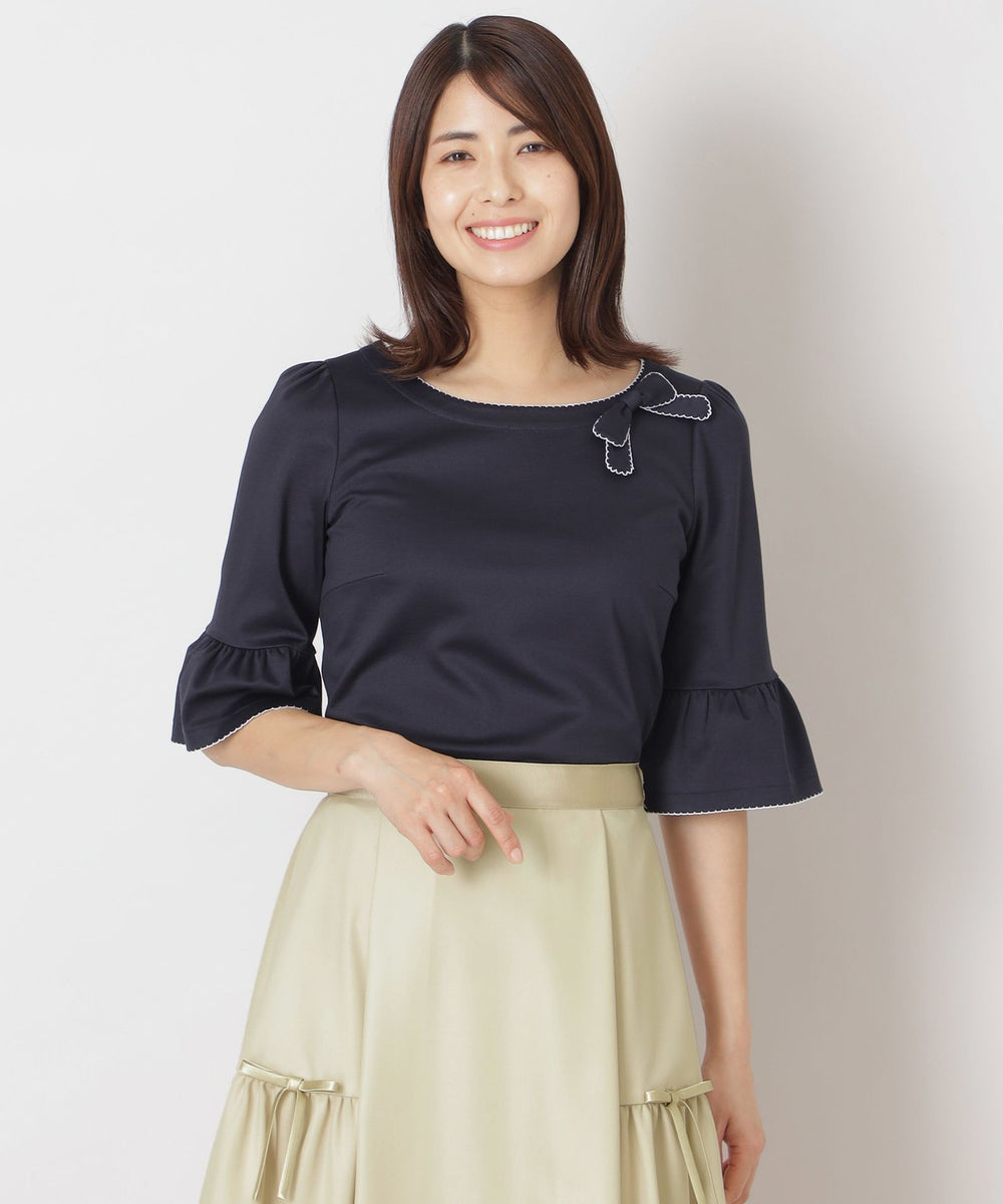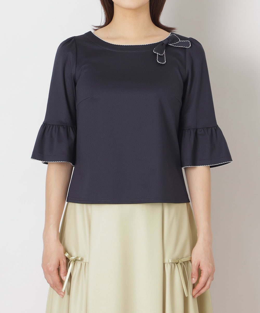 襟、袖口、リボンコサージュに配色のピコ刺しゅうをあしらった、袖切替えデザインがポイントのカットソーです。