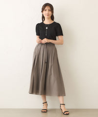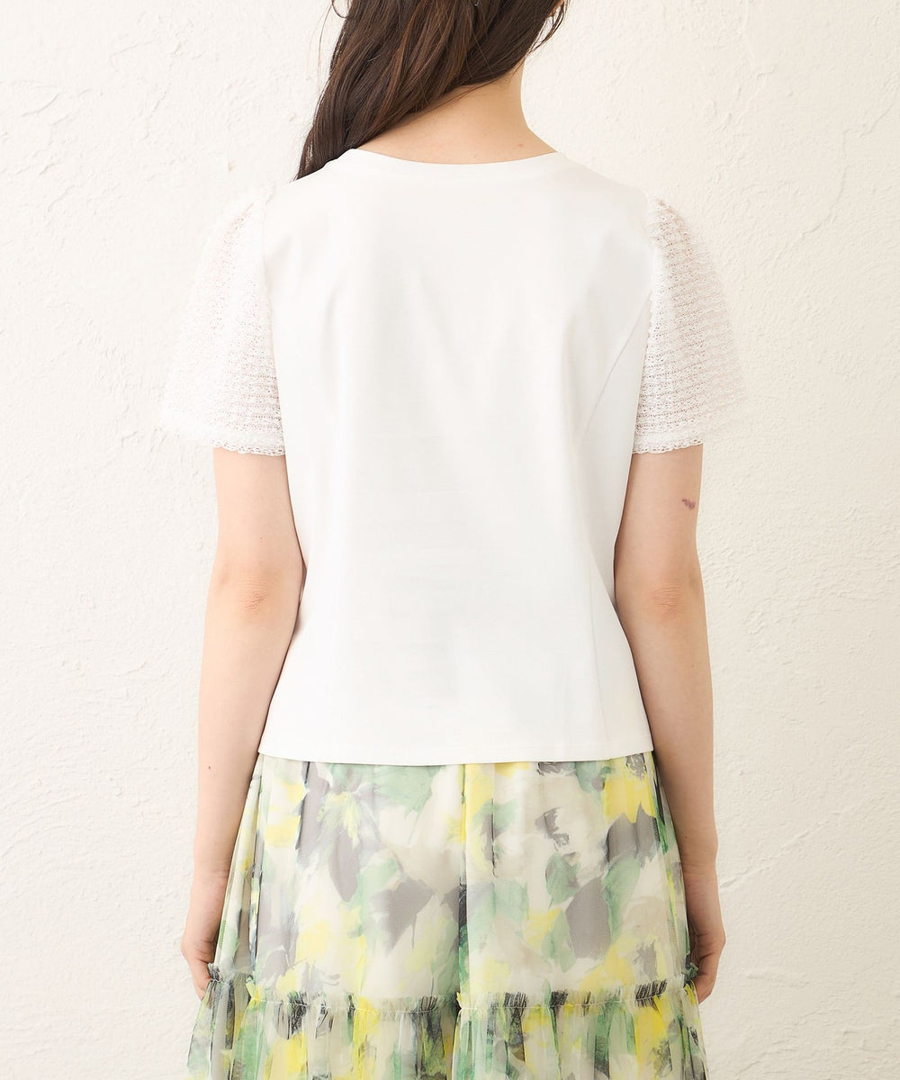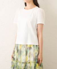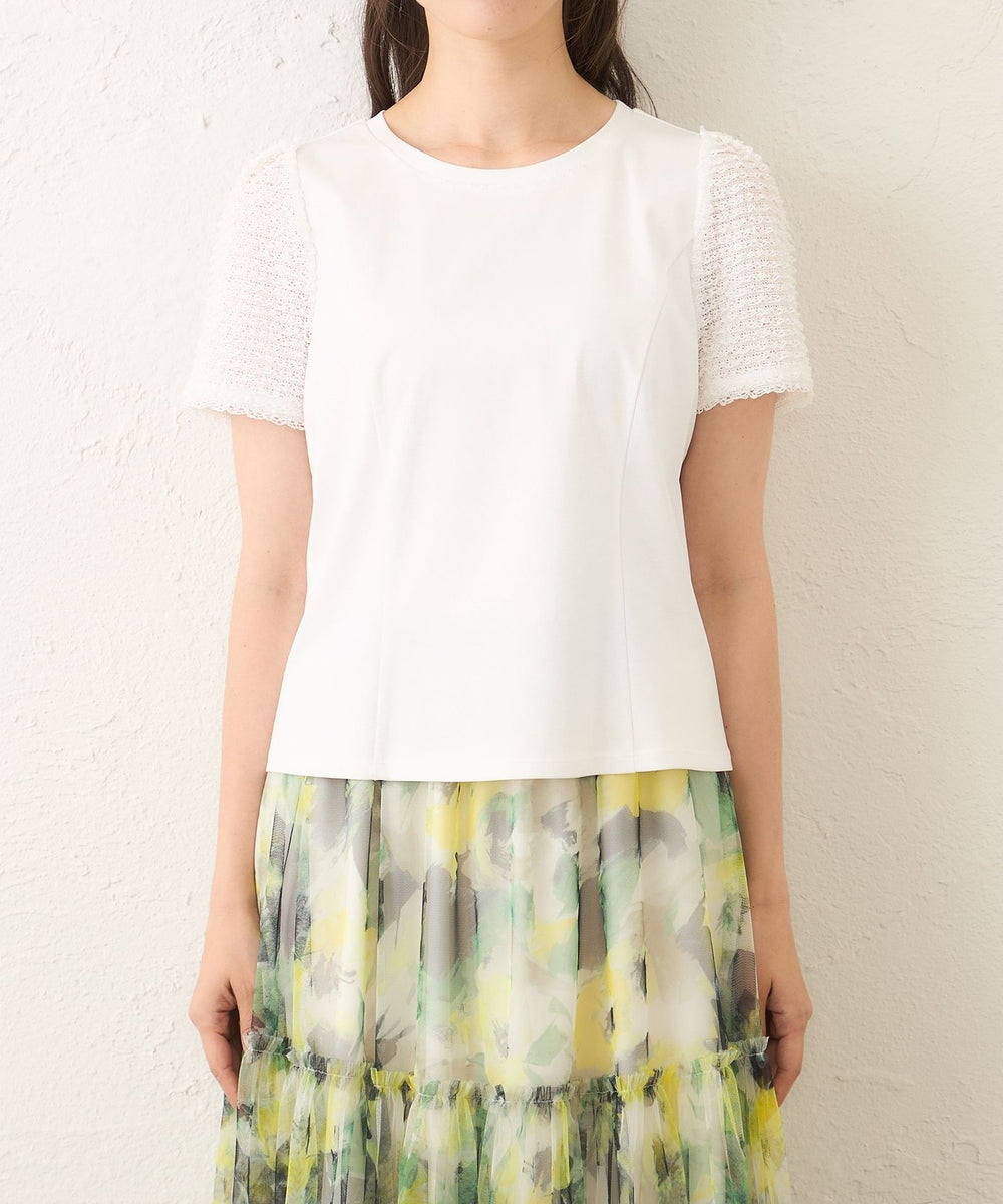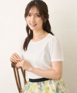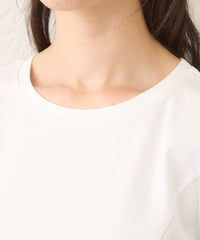細フリル生地にタックを入れてキャップスリーブ風に仕立て、衿ぐりにはビジューをあしらい、華やかな印象のカットソープルオーバーに仕上げました。