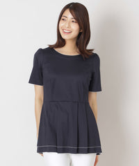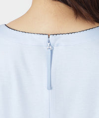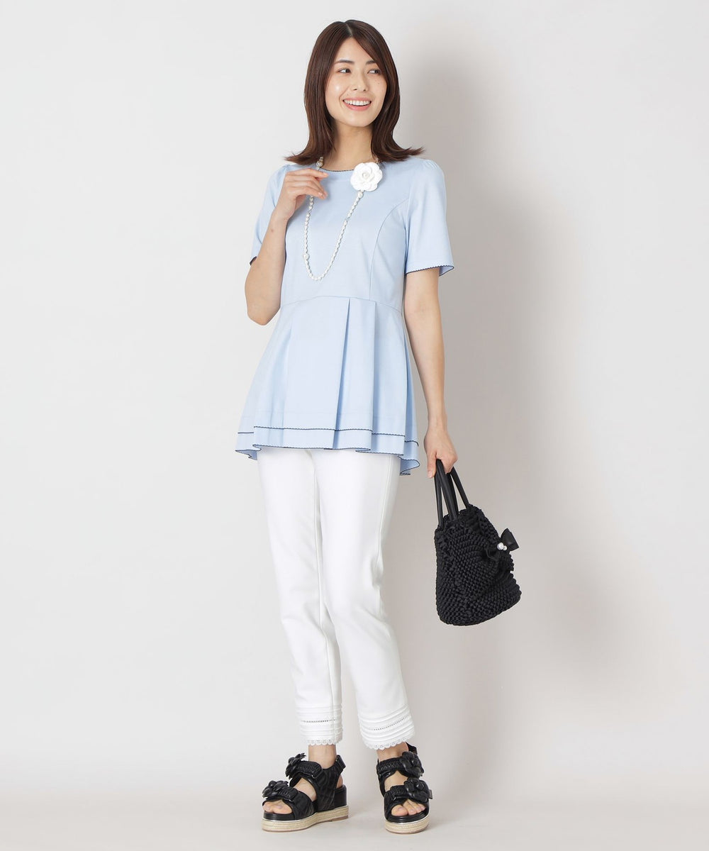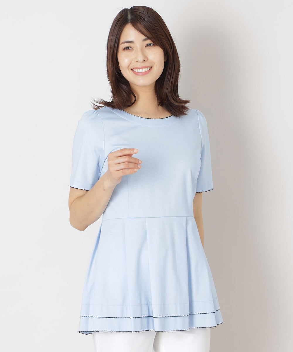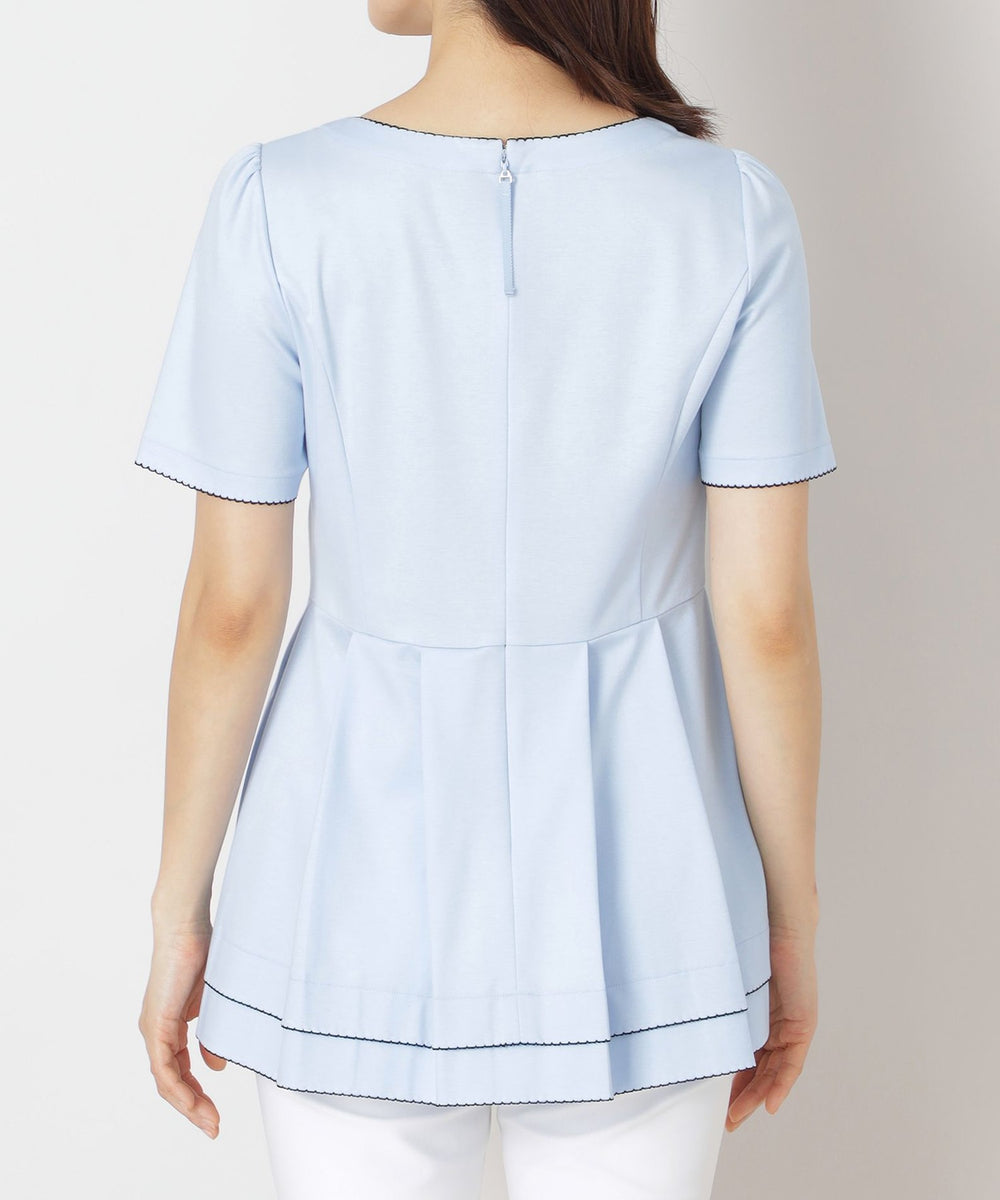 襟、袖口、裾に配色のピコ刺しゅうをあしらい、裾に2段のタックフレアを施したカットソーチュニックです。