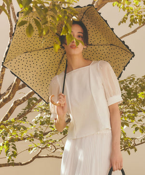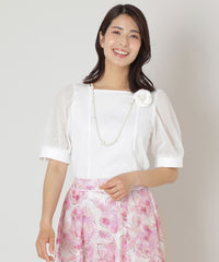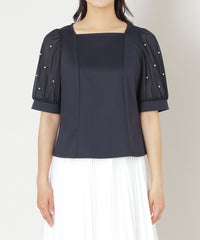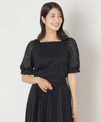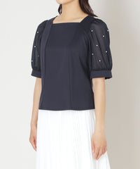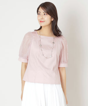 袖に繊細な別布を重ね、パールビジューをドットのように上品に散りばめることで、華やかさの中にも洗練された輝きをプラス。袖口にはカフスをあしらい、優雅な雰囲気に仕上げたエレガントなトップスです。