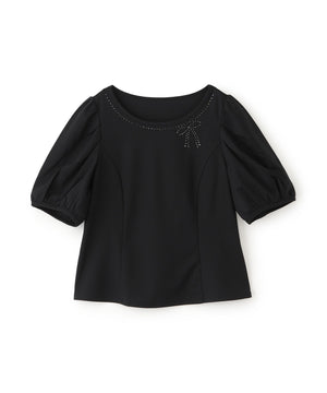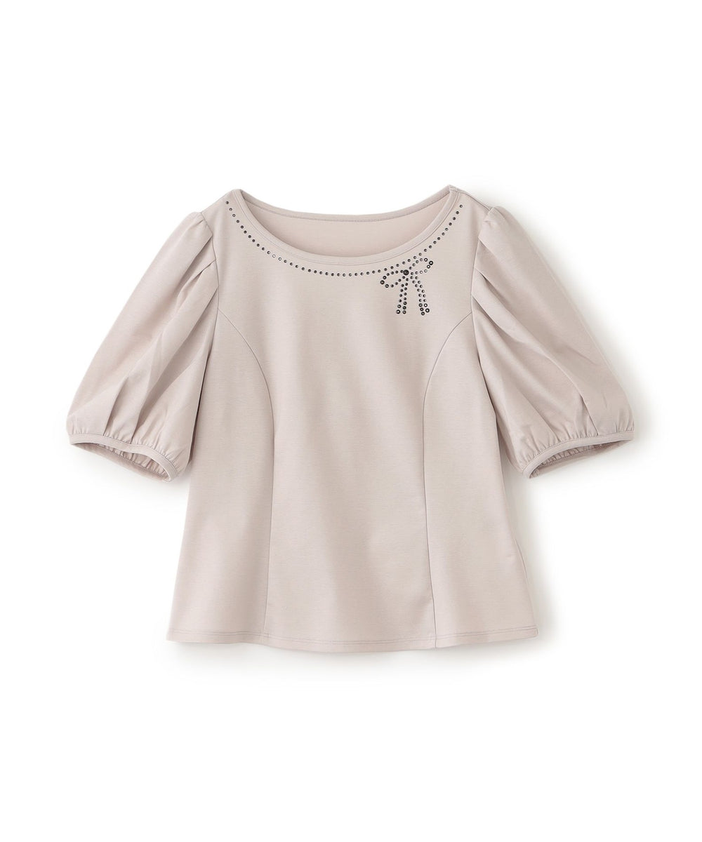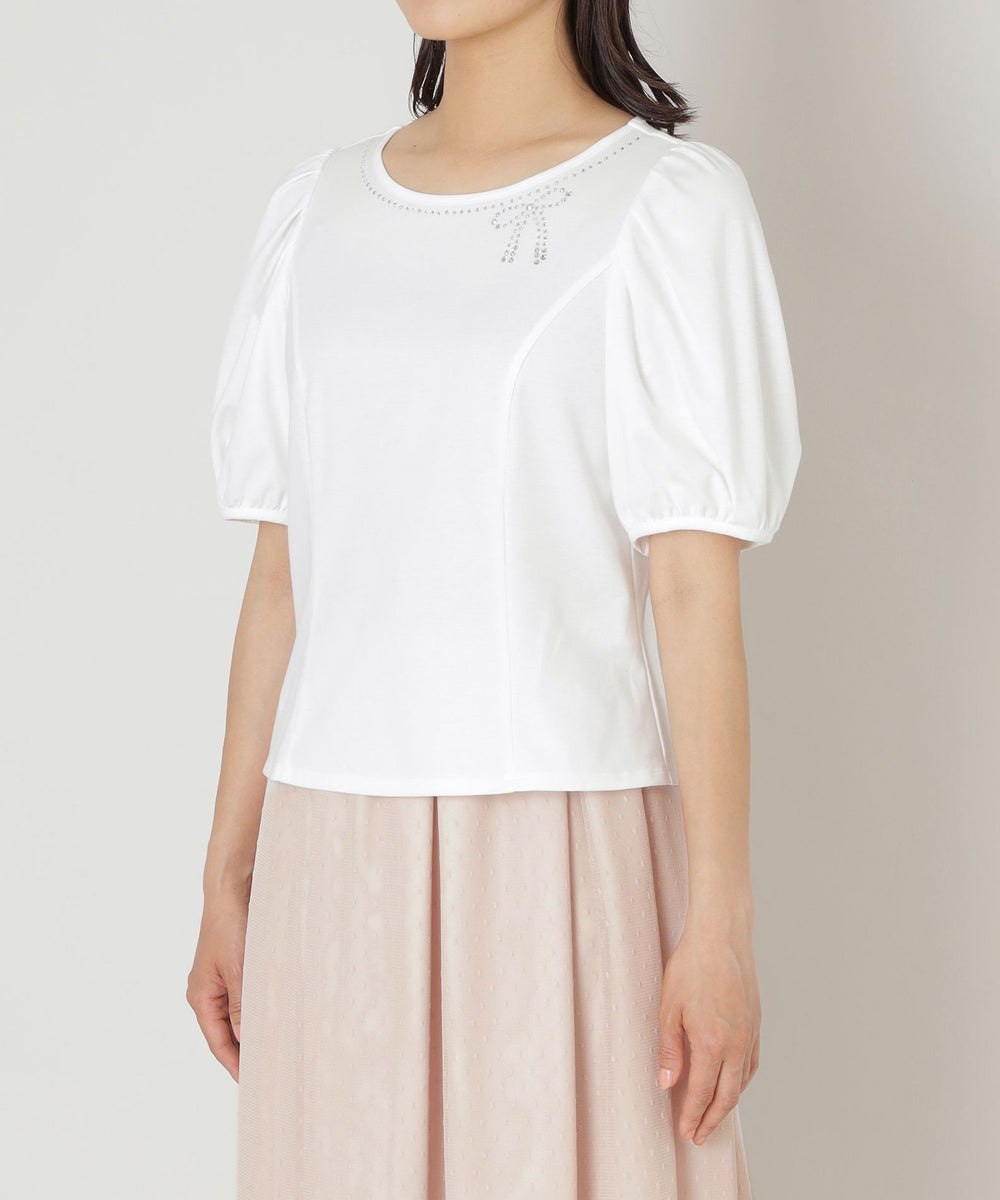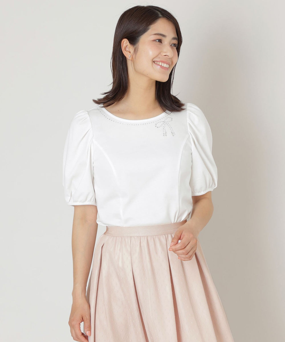 襟元にきらめくホットフィットをあしらった、リボンモチーフが印象的なトップスです。袖はギャザーパフとカフスで仕上げ、TO BE CHICらしい華やかさと可愛らしさをプラスしています。