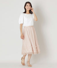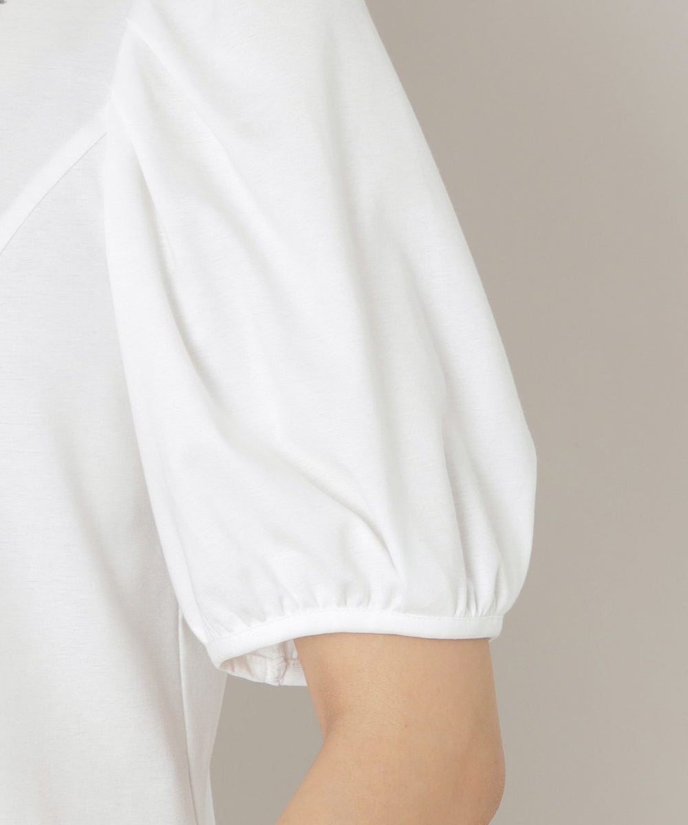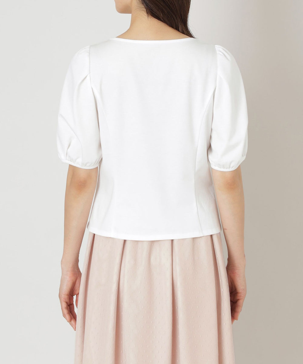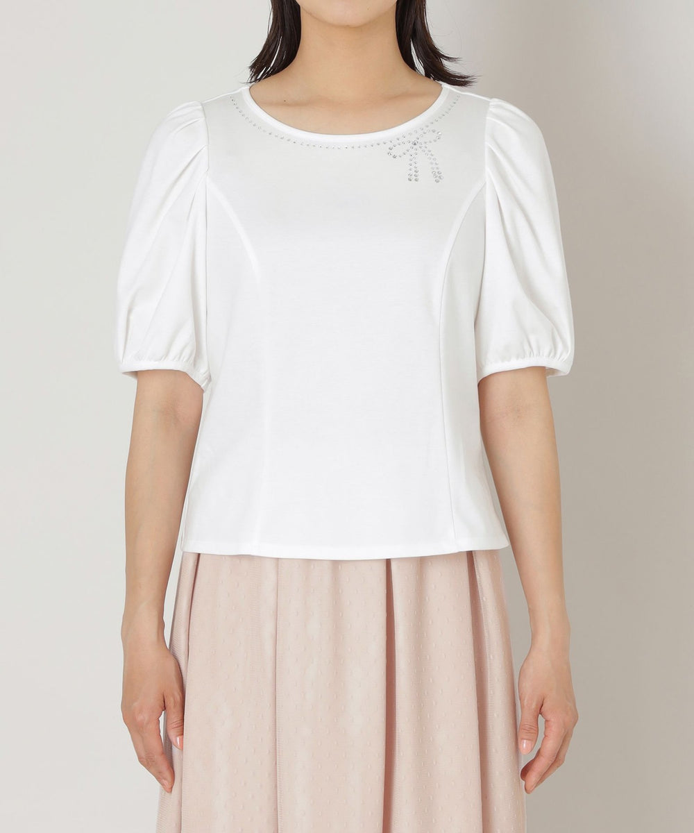 襟元にきらめくホットフィットをあしらった、リボンモチーフが印象的なトップスです。袖はギャザーパフとカフスで仕上げ、TO BE CHICらしい華やかさと可愛らしさをプラスしています。