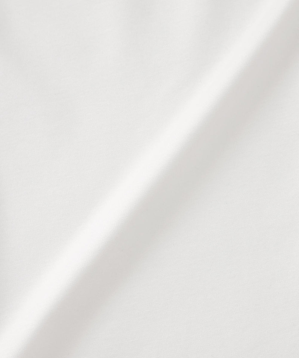 ハイゲージで編んでいるため、織物のようなきめ細やかな表情をしています。捲縮エステルを使用することで、伸縮のある生地になっています。加工では光沢を引き出すためシルケットとガス焼きを施し、毛羽を極限までカットしてドレープのきいた伸縮性のあるファブリックに仕上げています。