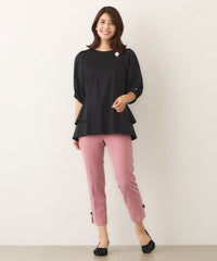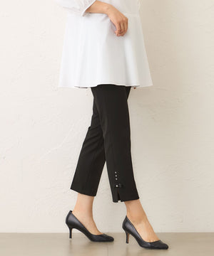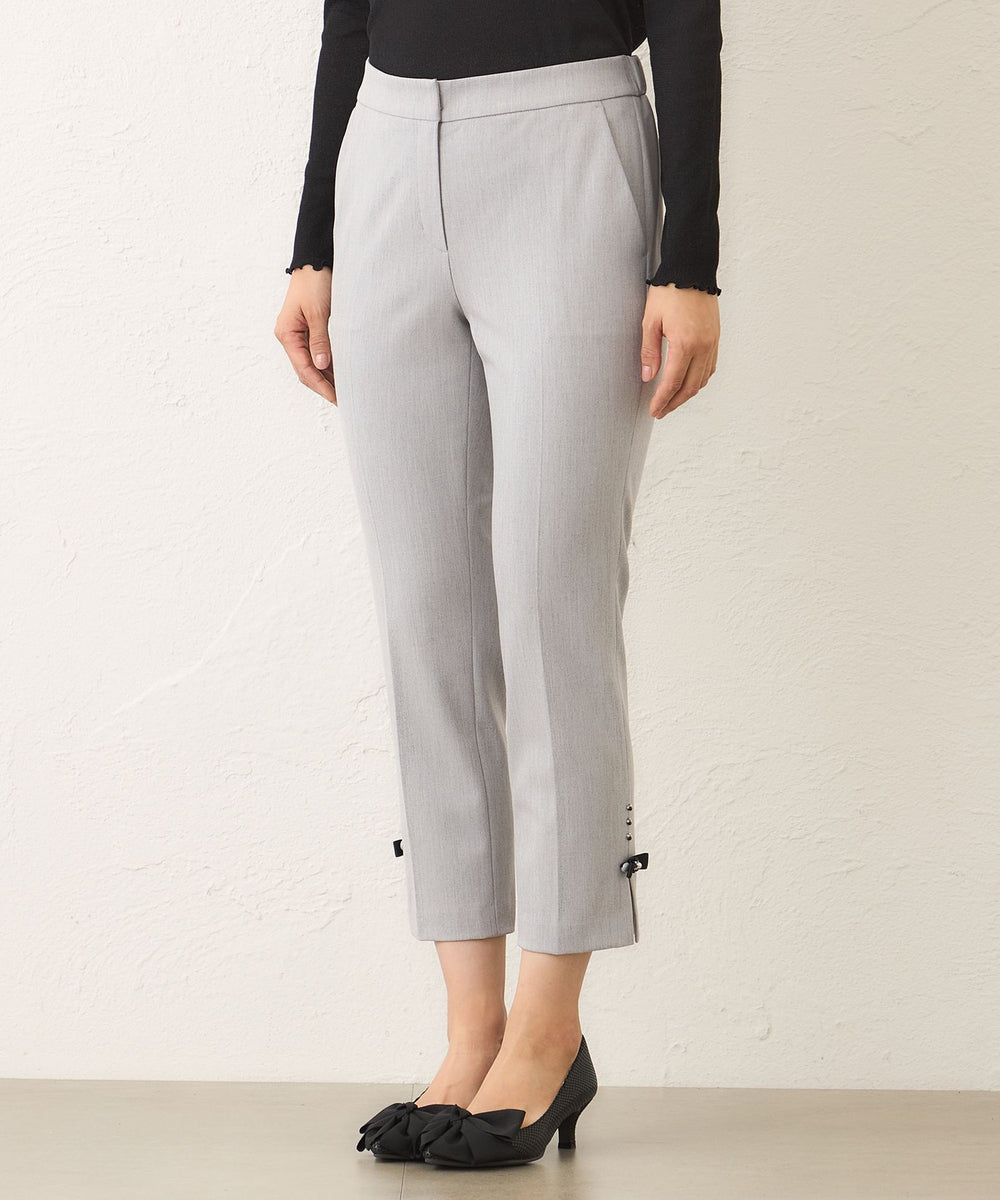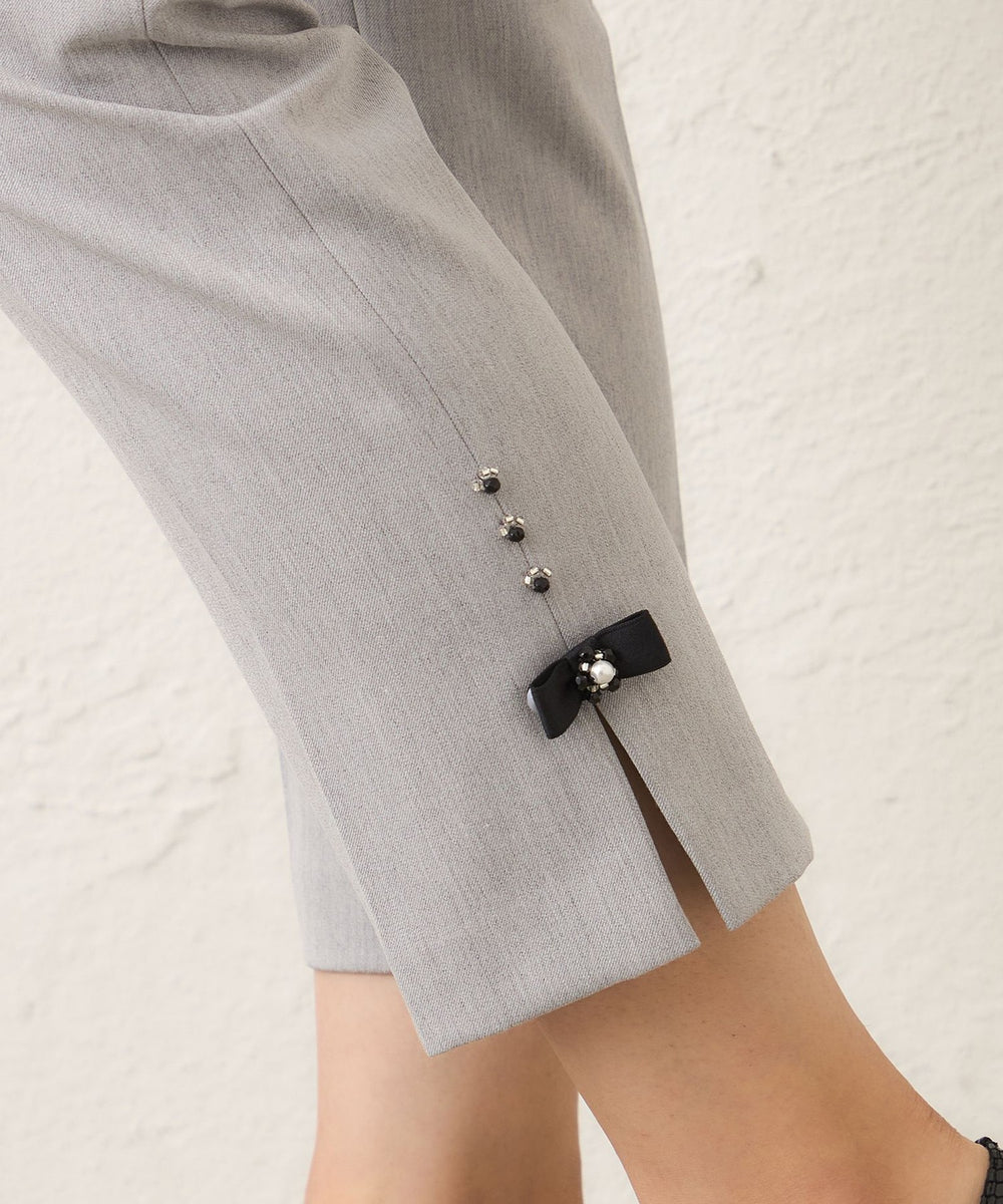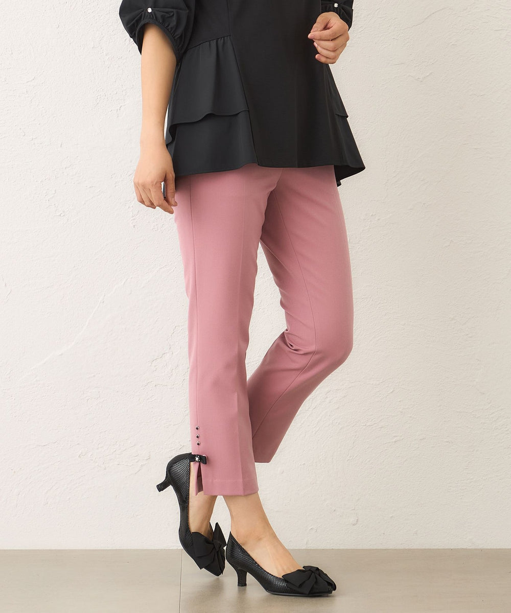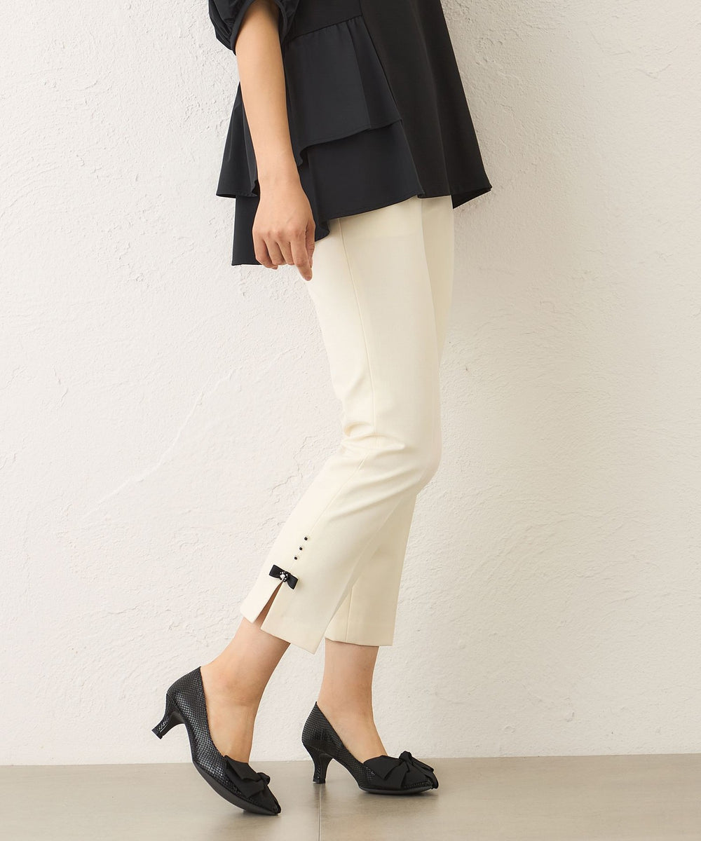 TO BE CHICの定番型パンツです。後ろの股上がしっかりあるので、しゃがんでも下着が見えにくいパターンになっています。センタープレス入りで細く見えるスッキリとしたシルエットです。裾のモチーフは取り外し可能です。