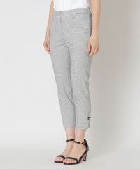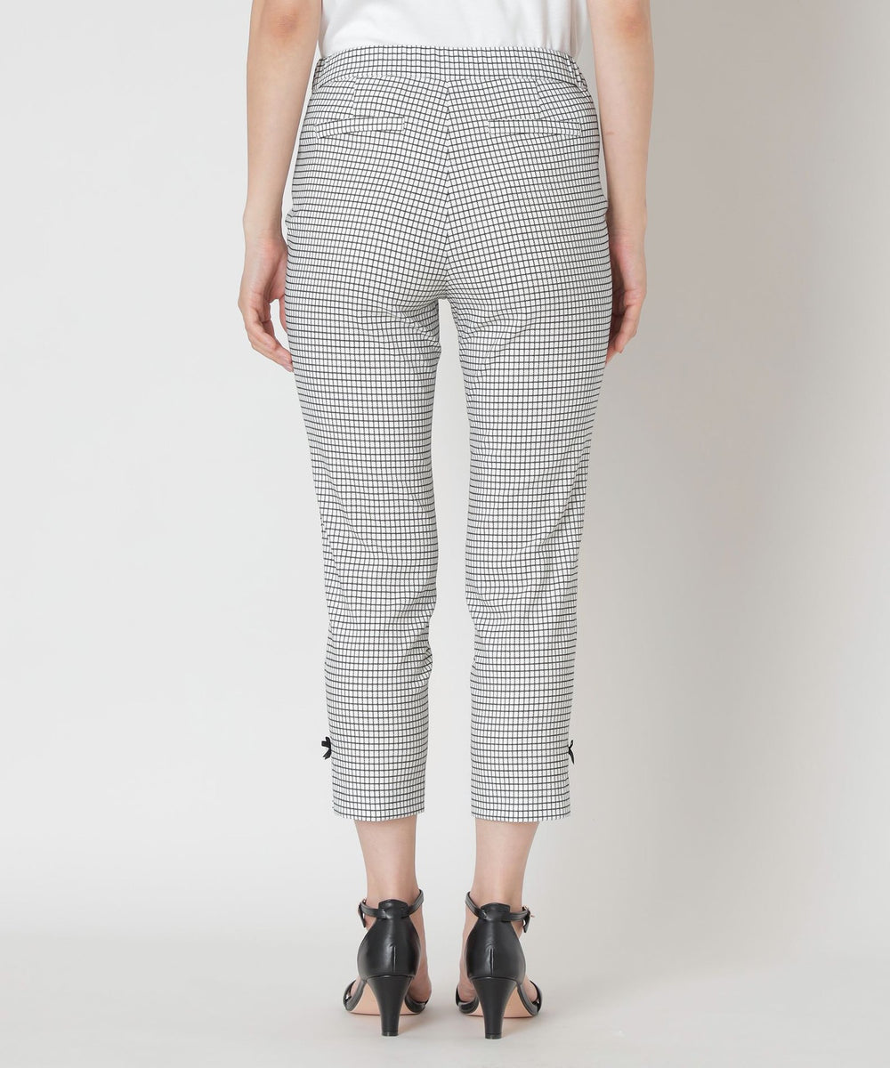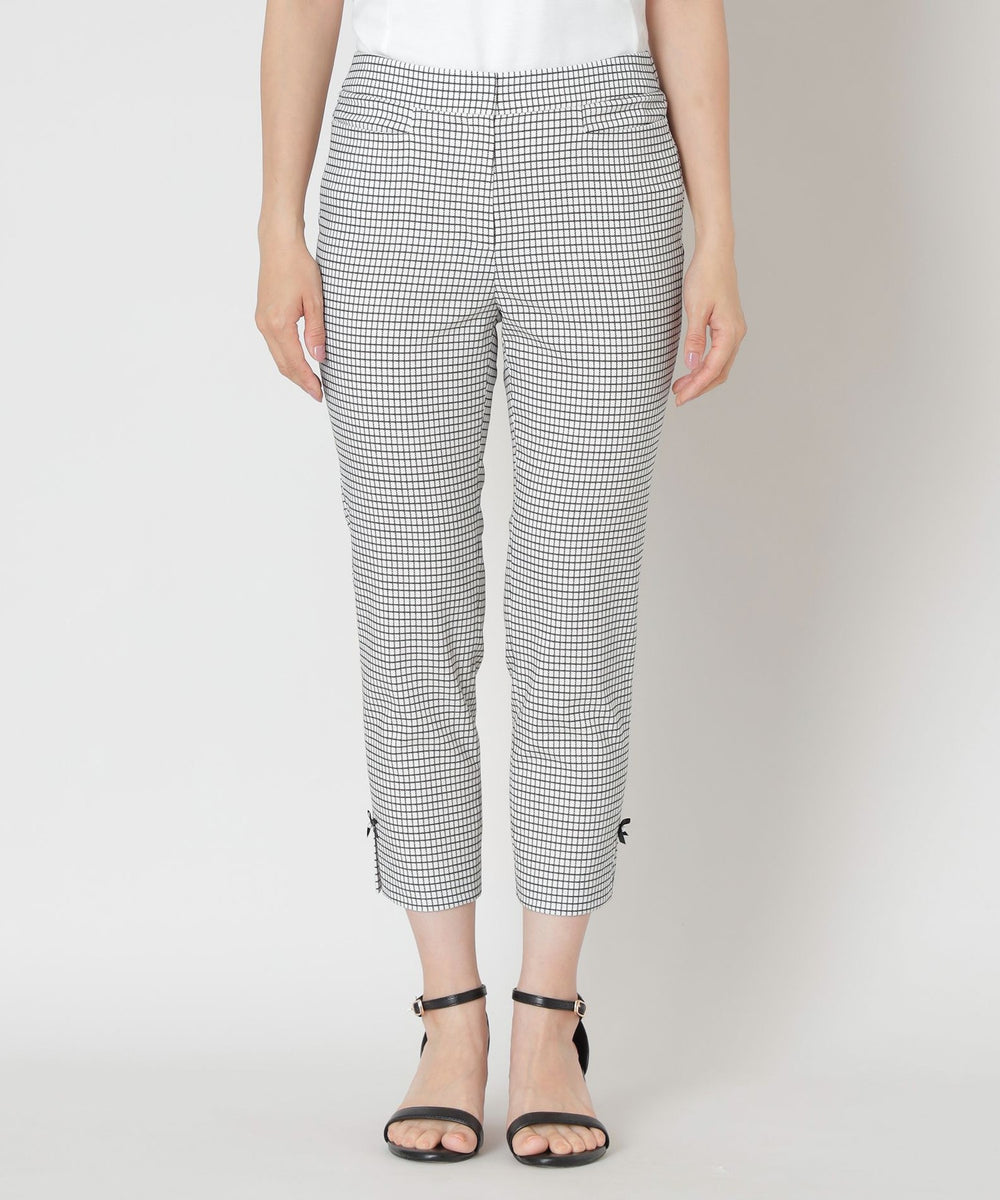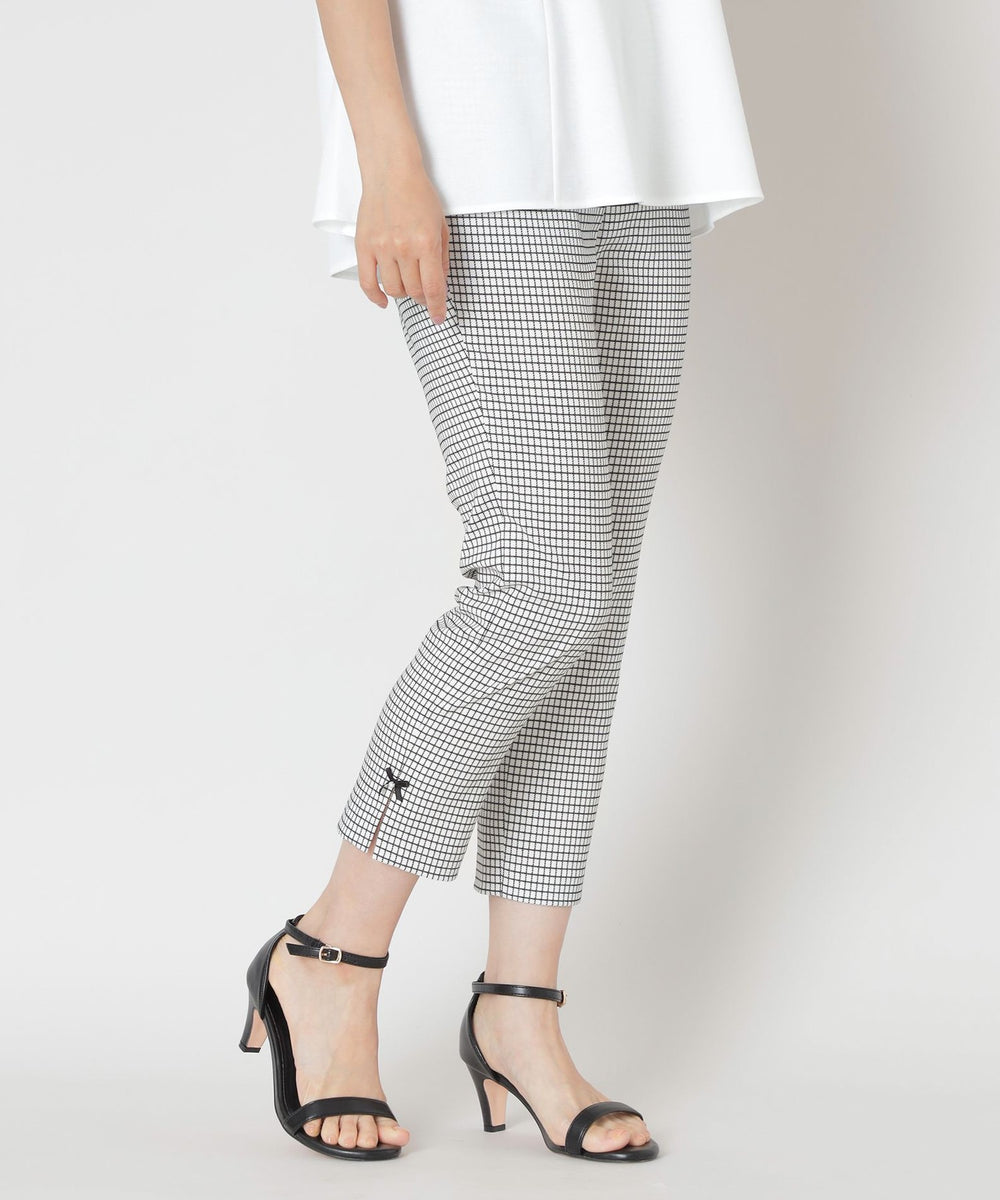 定番のスリムパンツシルエットに、上品なウインドウペンチェック柄を載せたスタイリッシュな一本。裾のスリットには、ブラックのリボンとパールビジューをあしらい、足元にさりげない華やかさを添えました。細部にまでこだわったエレガントな印象のパンツです。