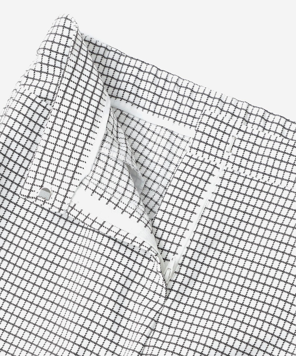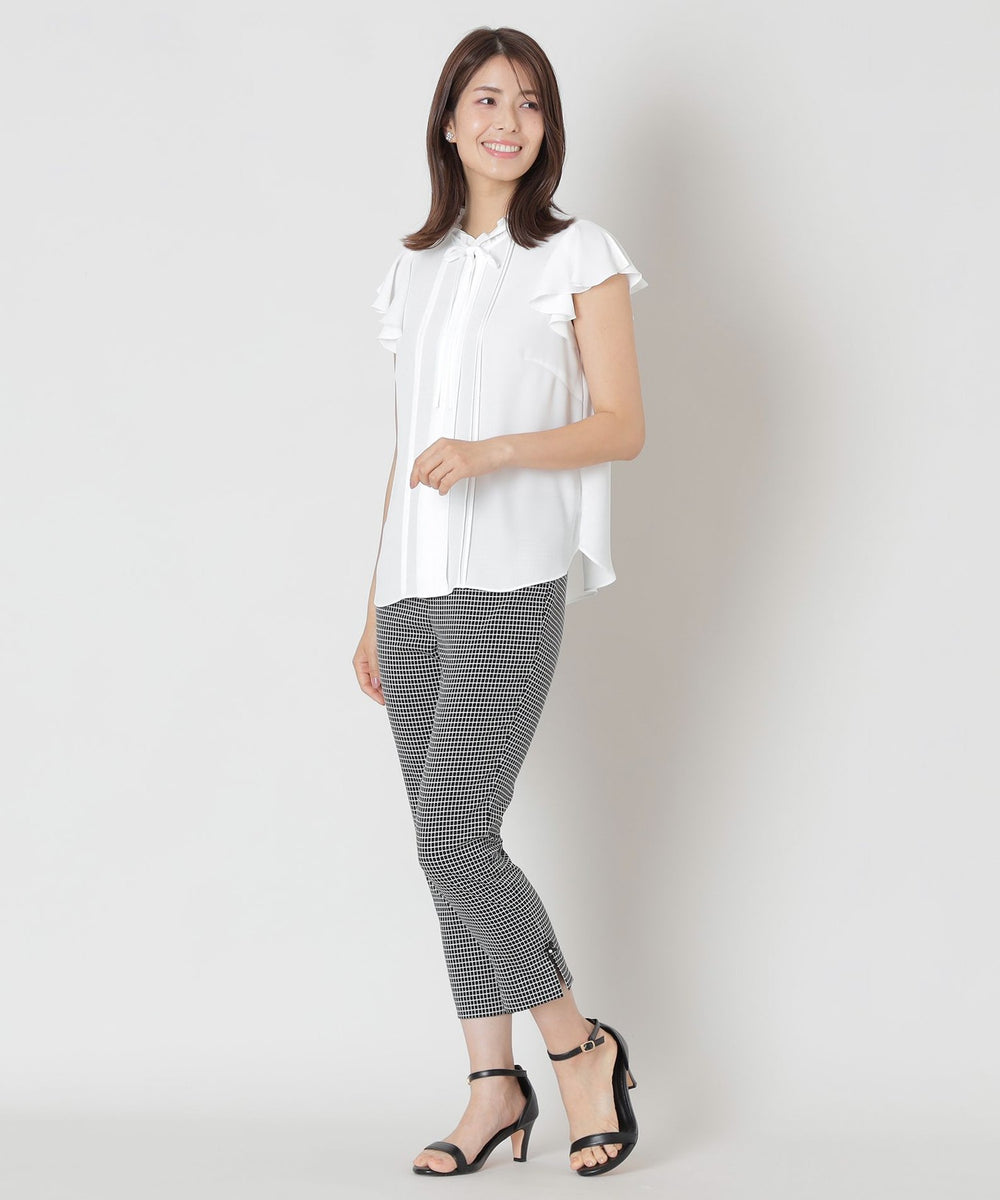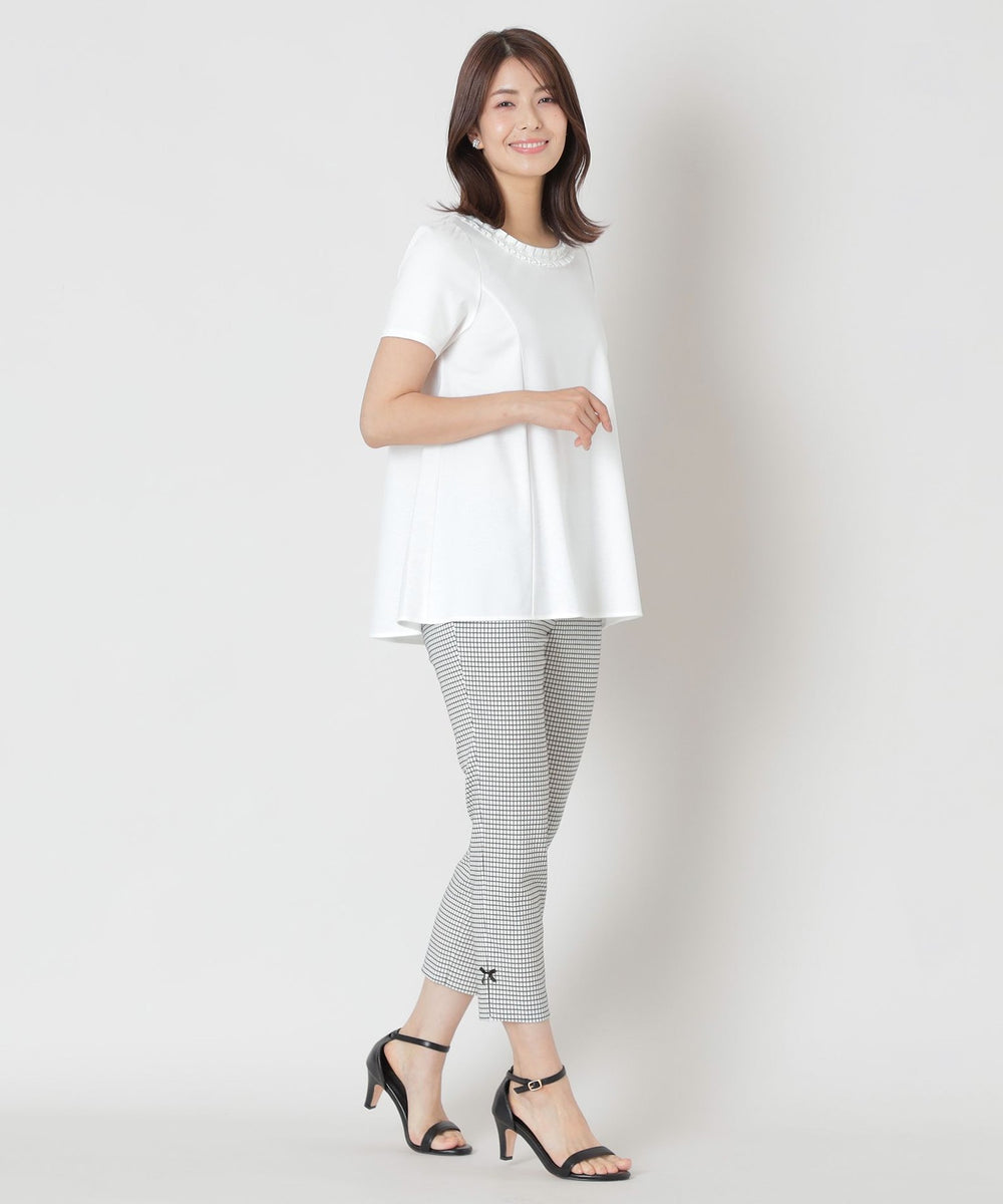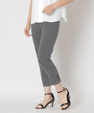 定番のスリムパンツシルエットに、上品なウインドウペンチェック柄を載せたスタイリッシュな一本。裾のスリットには、ブラックのリボンとパールビジューをあしらい、足元にさりげない華やかさを添えました。細部にまでこだわったエレガントな印象のパンツです。