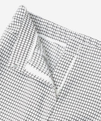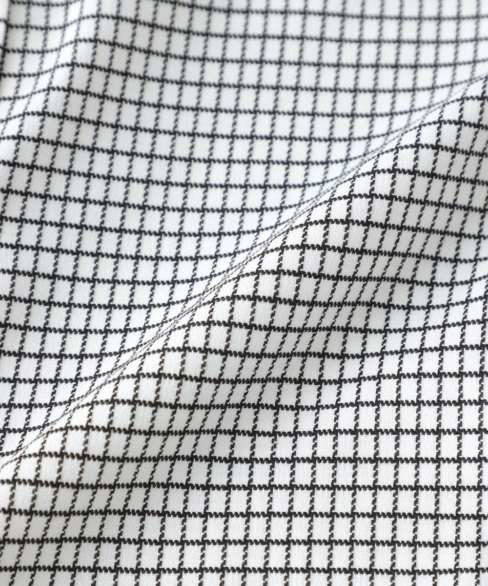尾州産地にてオリジナル開発した、高級感漂うファブリック。タテ・ヨコに40/2のポリエステルレーヨン混紡糸を使用し、先染めで表現されたモノトーンの繊細なウインドウペン柄が、上品で知的な印象を演出します。ベースには平織組織を採用しながら、ウインドウペン部分にはドビー組織を取り入れ、さりげない立体感を生み出すことで、素材の奥行きと表情を高めています。さらに、ヨコ糸にポリウレタンを撚糸したストレッチ糸を配し、快適な着用感をプラスした拘りの素材です。