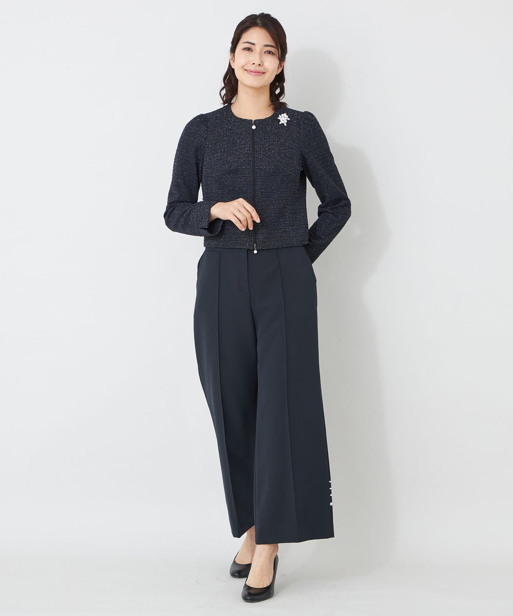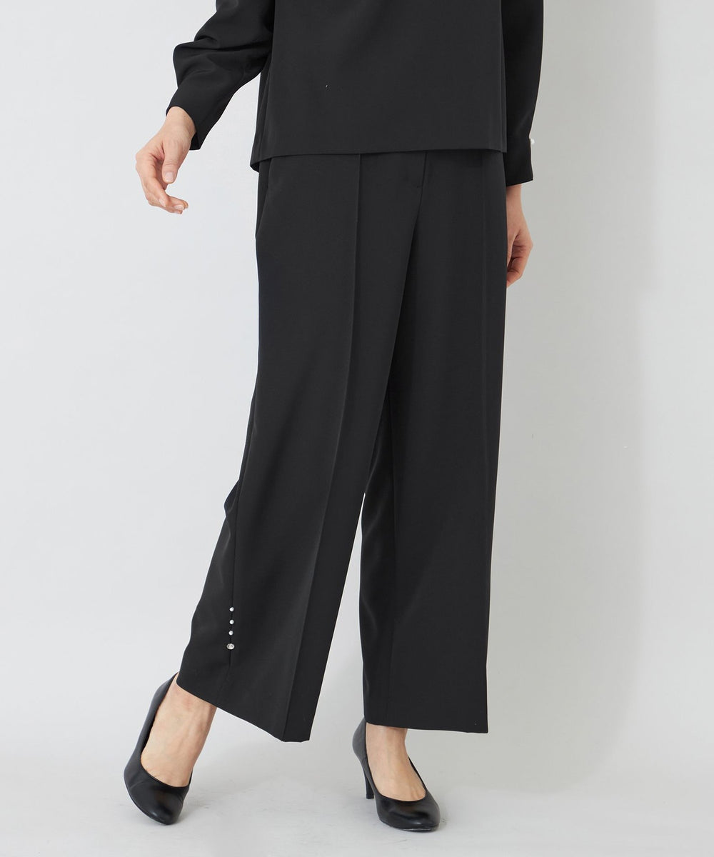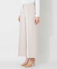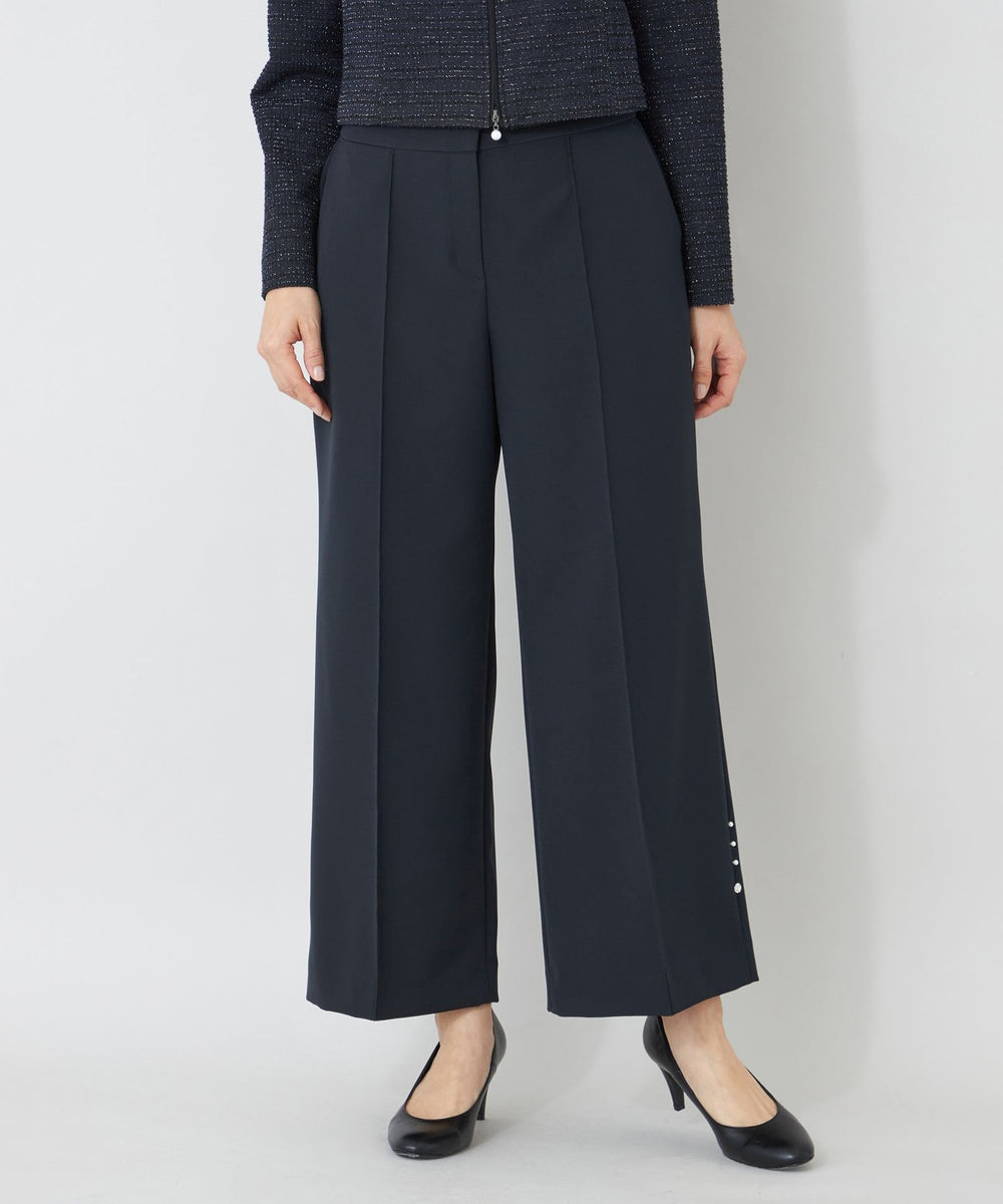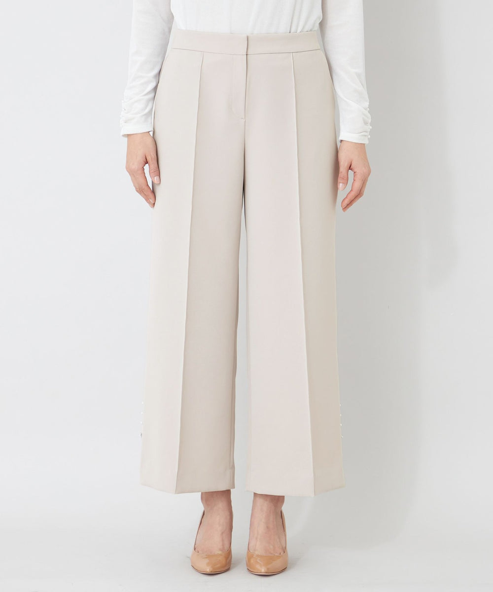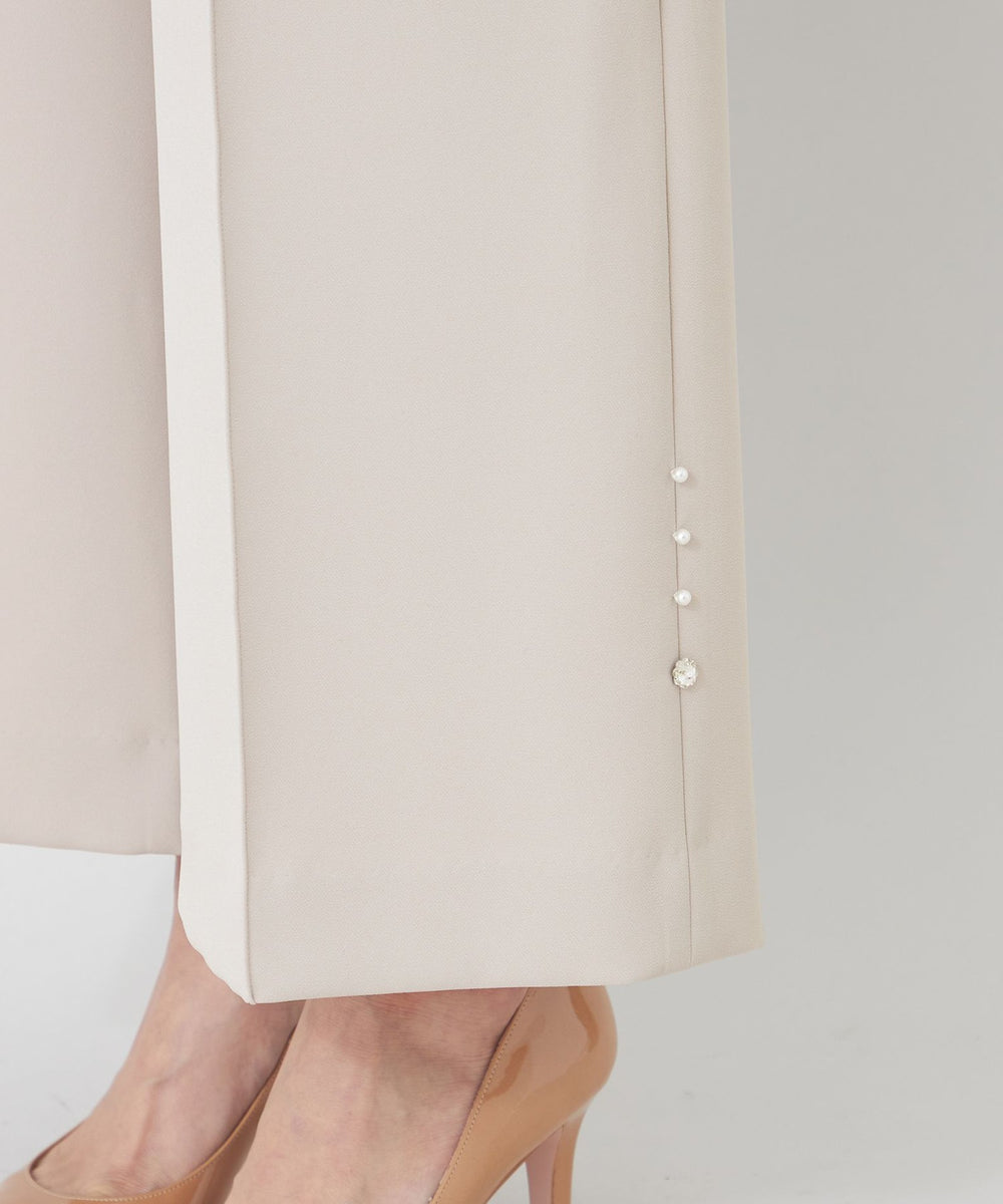 フロントにセンターつまみピンタックを施し、縦のラインを強調することで脚長効果を演出しています。ノータック仕様で腰まわりがすっきりと見える、上品なワイドパンツです。裾の脇にはパールとラインストーンのビジューパーツを施し、さりげない華やかさを添えています。