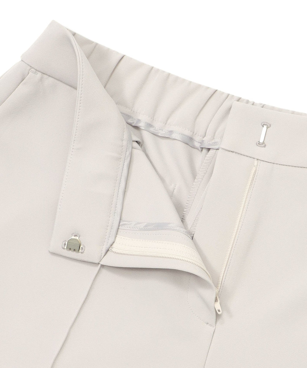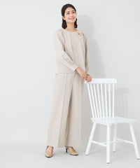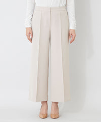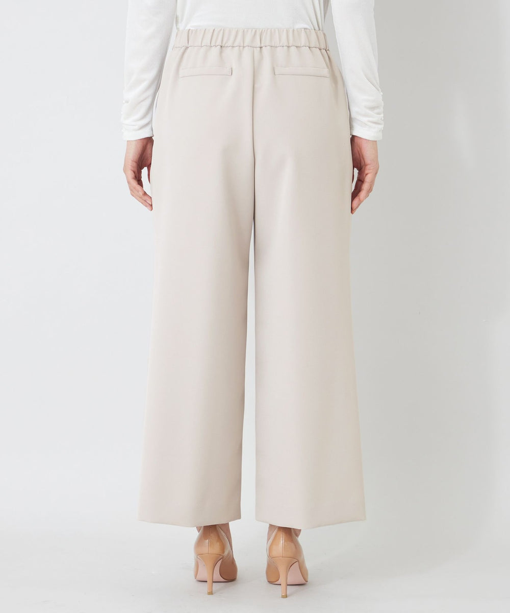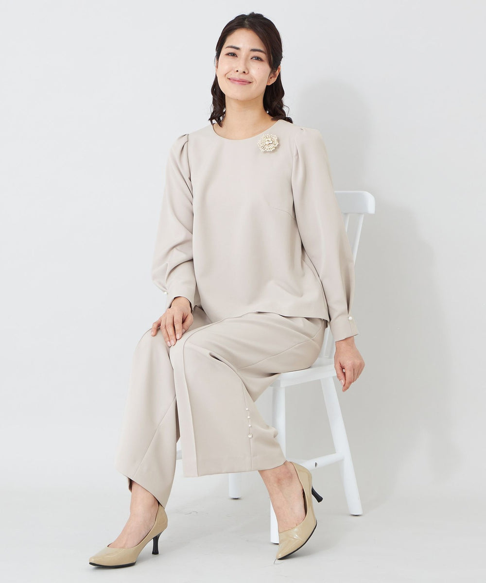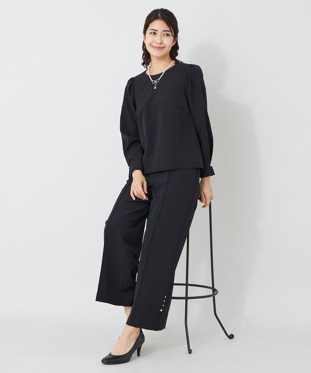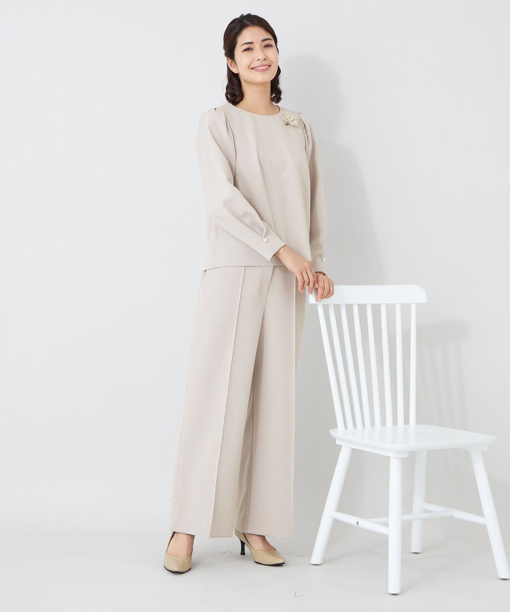 フロントにセンターつまみピンタックを施し、縦のラインを強調することで脚長効果を演出しています。ノータック仕様で腰まわりがすっきりと見える、上品なワイドパンツです。裾の脇にはパールとラインストーンのビジューパーツを施し、さりげない華やかさを添えています。