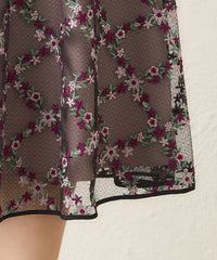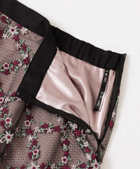 フラワーチェック刺しゅうの美しさを最大限に活かすため、切り替えを入れずに仕立てたフレアスカート。刺繍の華やかさが際立つ、シンプルながらも存在感のあるデザイン。ウエストにはグログランテープを使用し、内側にゴムを配することで、快適なフィット感を実現。後ろウエスト部分にはギャザーを寄せ、程よい伸縮性を持たせることで、見た目の美しさと着心地の良さを両立しています。