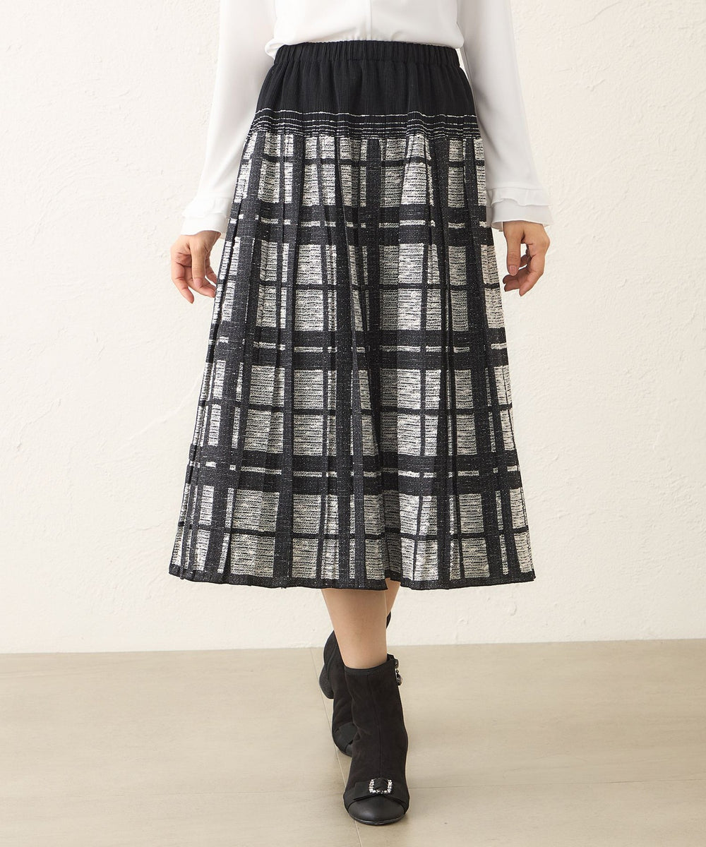 ウエストはゴム仕様で伸縮性があり、快適な着心地を実現。お腹周りには細かいプリーツを施すことで、すっきりとした印象に仕上げました。裾に向かって広がる華やかなシルエットが、全体のバランスを美しく引き立てます。