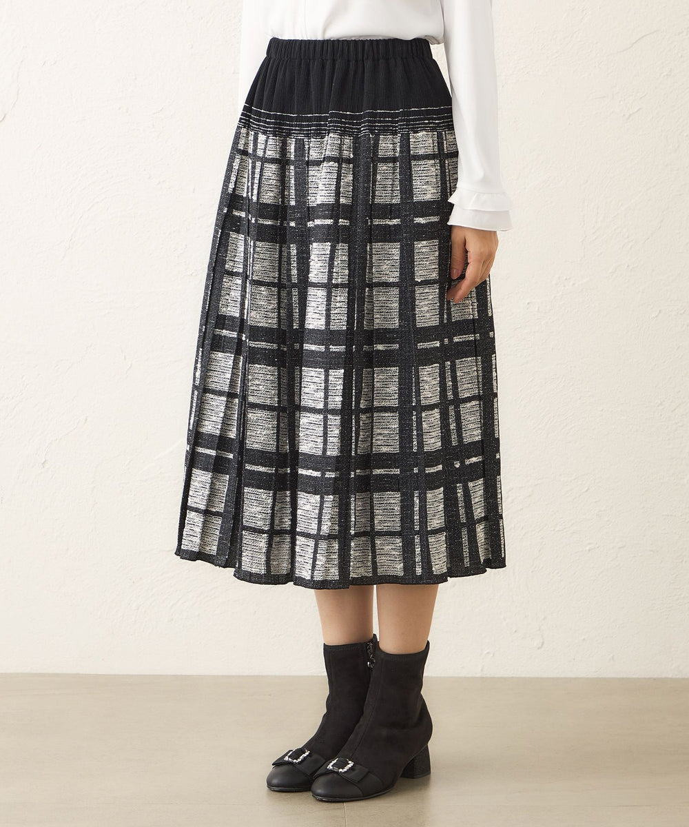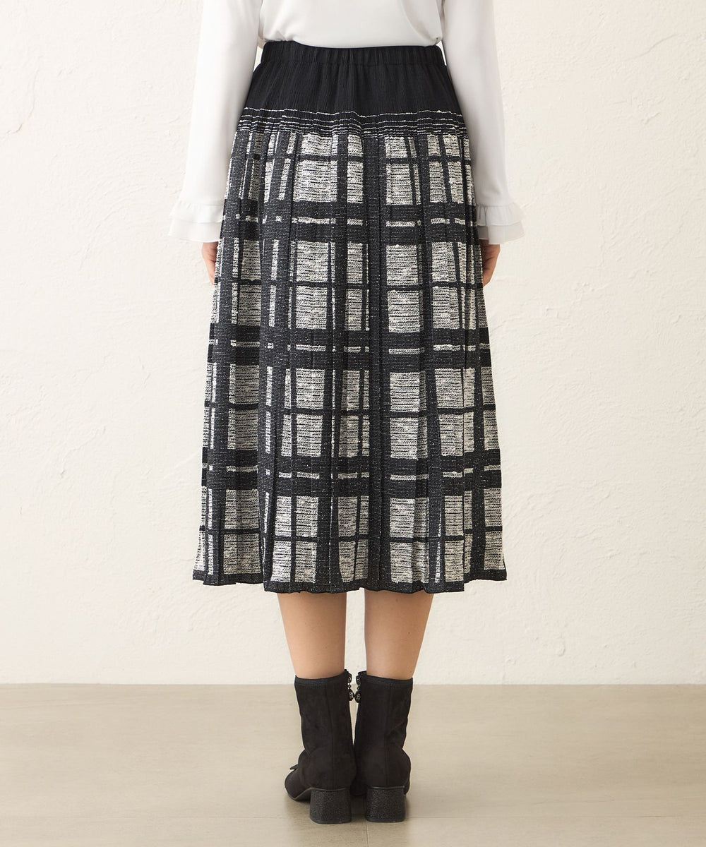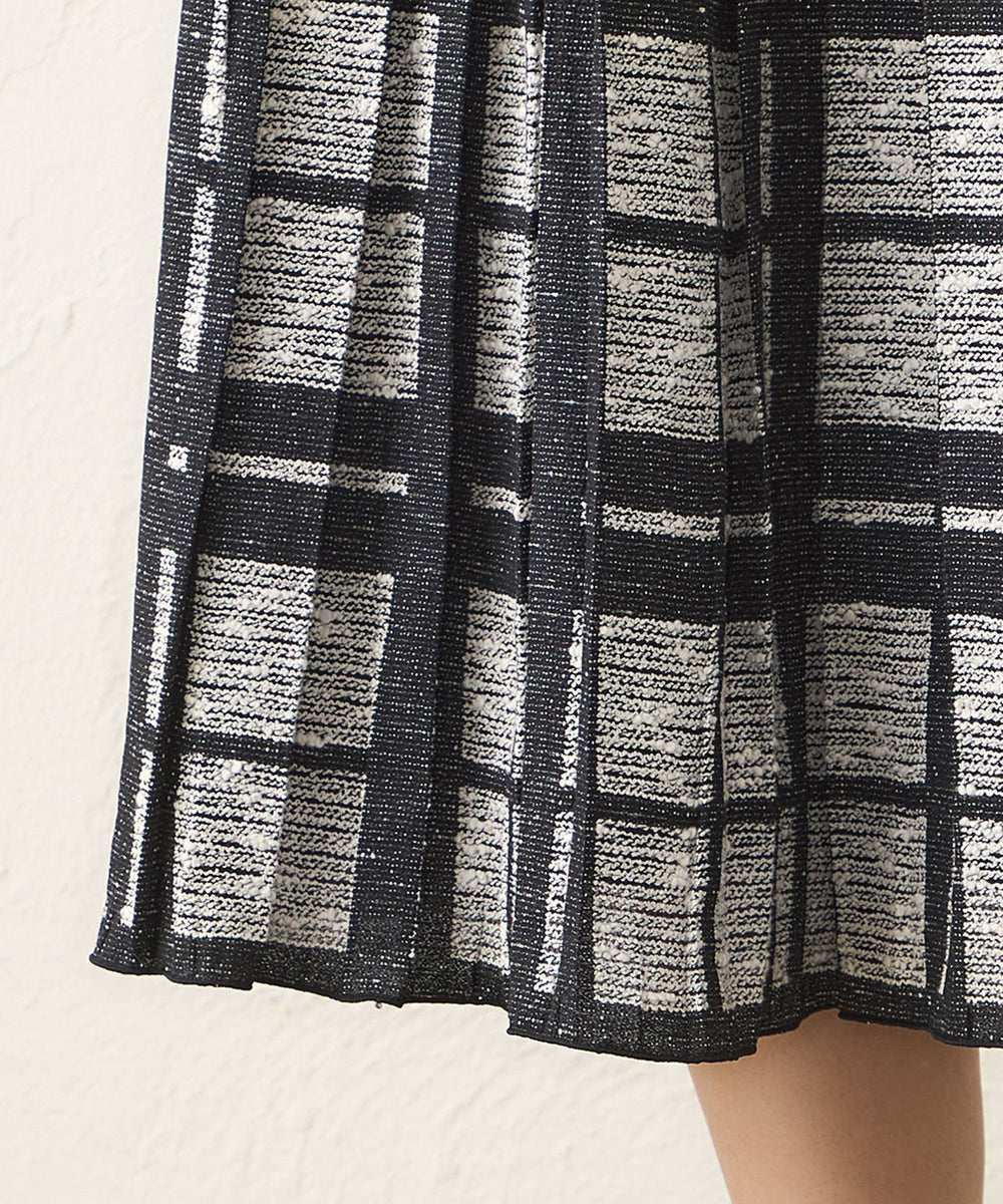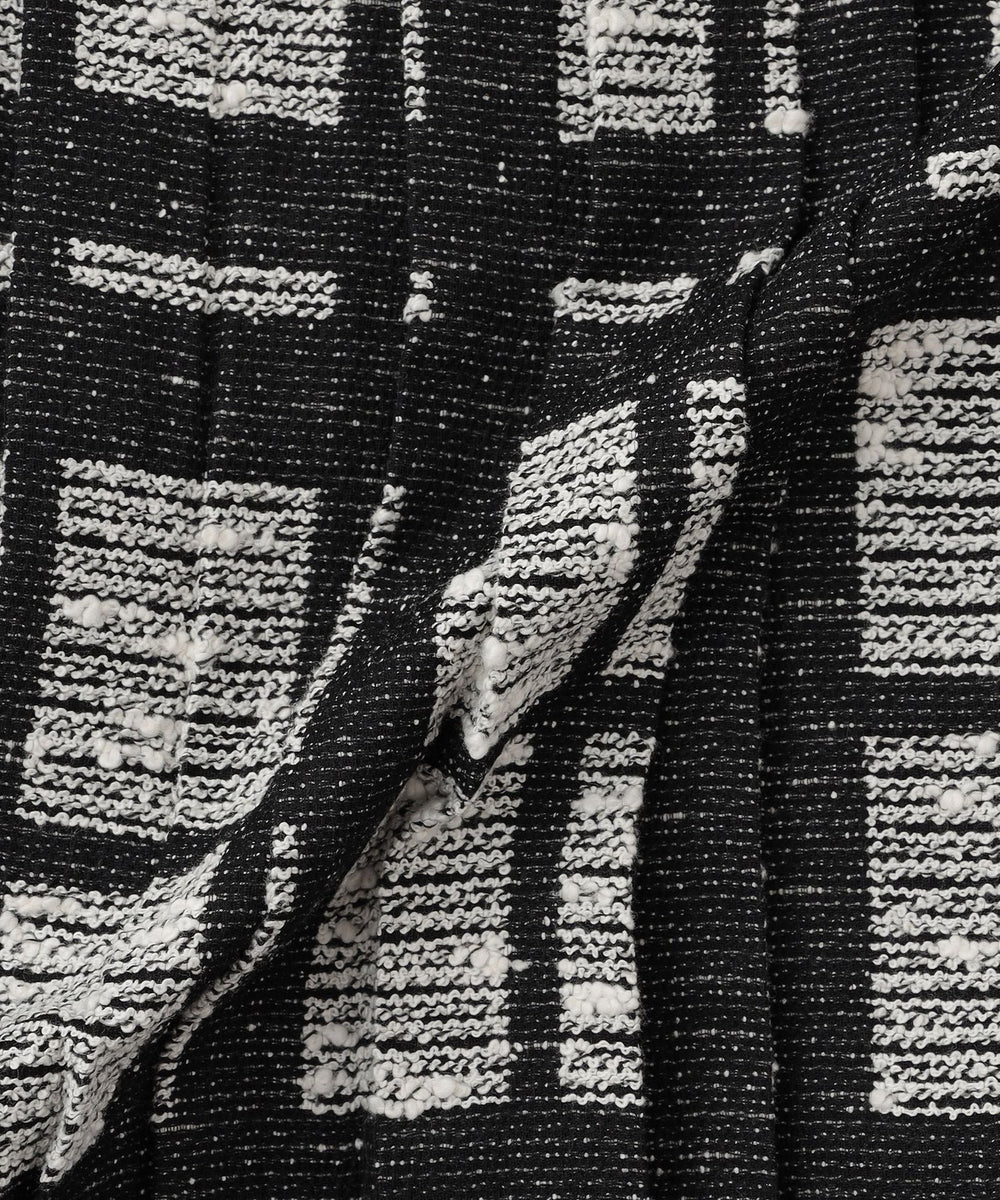 2種類の意匠糸を使用してチェック柄を表現したツイード調素材は、レーヨン糸を組み合わせることで、柔らかさと美しい落ち感を実現。上品でありながら、動きのある表情が魅力です。さらに、ジャカード織機の技術を活かし、部分的にポリウレタン糸(ゴム)をヨコ糸として織り込むことで、ゴムシャーリングを表現。その部分だけを自然に絞り、立体感とフィット感を生み出しています。