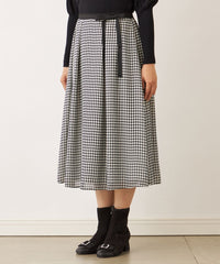 イレギュラータックを施したスカート。落ち感のある素材を使用しているため、広がりすぎず、歩くたびに裾が揺れる美しいシルエットに仕上げました。合成繊維素材のためシワになりにくく、お手入れも簡単。共布のリボンは取り外し可能で、スタイリングの幅が広がります。