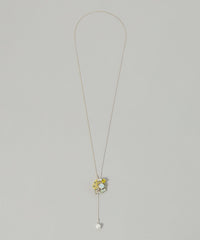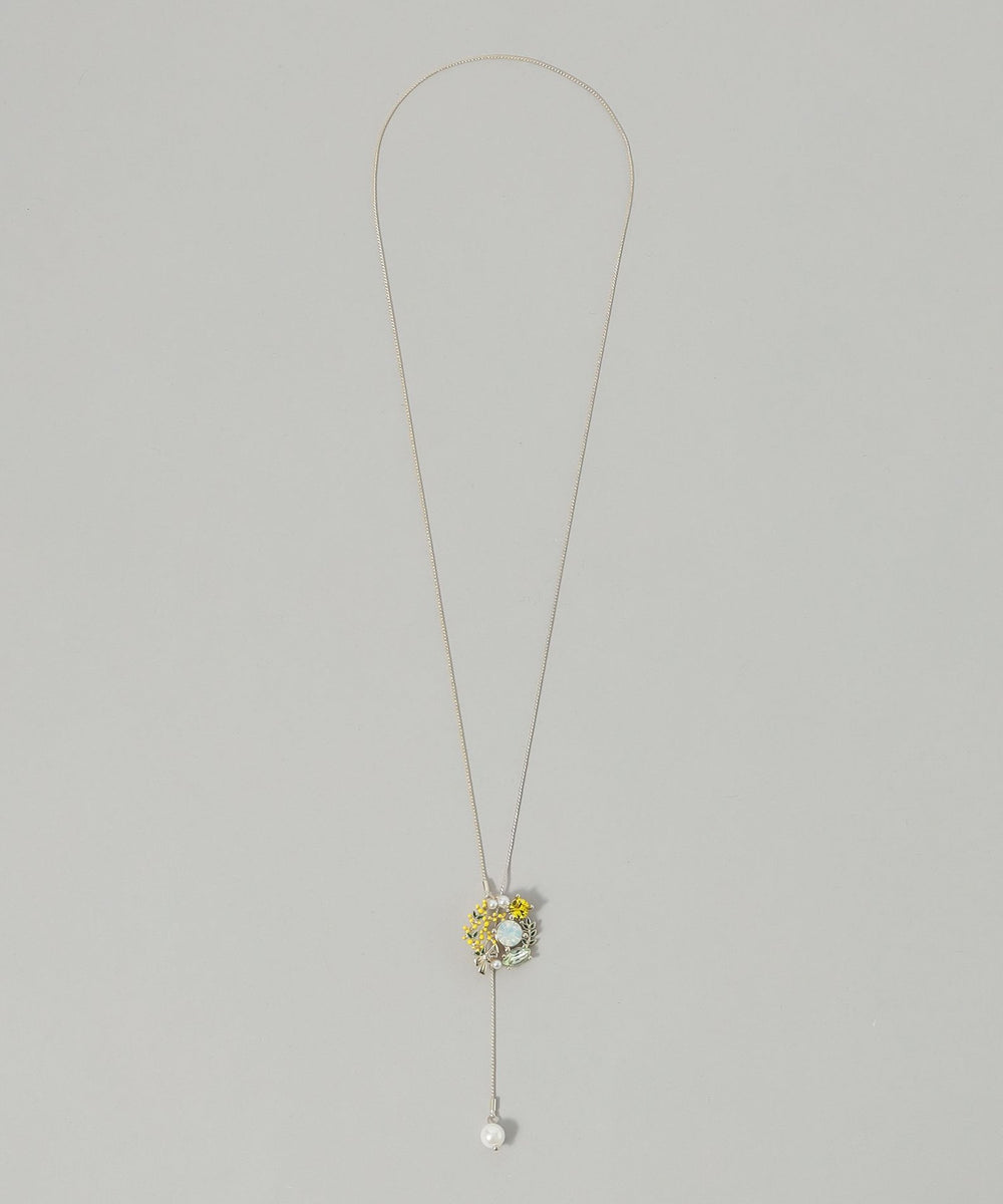 サイドから中心にかけてミモザに模したフラワーブーケを配置して、リボンやビジューで華やかに彩ったスライドタイプのネックレス。スライドしてパーツを異動してお好みの位置で着用していただけます。