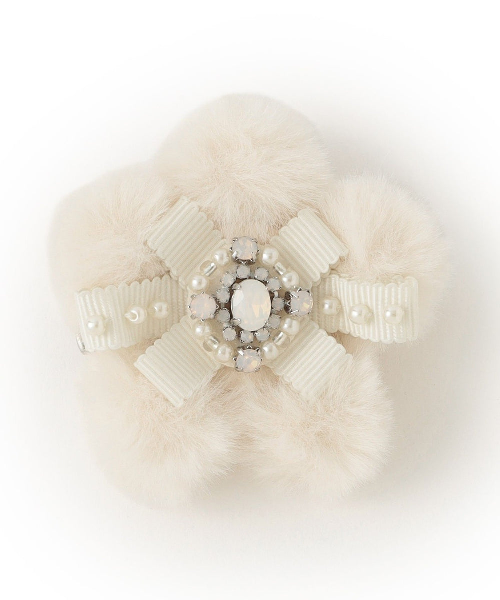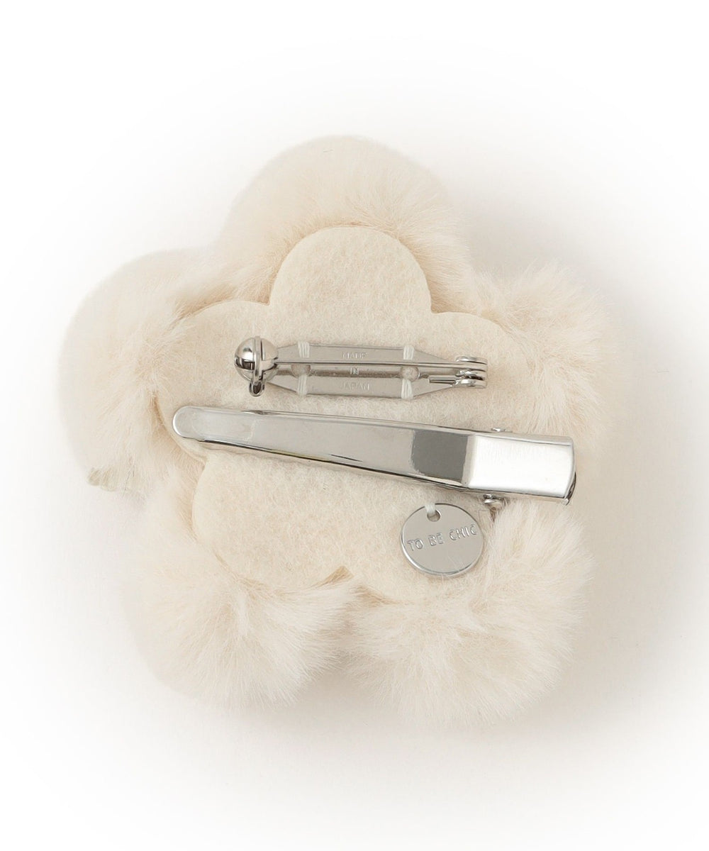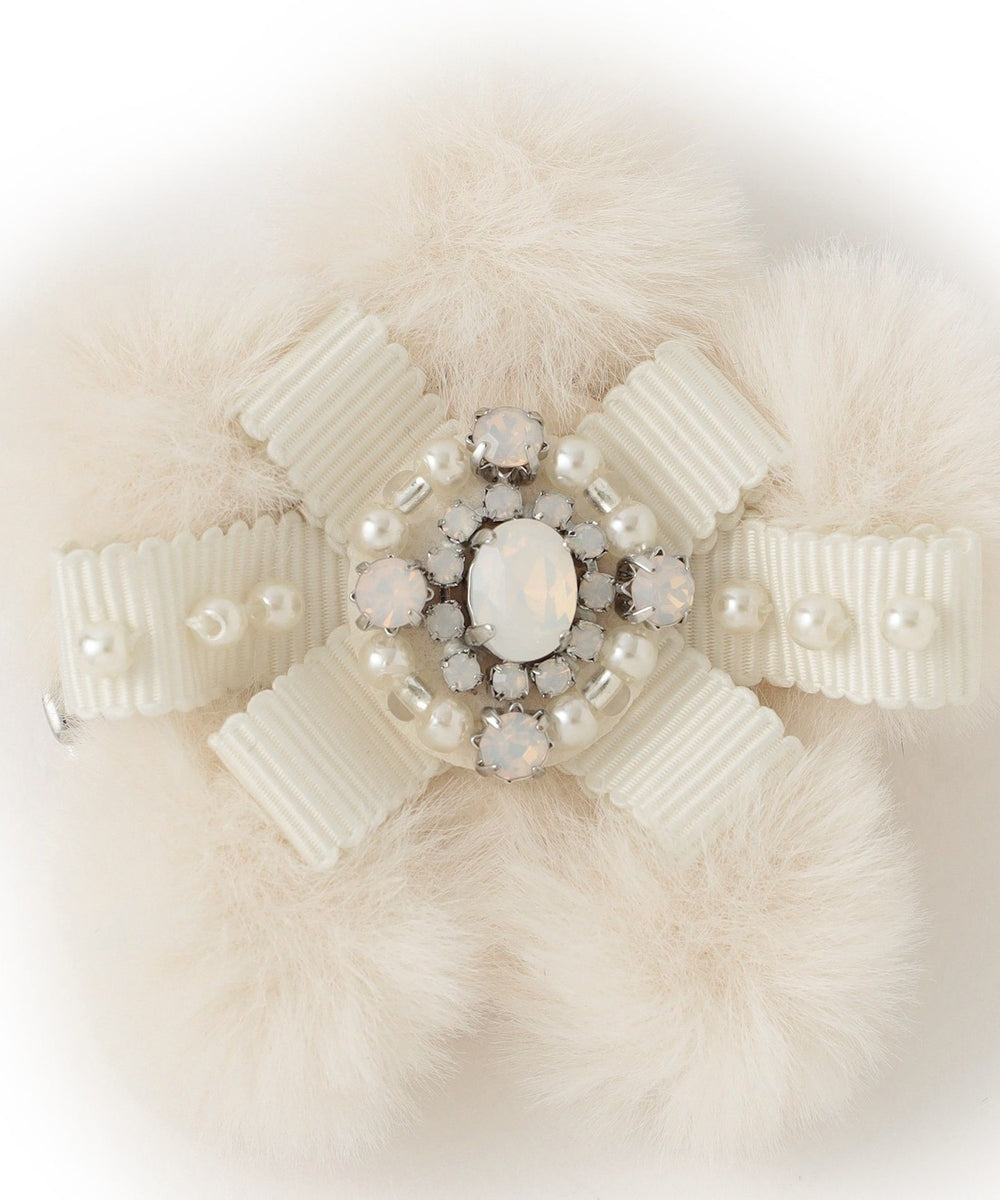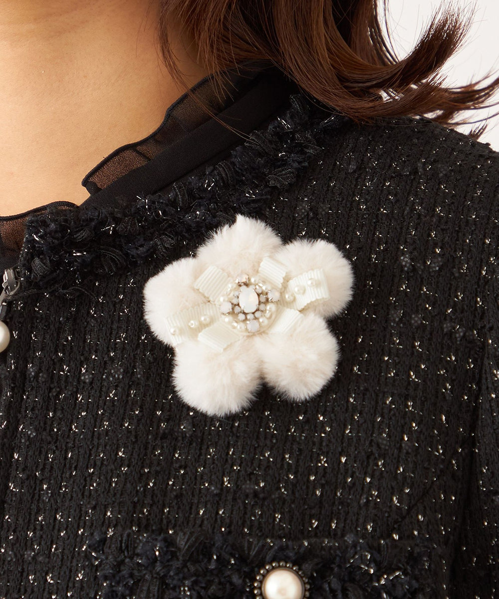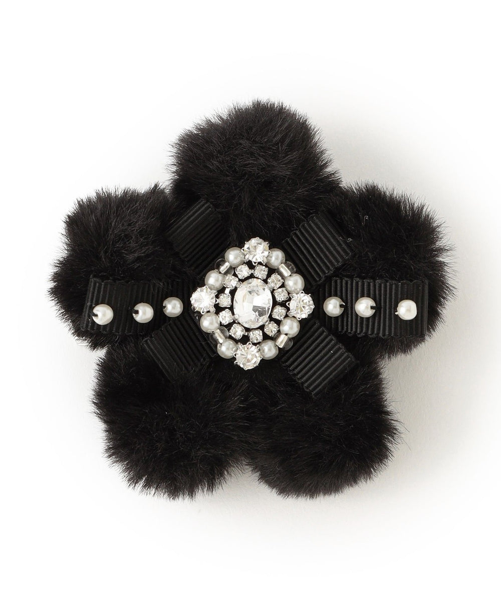 秋冬のルックにマッチするふわふわ可愛らしいフェイクファーブローチ。中心にはグログランテープをベースに、ビジュー・パール調パーツ・ビーズをミックスしたモチーフは手仕事が光ります。ニットトップスのアクセントに、アウターにも合わせて2個付けもなどもおたのしみいただけます。