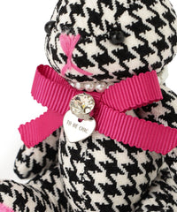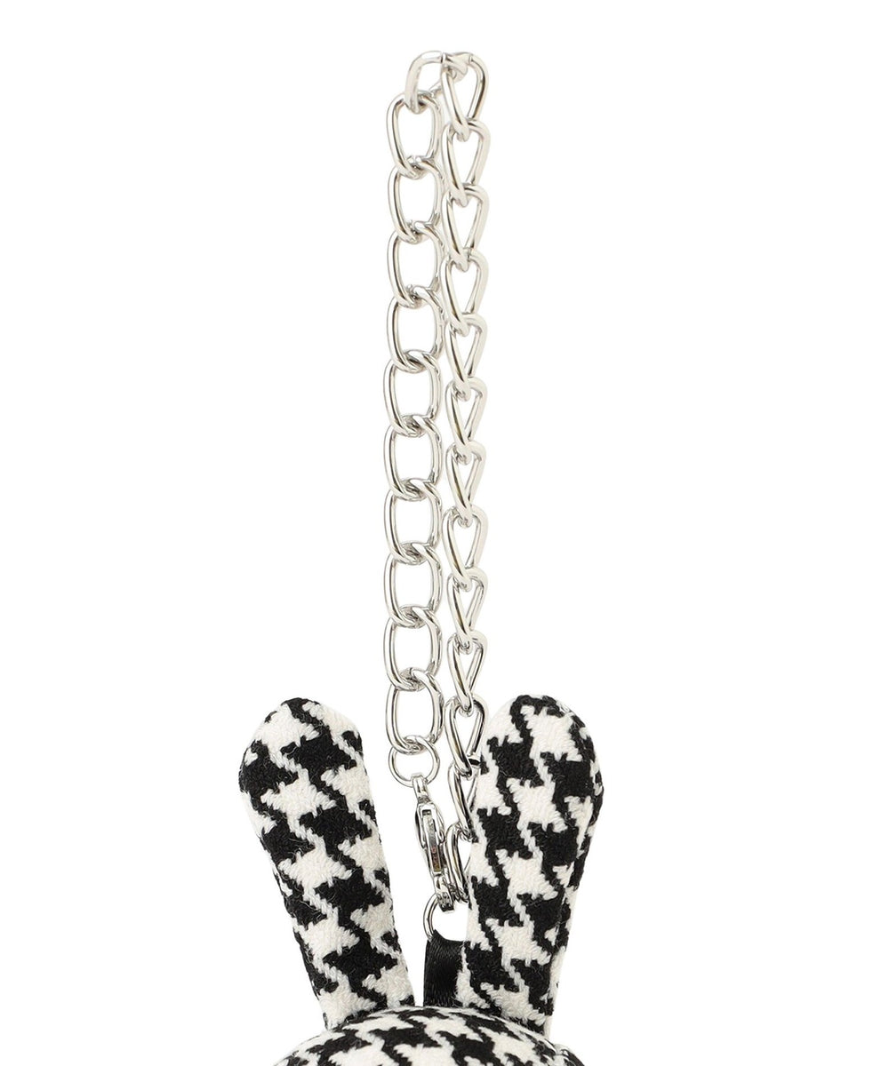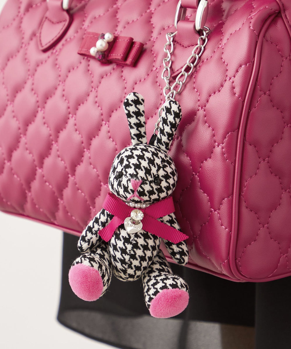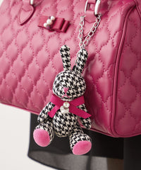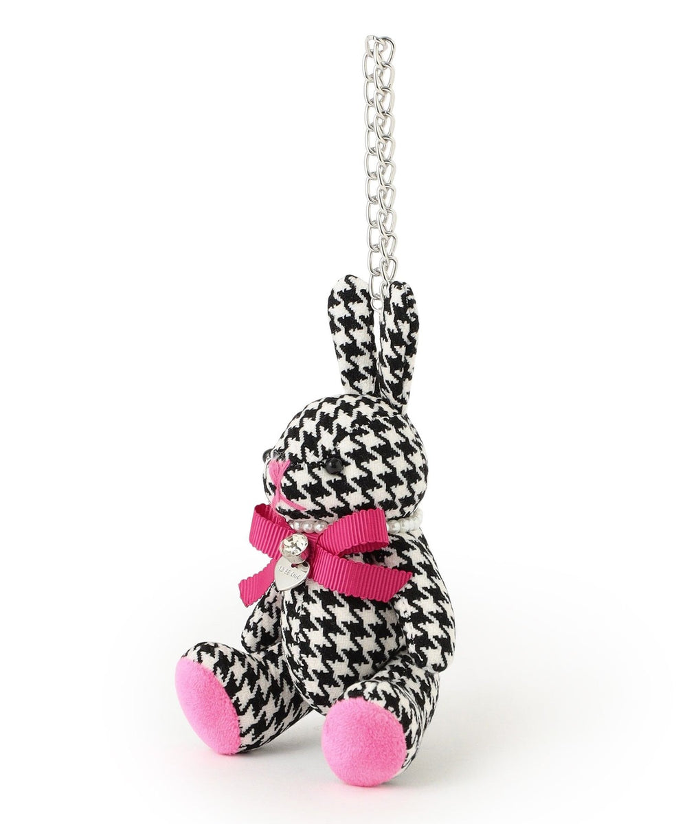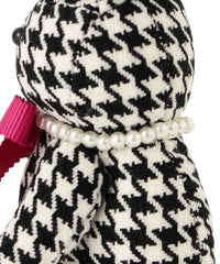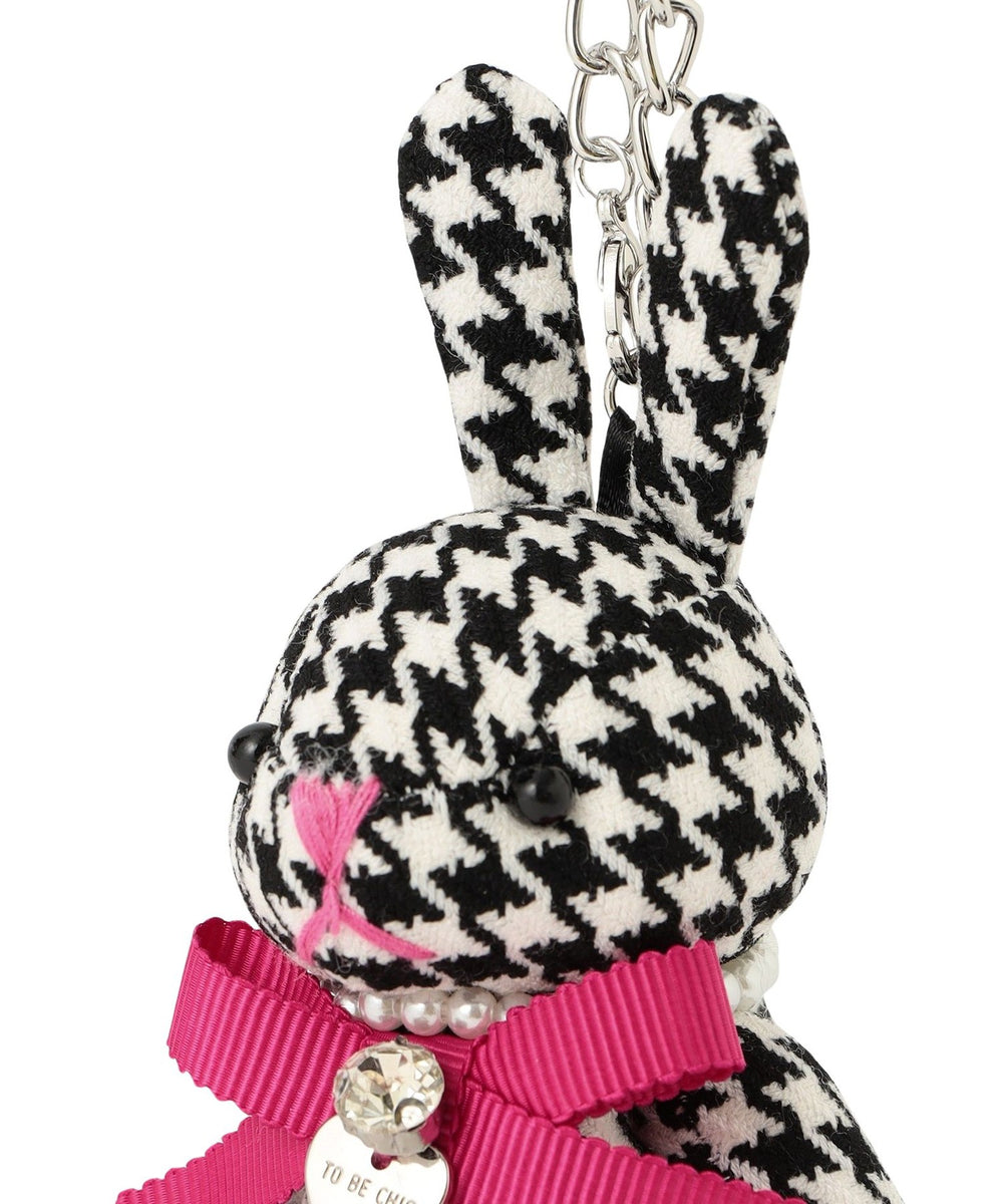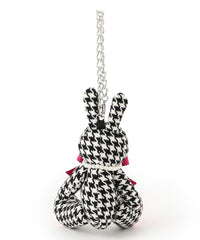 ラビットのバッグチャーム 愛称はジャンヌ。千鳥柄のクラシックなデザインのうさぎチャームです。パール調パーツのネックレスの中心にはリボンと輝くビジューをオン。バッグチャームやお好みのところにつけておたのしみいただけます。
