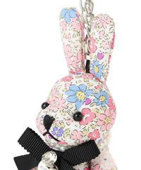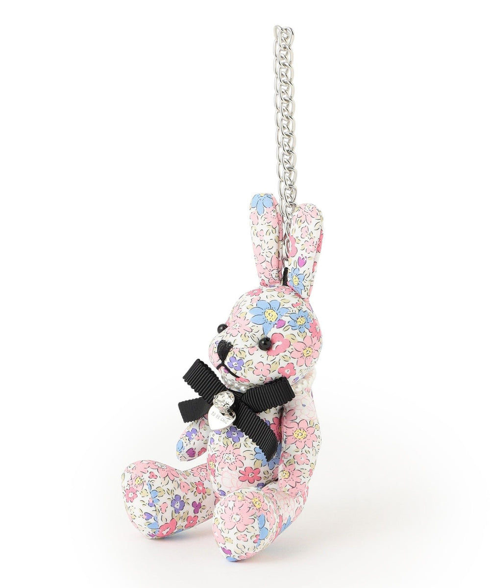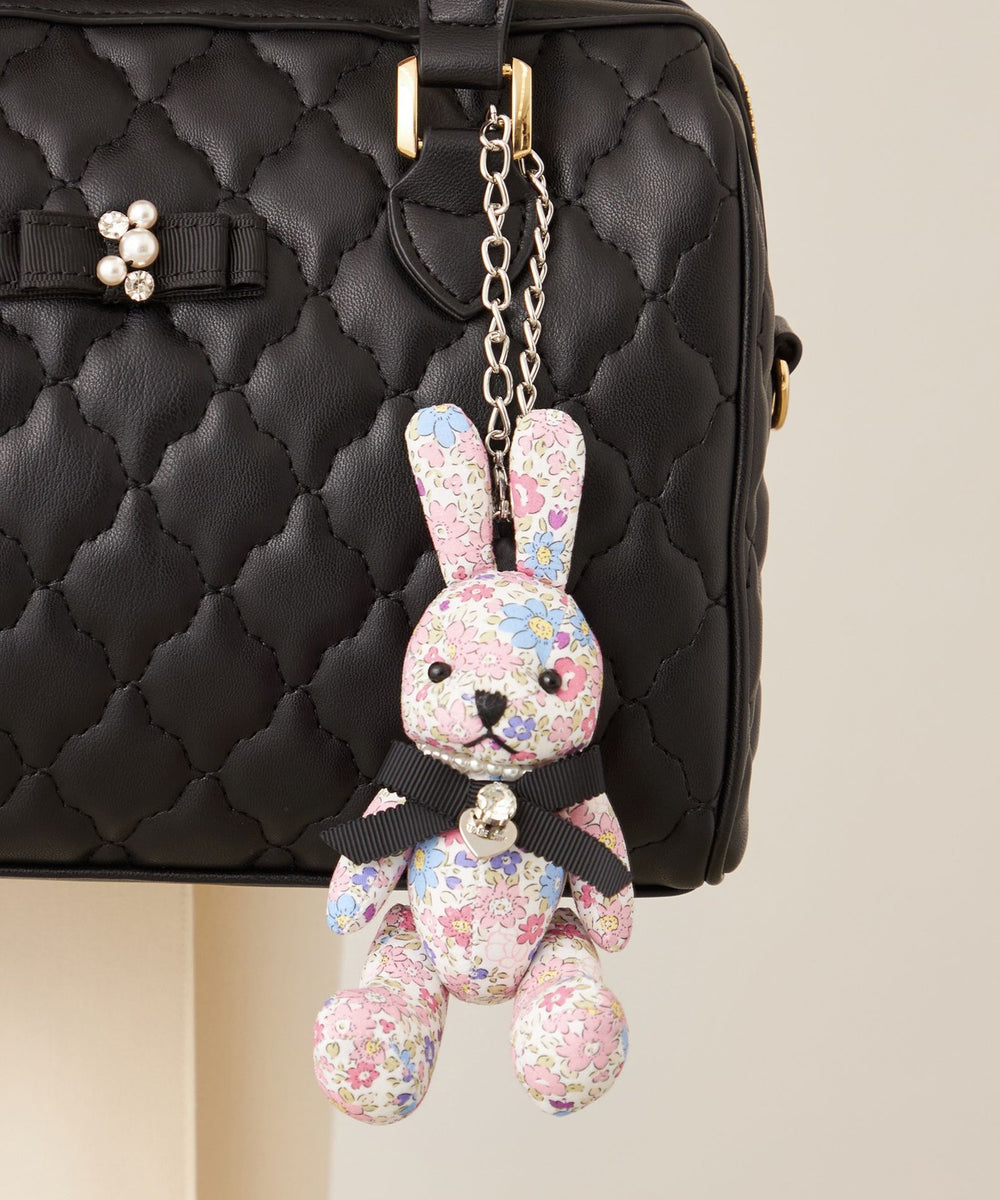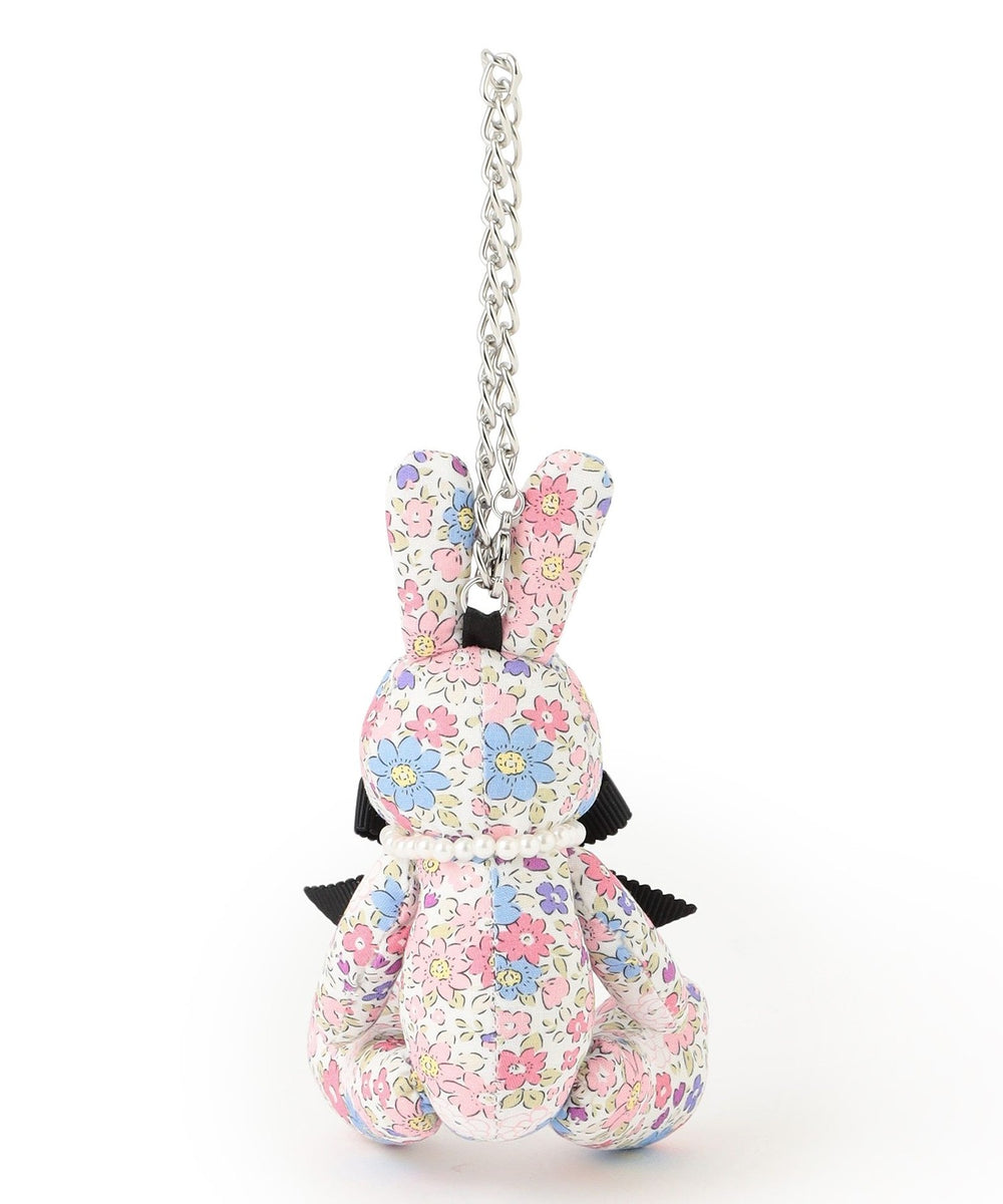 ラビットのバッグチャーム 愛称はアリス。優しい花柄プリントのうさぎチャームです。パール調パーツのネックレスの中心にはリボンと輝くビジューをオン。バッグチャームやお好みのところにつけておたのしみいただけます。