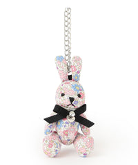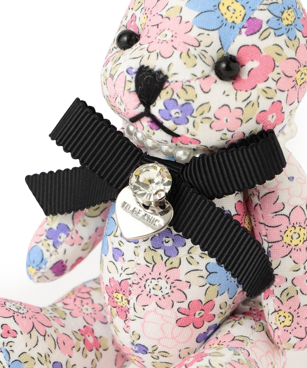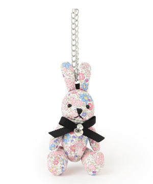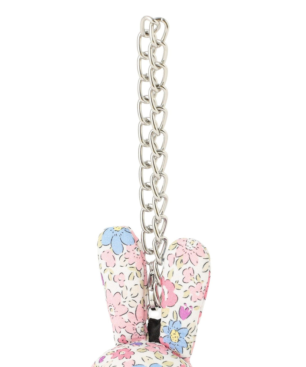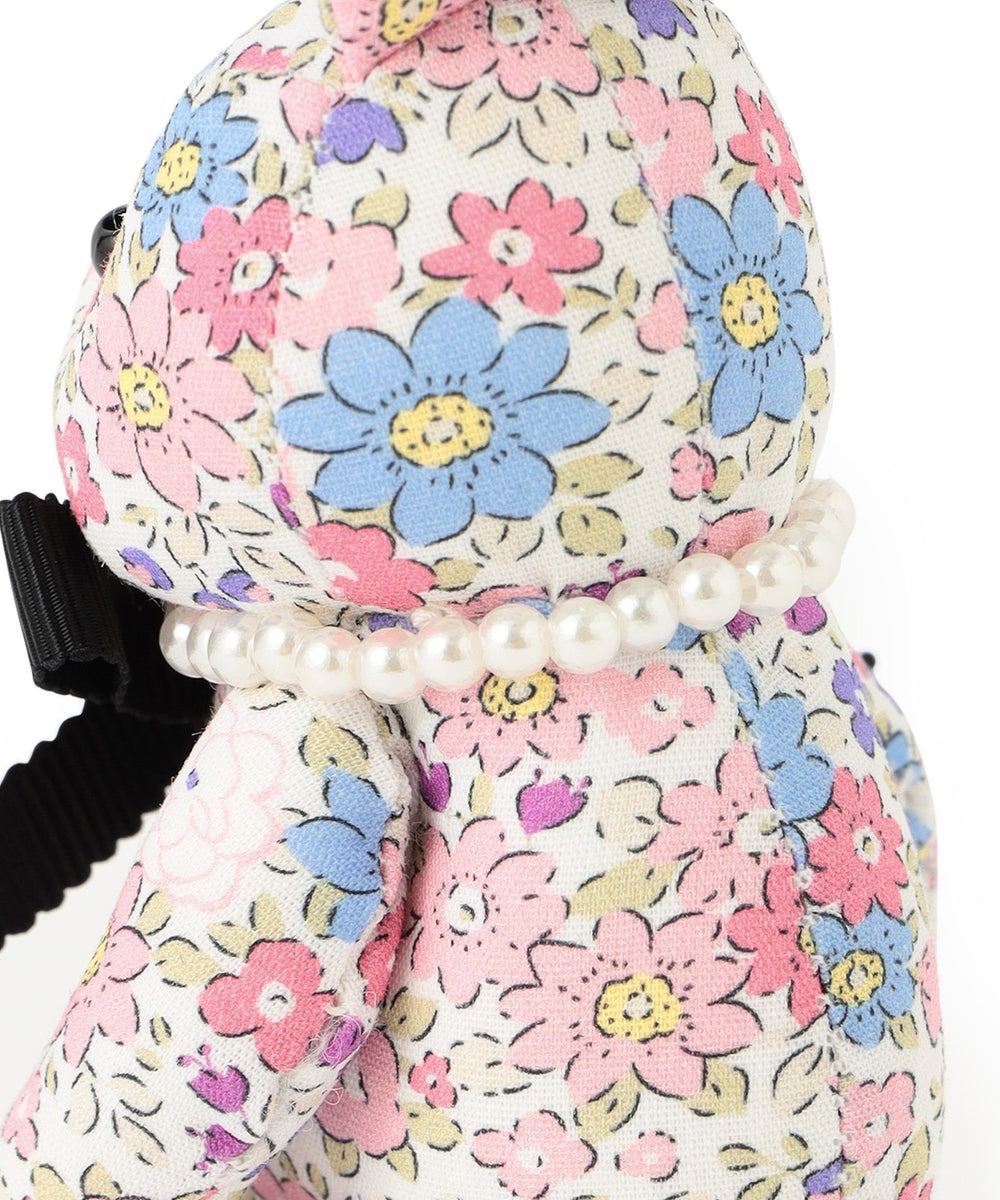 ラビットのバッグチャーム 愛称はアリス。優しい花柄プリントのうさぎチャームです。パール調パーツのネックレスの中心にはリボンと輝くビジューをオン。バッグチャームやお好みのところにつけておたのしみいただけます。