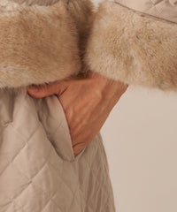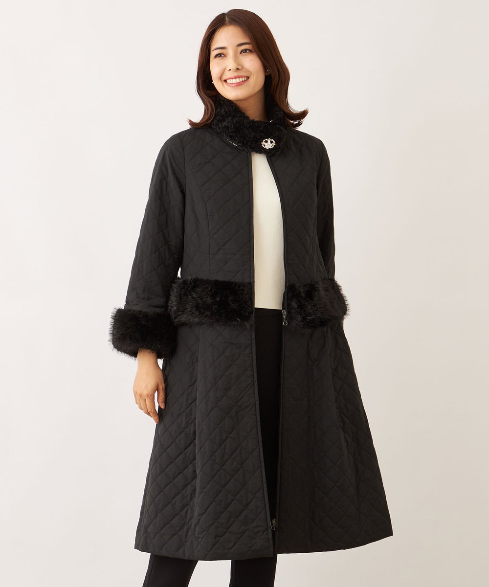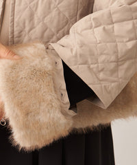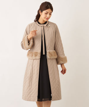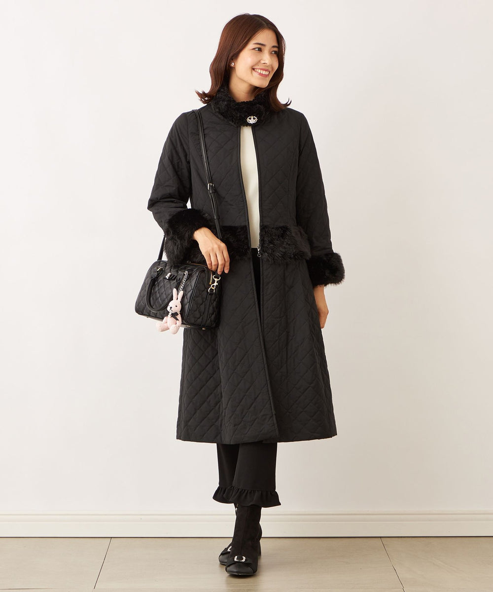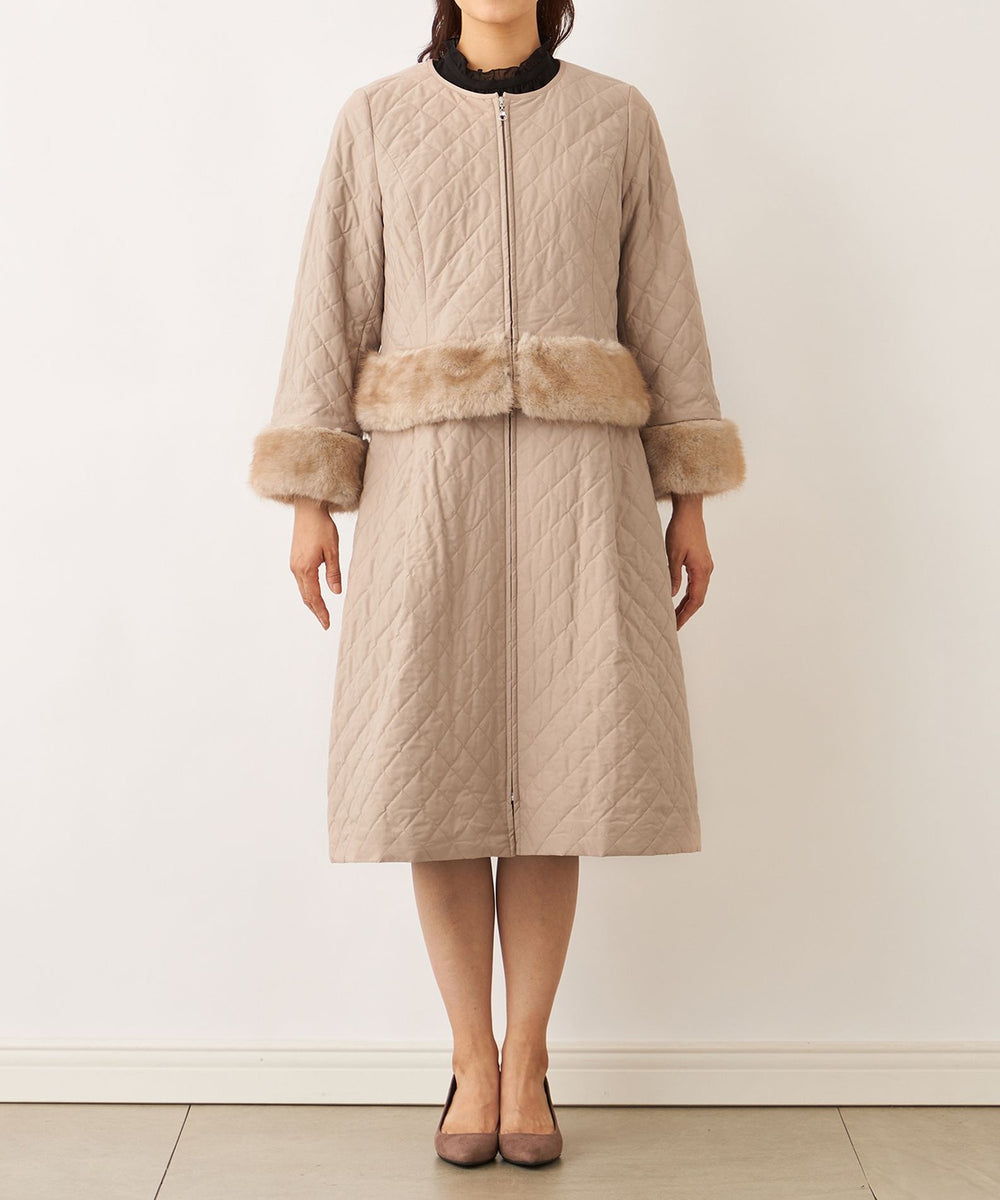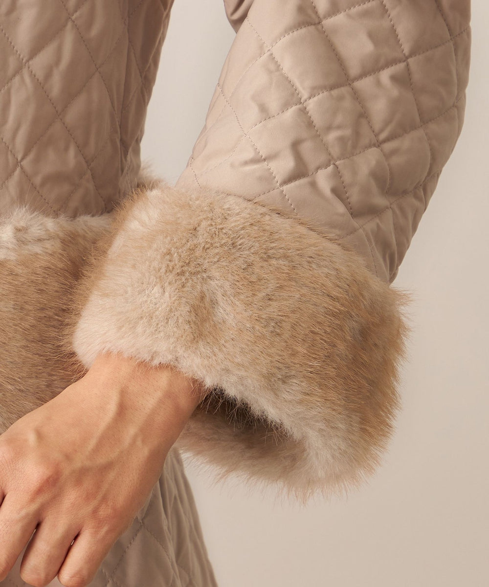 フェイクファー付きのキルトロングコートで、腰回りのファー内側にレンズ釦を配し、スカート部分を着脱可能な仕様にすることで、裾ファー付きのショートジャケットとしても着用できます。さらに、袖口のファーも取り外し可能で、気候やコーディネートに応じて丈感やアイテムを自在に変化させられる2WAY仕様のコートです。