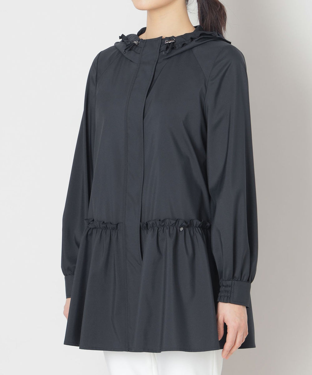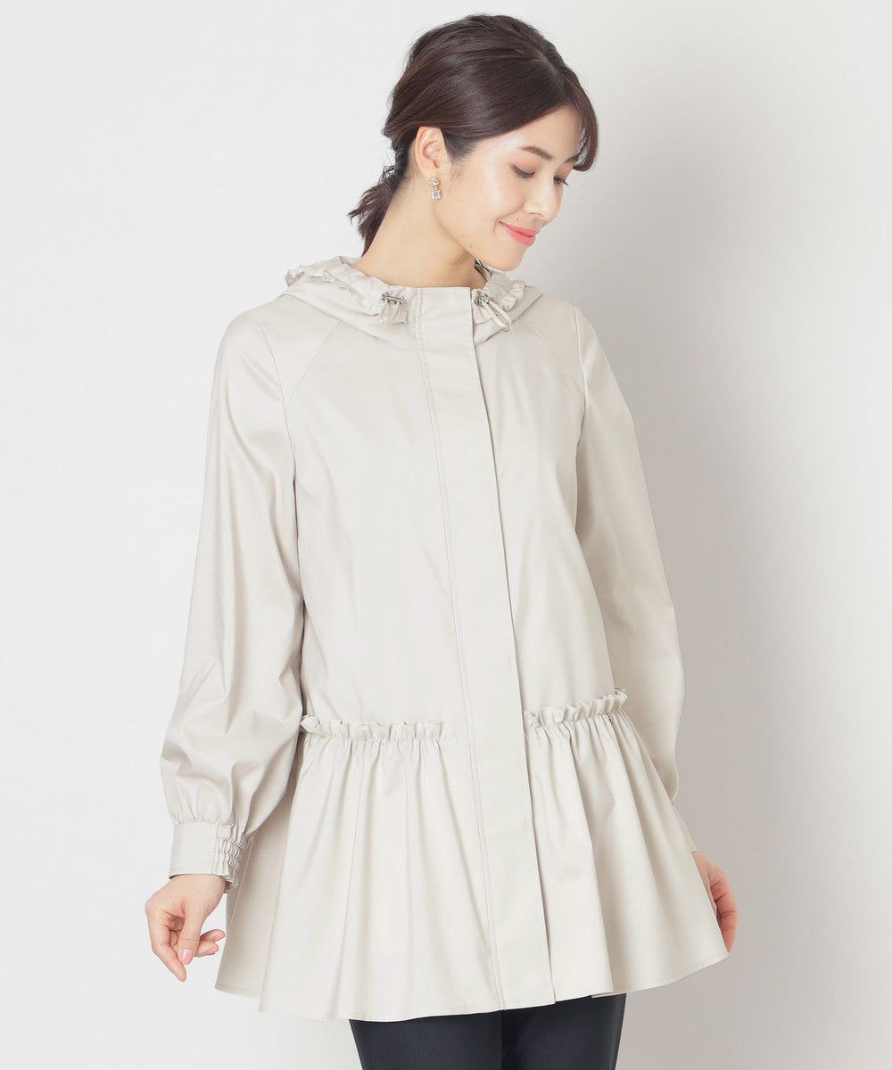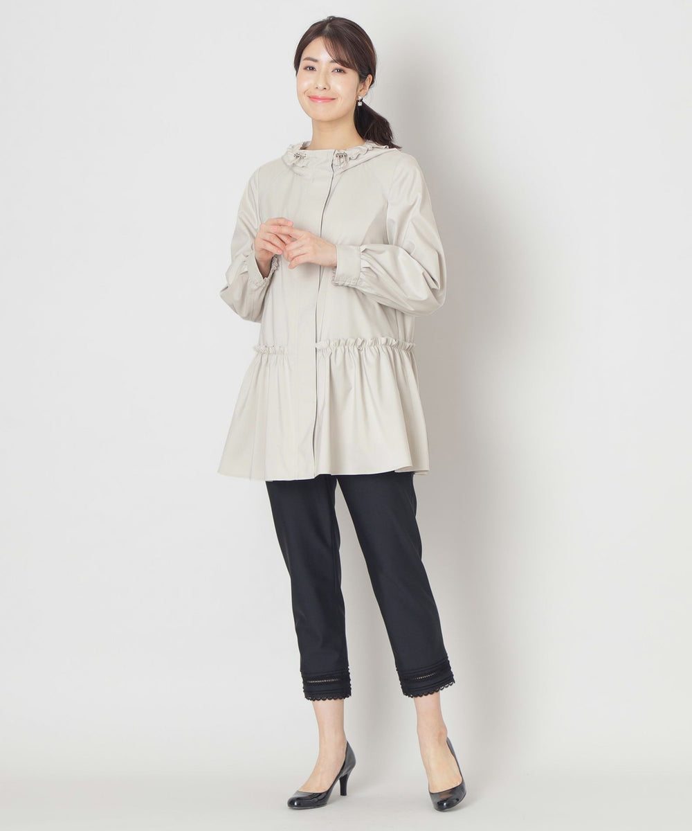 フード付きで比翼仕立てのスッキリとしたエレガントなデザインコートです。 フード回りとウエストヨークにフリルをあしらい、ローウエストのギャザーもデザインポイント。 ヒップが隠れるミドル丈はスリムパンツとの相性もよくすっきりとしたスタイルを演出します。 はっ水機能付きで突然の雨でも安心です。