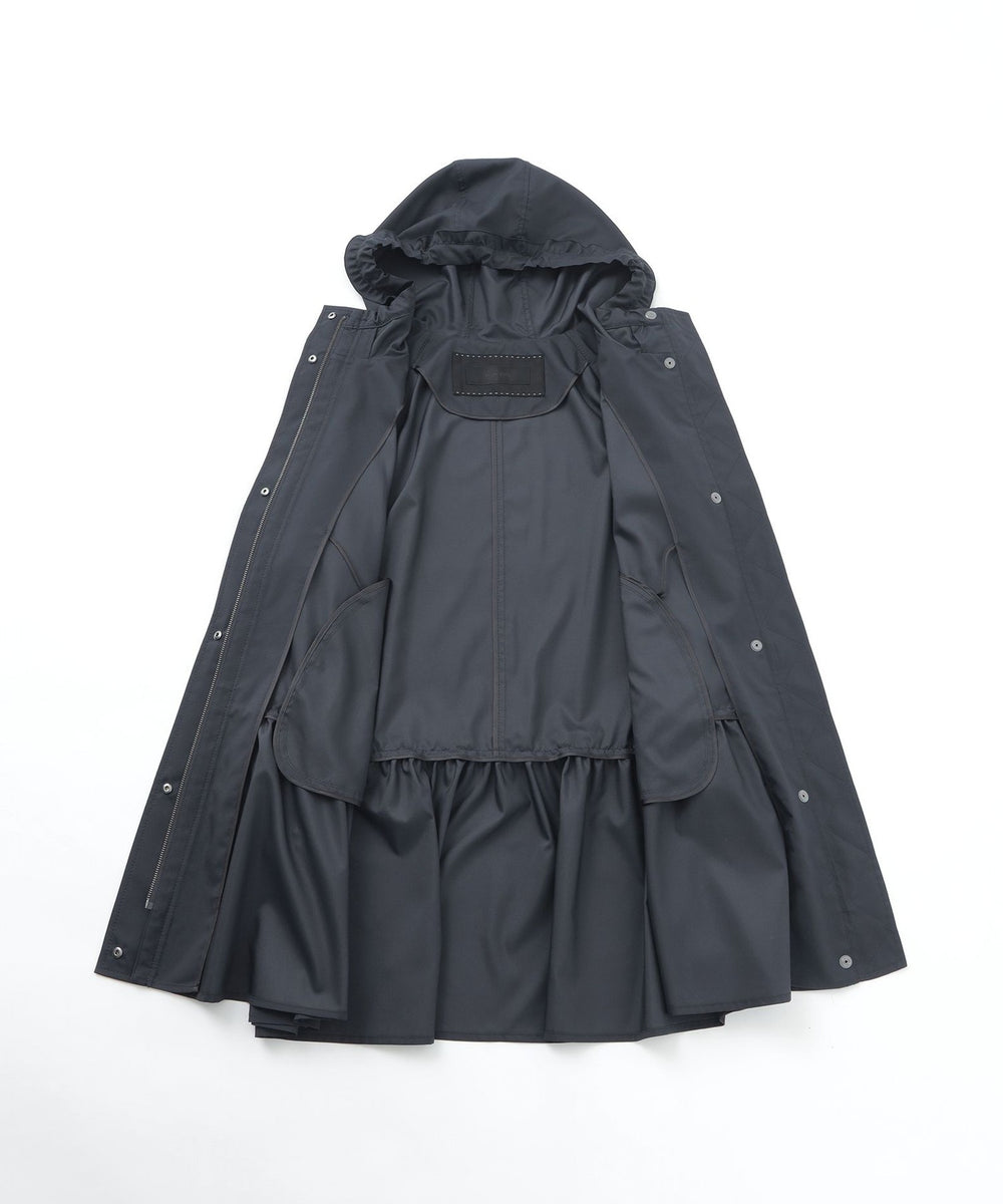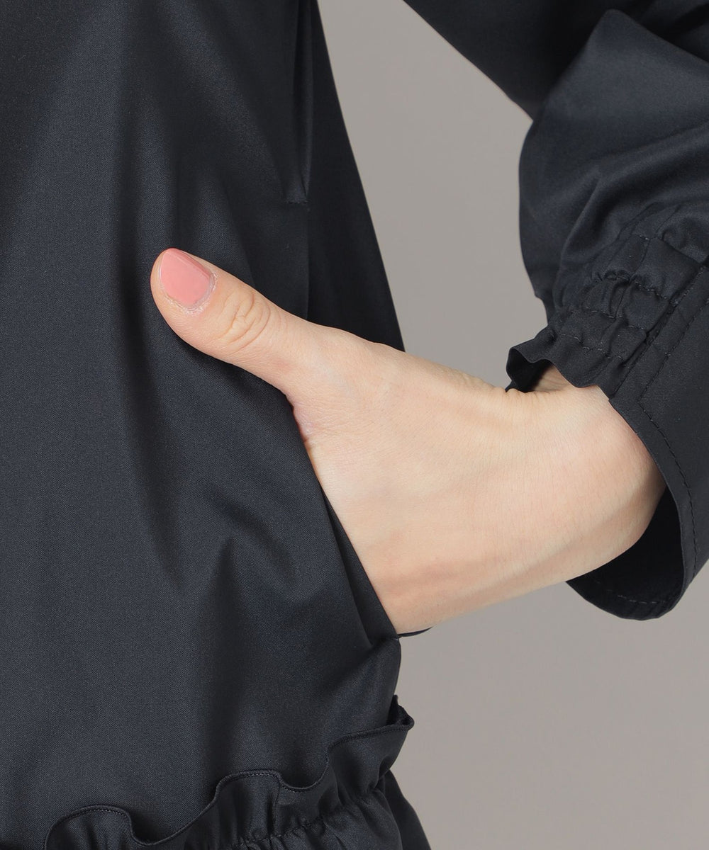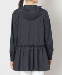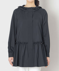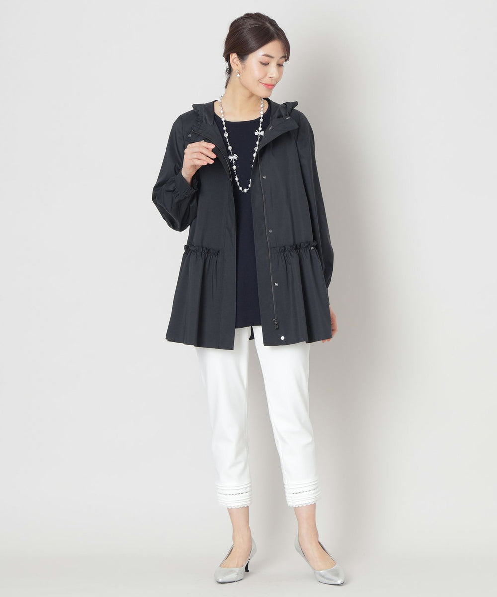 フード付きで比翼仕立てのスッキリとしたエレガントなデザインコートです。 フード回りとウエストヨークにフリルをあしらい、ローウエストのギャザーもデザインポイント。 ヒップが隠れるミドル丈はスリムパンツとの相性もよくすっきりとしたスタイルを演出します。 はっ水機能付きで突然の雨でも安心です。