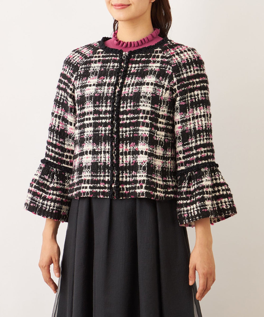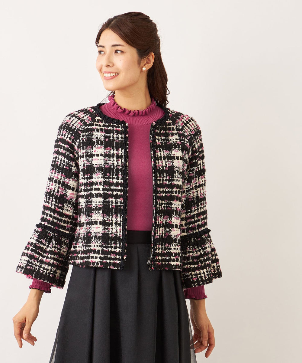 ノーカラーのフロントファスナー開きで、襟ぐりから前端にかけてフリルレースをあしらい、華やかさをプラス。ラグランスリーブの袖口には切り替えを施し、フリルレースとタックを寄せることで、ふんわりと広がるエレガントなシルエットに仕上げました。9分丈の袖は、インナーのニットをさりげなく覗かせるスタイリングがおすすめです。