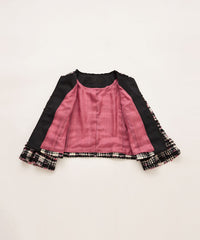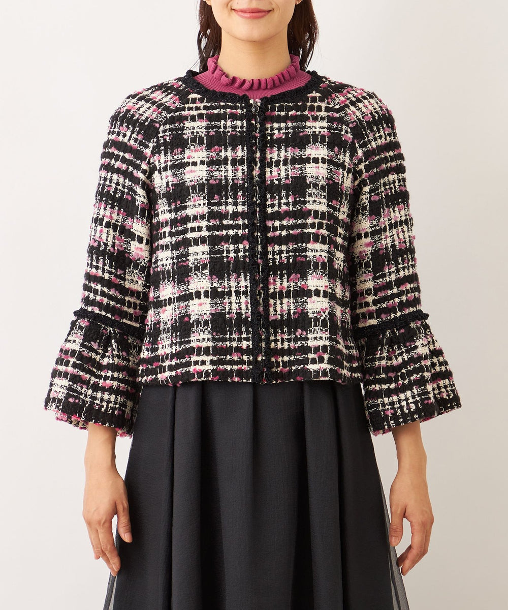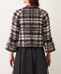 1923年創業のフランスの高級ファンシーツイードメーカー「Clarenson」による、クラシカルなデザインと現代的な感性が融合した素材を使用。16種類の異なる意匠糸で構成されており、太い黒のブークレ糸やプリントされた紅いボンボン糸がアクセントとなり、奥行きのある表情とモダンな素材感を演出しています。