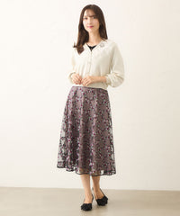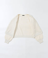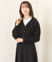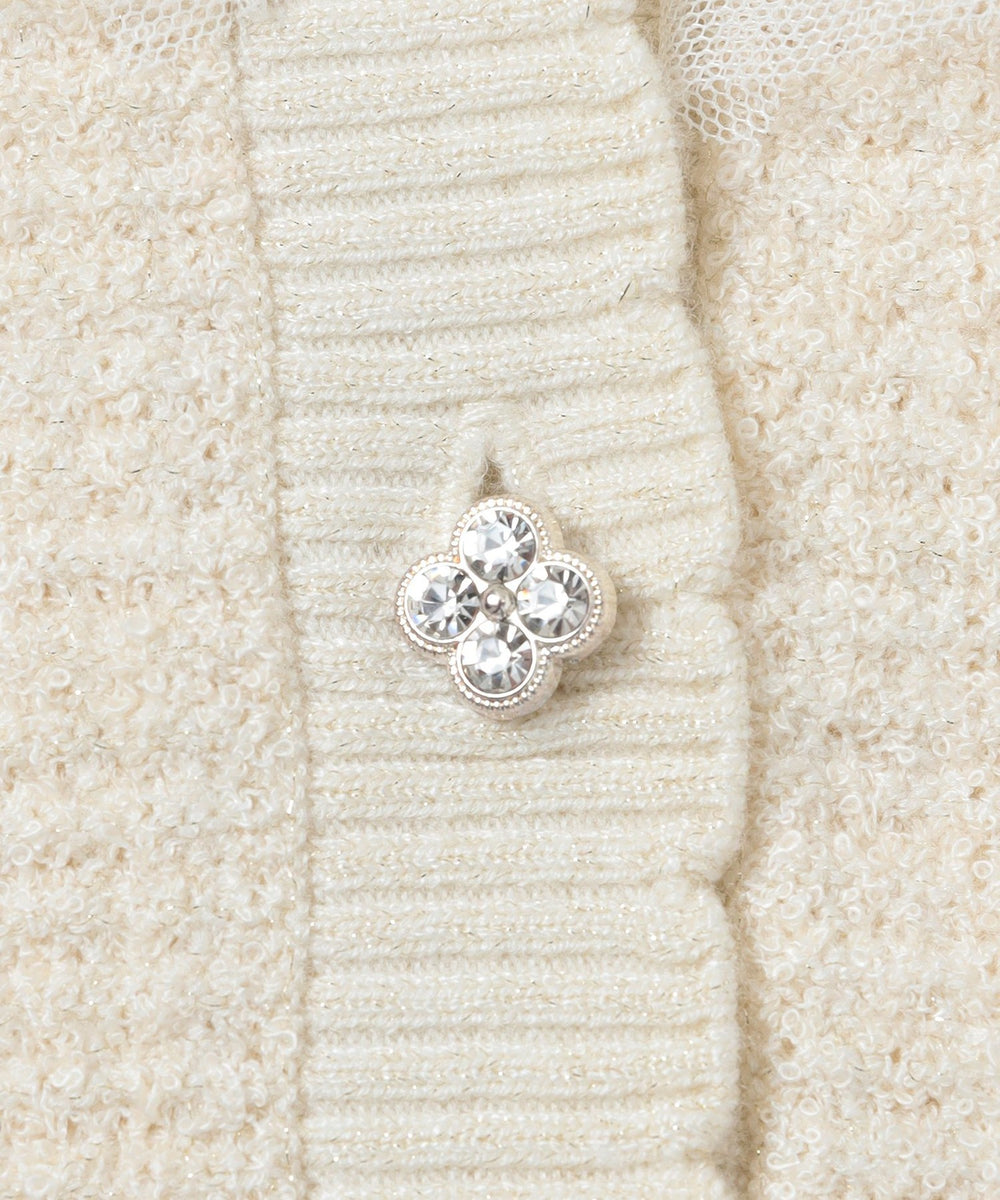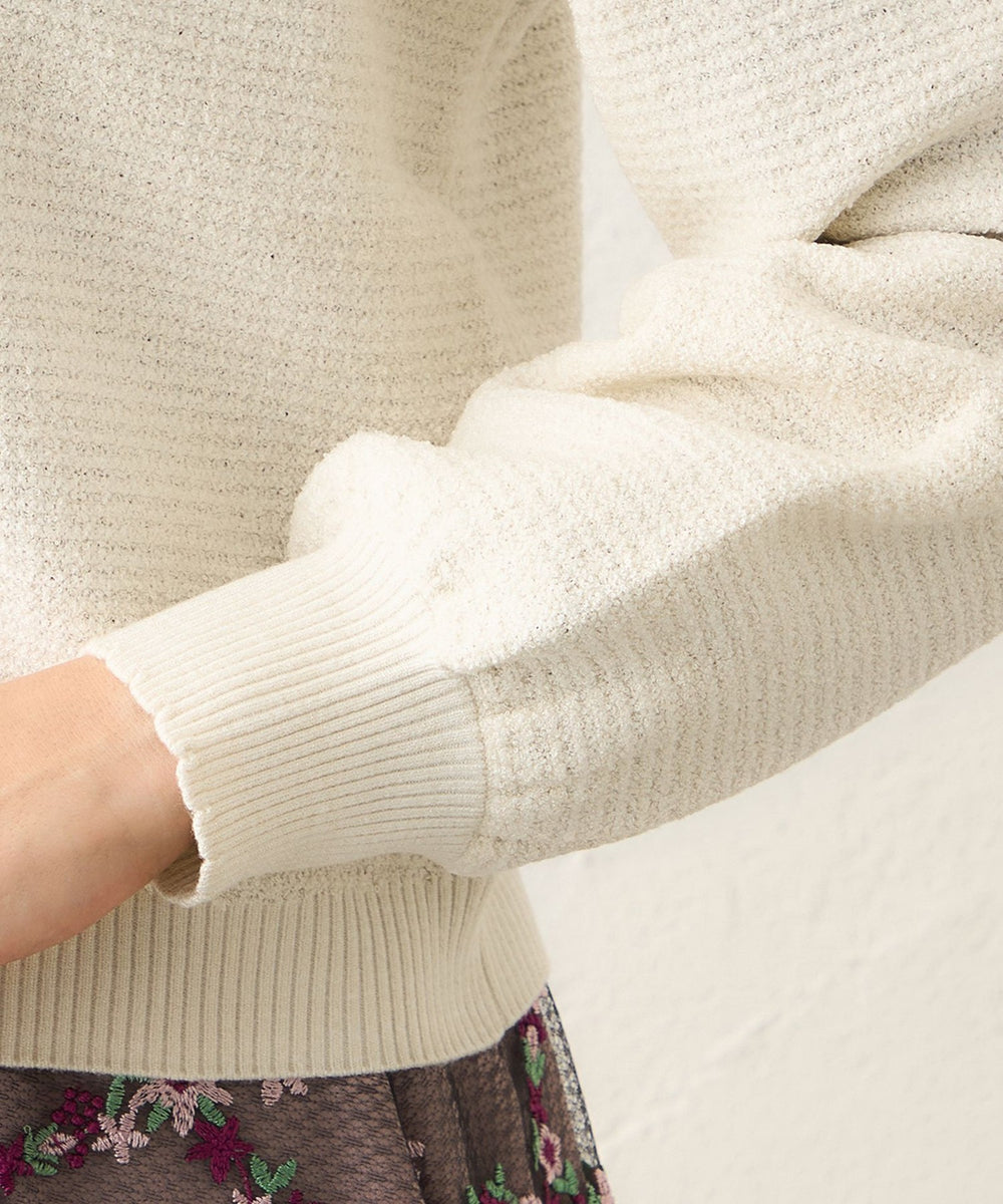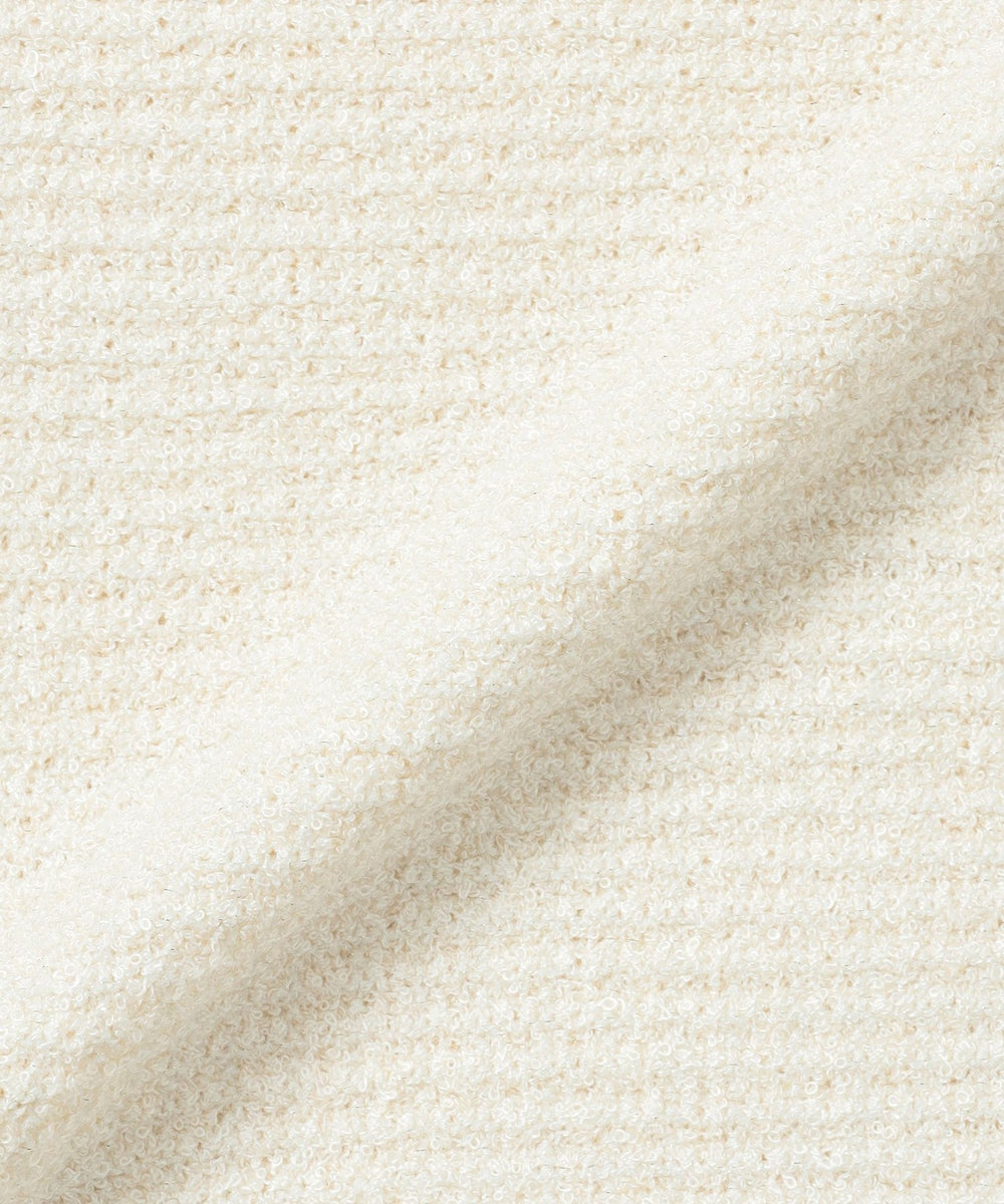 身頃には、レーヨン・ナイロン・ポリエステルのストレート糸、極細ラメ糸、アクリル・ナイロンのブークレ糸という3種類の糸をミックスし、ツイード調に編み上げた素材を使用。細番手の糸による軽やかさと程よい薄さに加え、奥行きのある豊かな表情が魅力です。襟部分には、ポリエステル100%のチュール生地を採用。ソフトな肌触りとしなやかな柔軟性で、上品な印象を演出します。