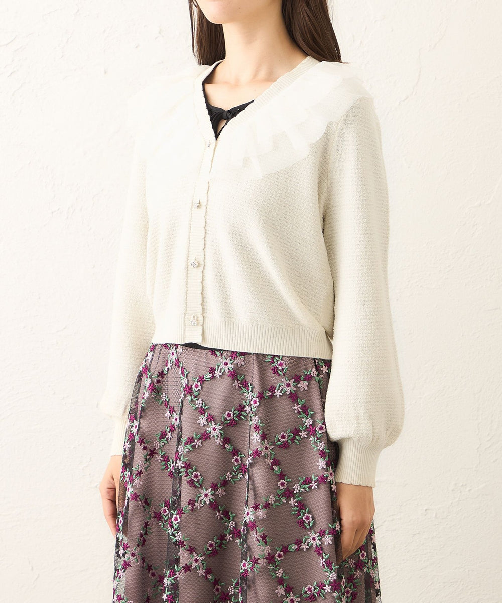 チュール素材のケープカラーに、表情豊かなツイード編地を組み合わせた、甘さと辛さが絶妙にミックスされたデザインニットカーディガンです。チュールと、程よくカジュアルなツイード調のニットのコントラストが、スタイリングに奥行きを与える一枚です。