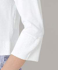 レーヨンのブライト糸に、細デニールのマルチフィラメントをカバーリングしたカバーヤーンを使用しています。強撚によるカバーリングによって、シャリ感とさらりとした風合いが生まれ、上品な光沢感も特徴です。さらに通気性に優れ、肌触りが良く、着用時の快適さを実感していただけます。ハイゲージで丁寧に編み立てることで、美しい表情と快適な着心地を両立した、こだわりの素材です。