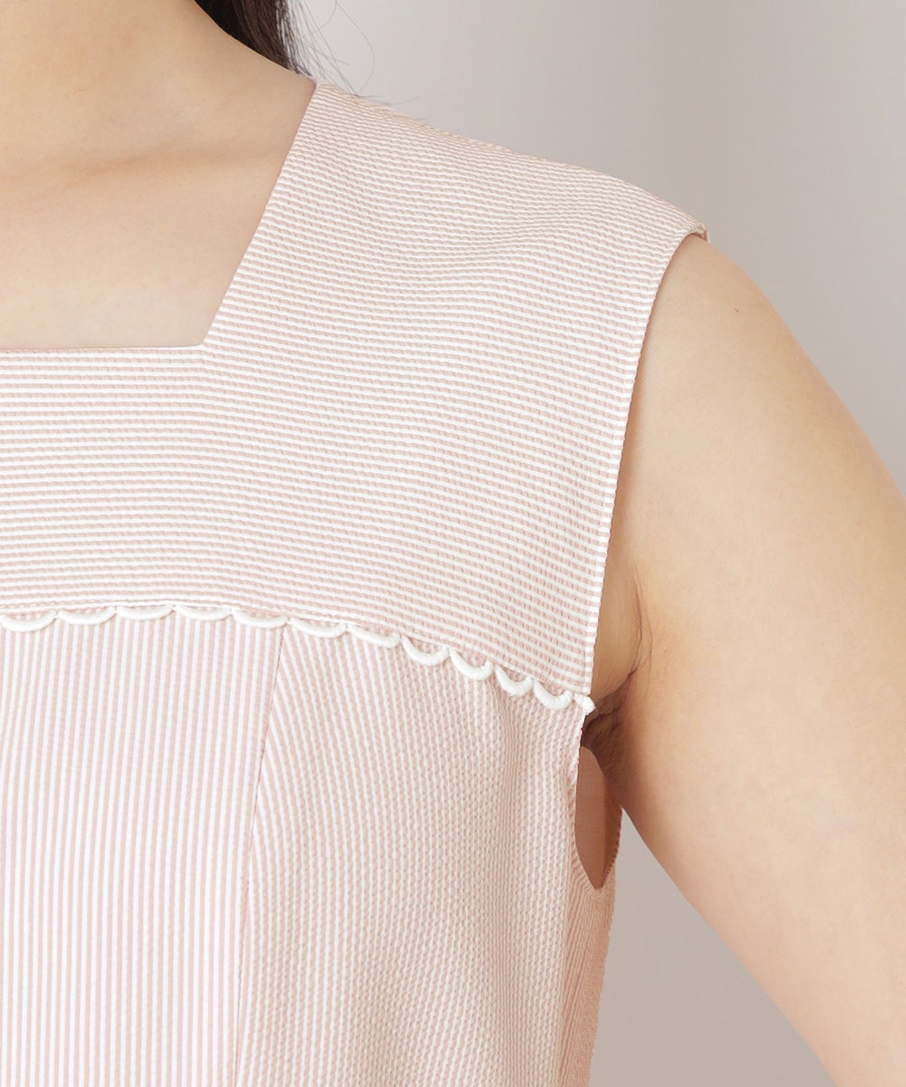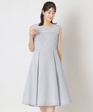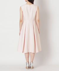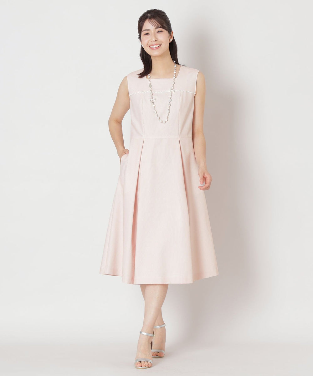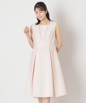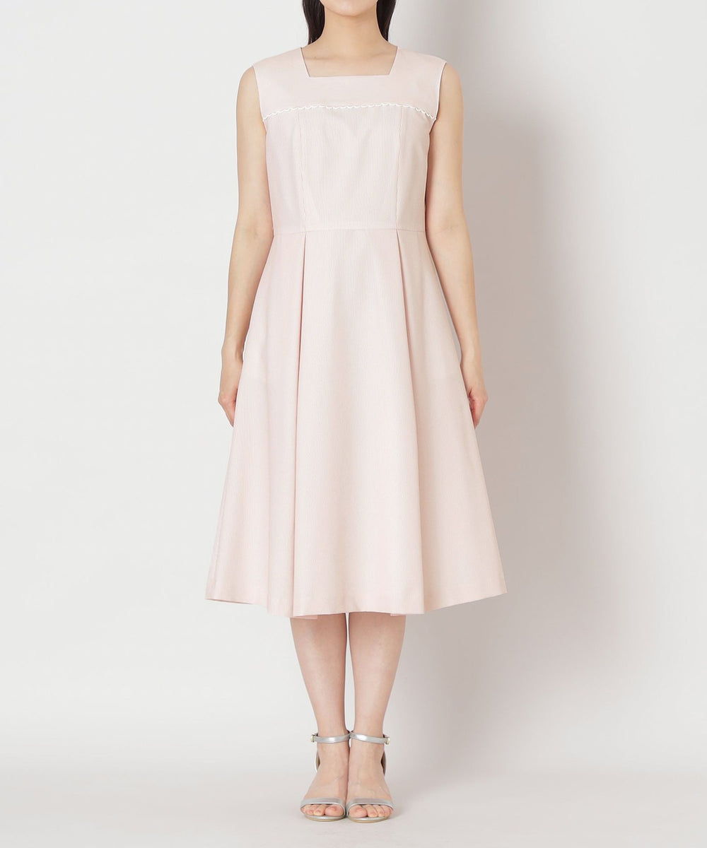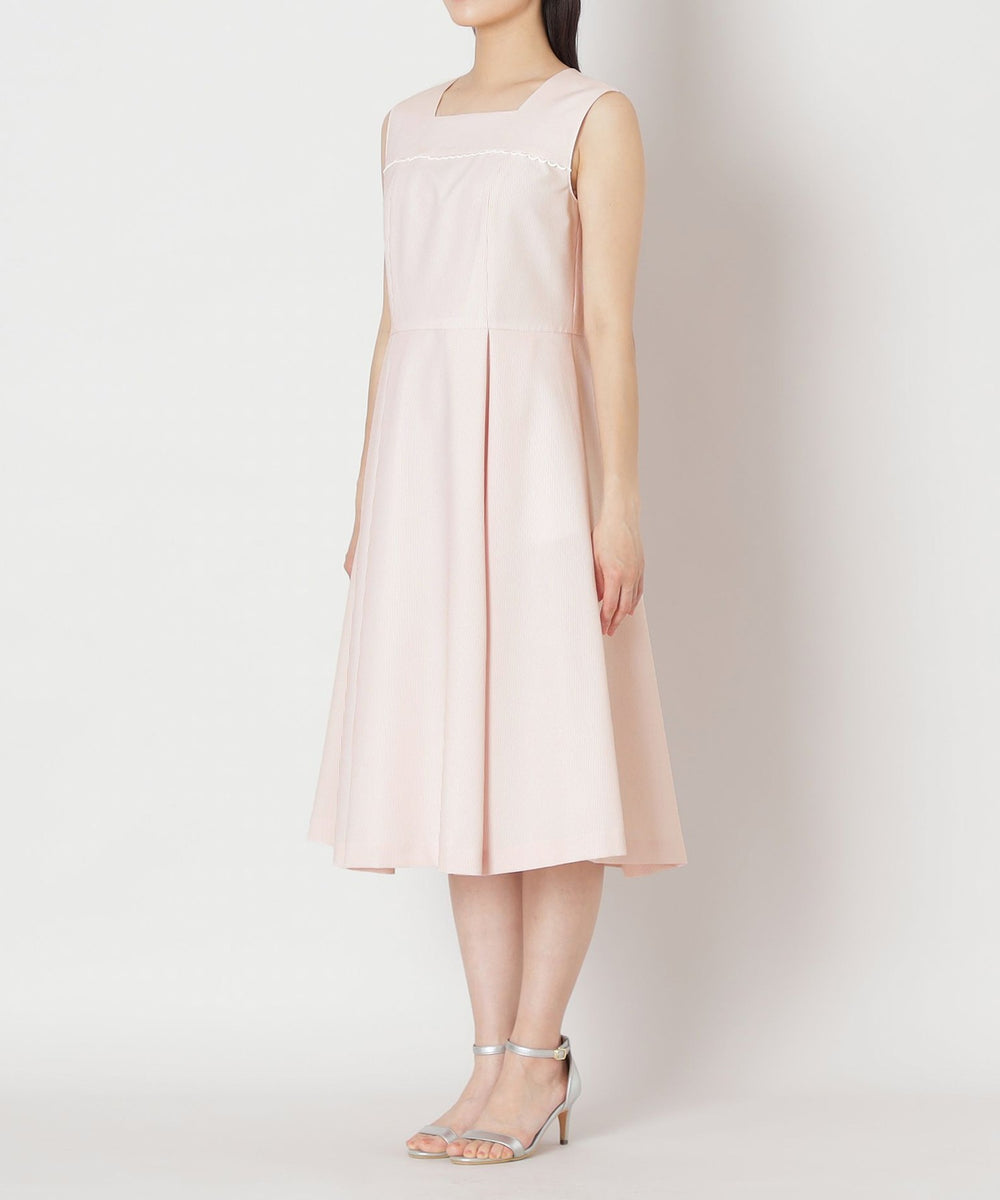 トップスをコンパクトに仕上げた、フィット&フレアラインのワンピースです。スカート部分はBOXタックと脇タックを施し、程よいボリューム感をプラスしています。ヨーク切替部分にはスカラップレースを挟み込み、ノースリーブでスッキリとしたデザインに仕上げています。
