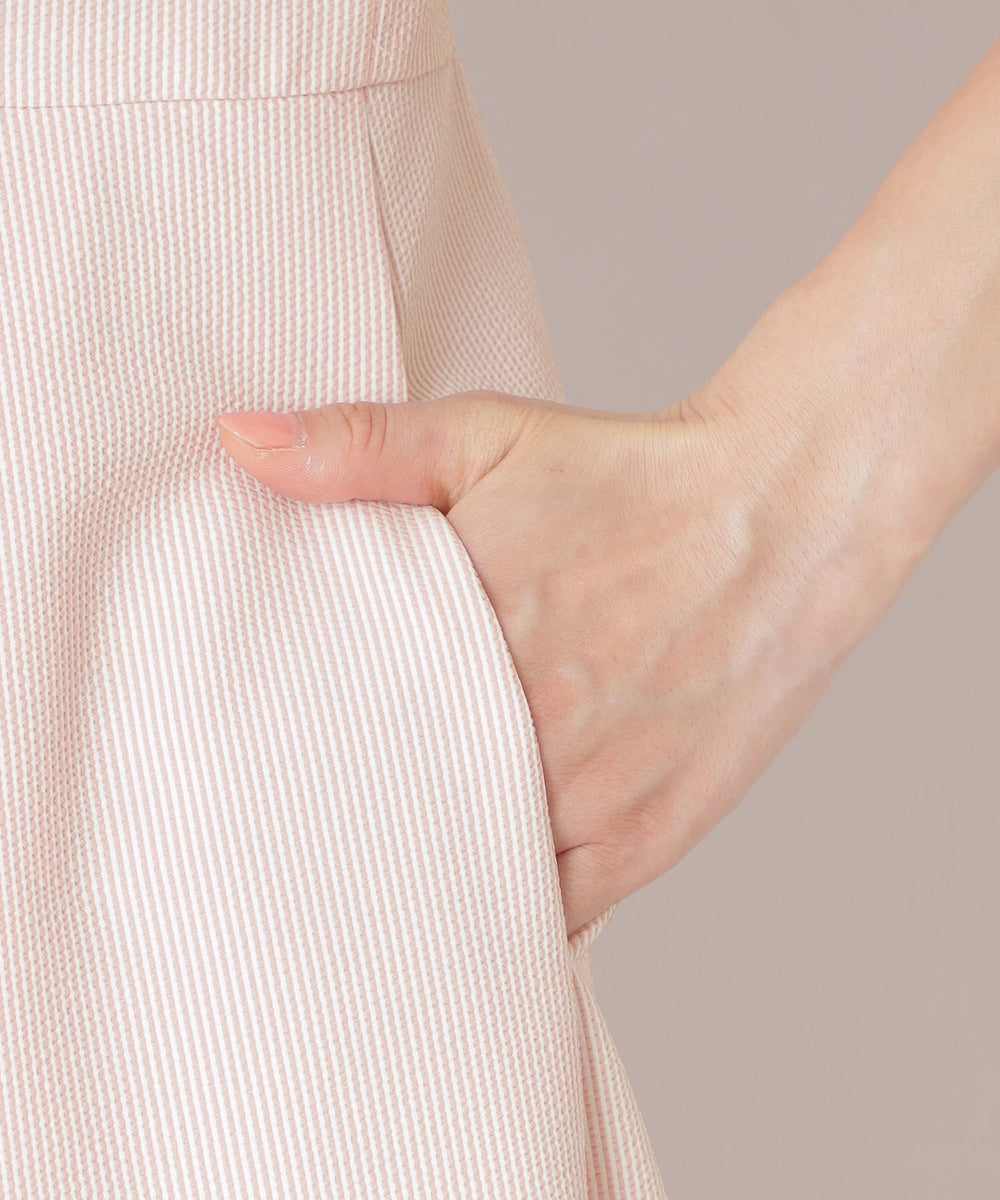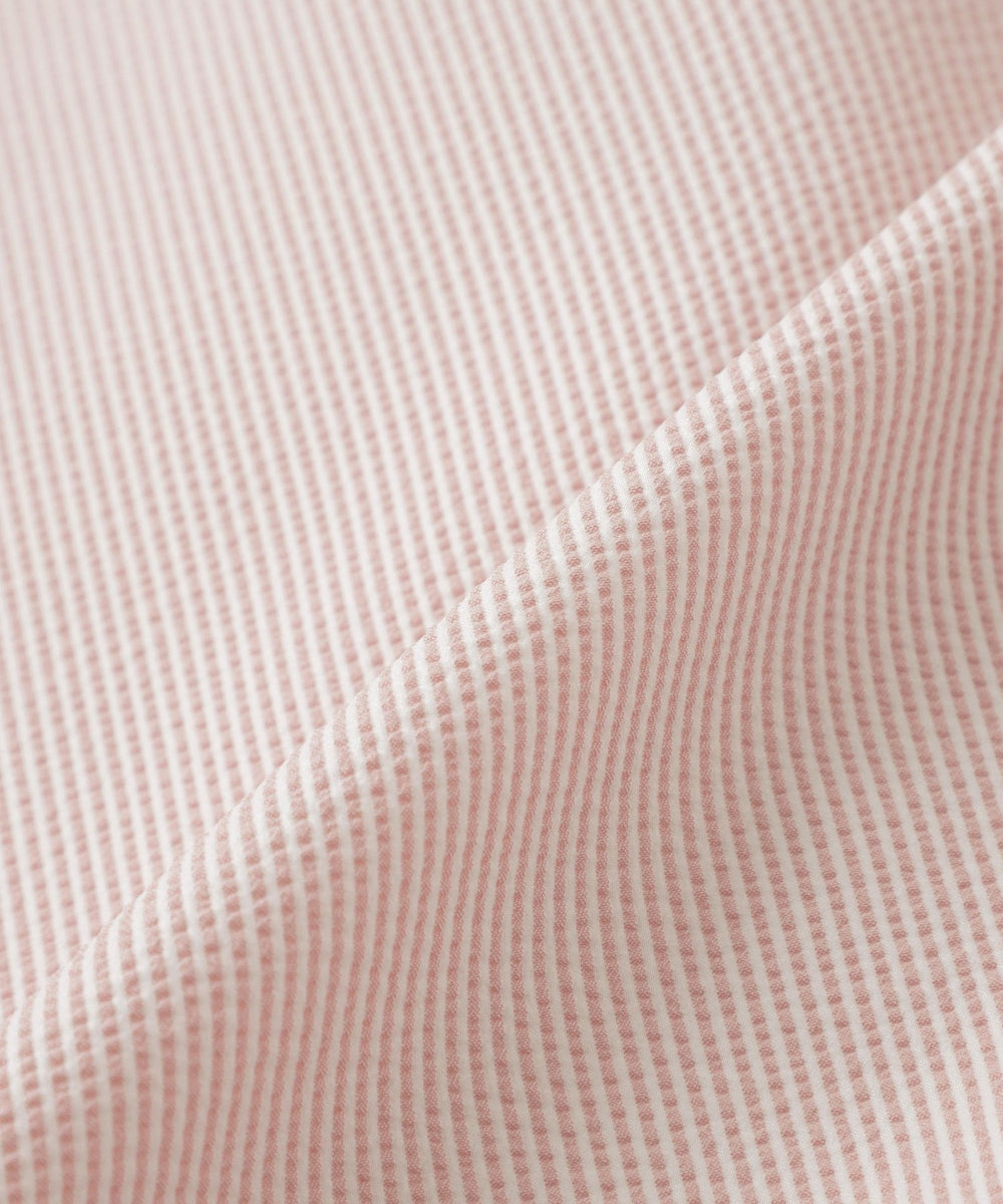 適度なハリ感と軽さが、上品なシルエットを演出します。肌との接地面が少なく、さらりとした肌触りの素材です。大人の装いに相応しいシックなピンストライプ柄も特長の素材です。