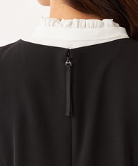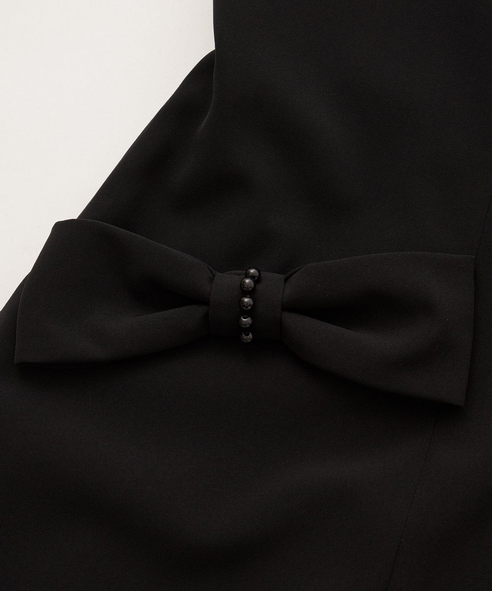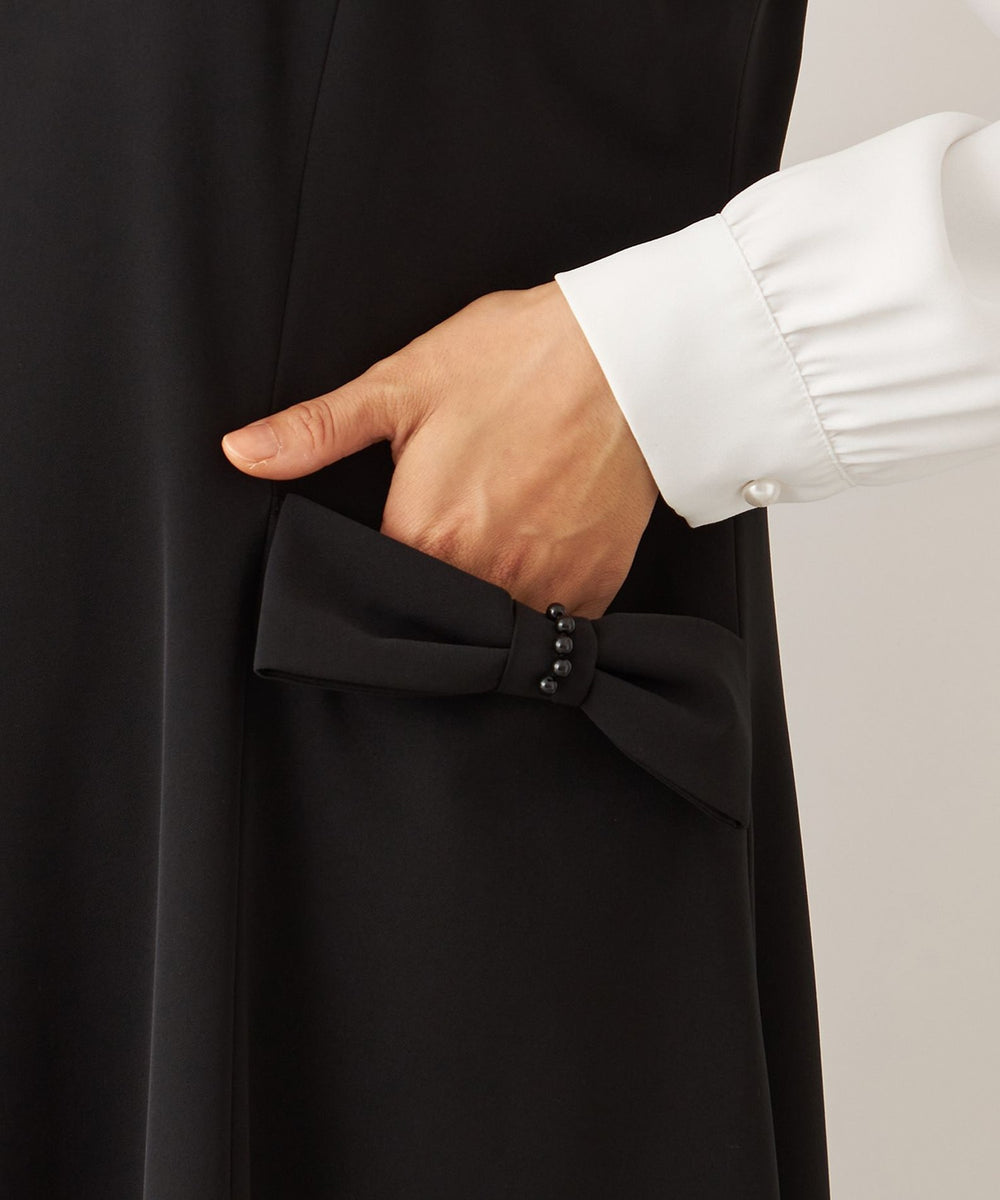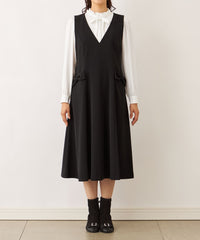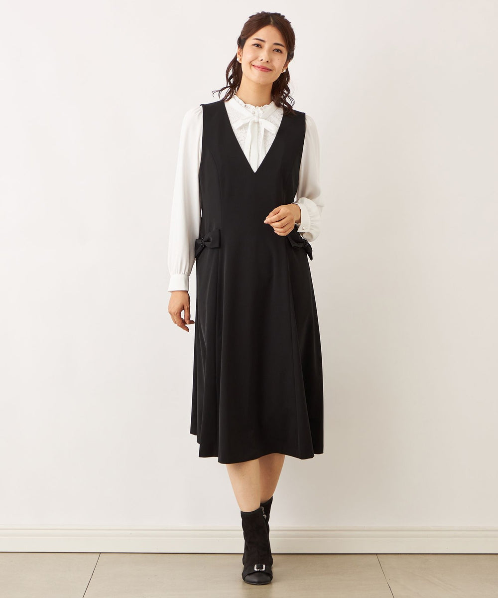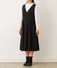Vネックのジャンパースカート。パネルラインで構成されたシルエットが、美しい立体感を演出します。脇のパネルにはポケットを配置し、ポケット口には共布のリボンモチーフとビジューをあしらって、華やかさをプラス。インナーにはニットやブラウスを合わせて、季節を問わず幅広いスタイリングが楽しめる一着です。