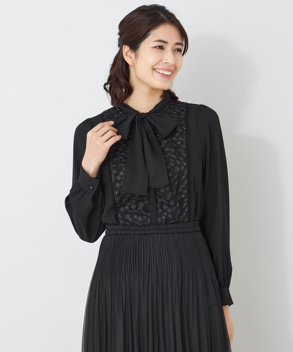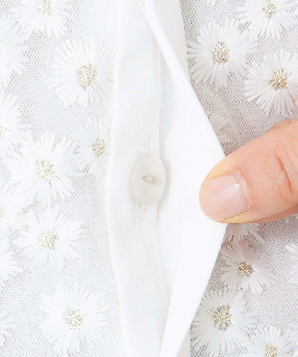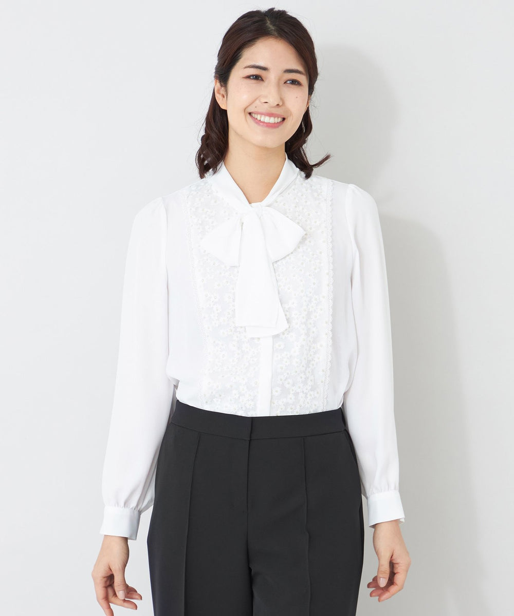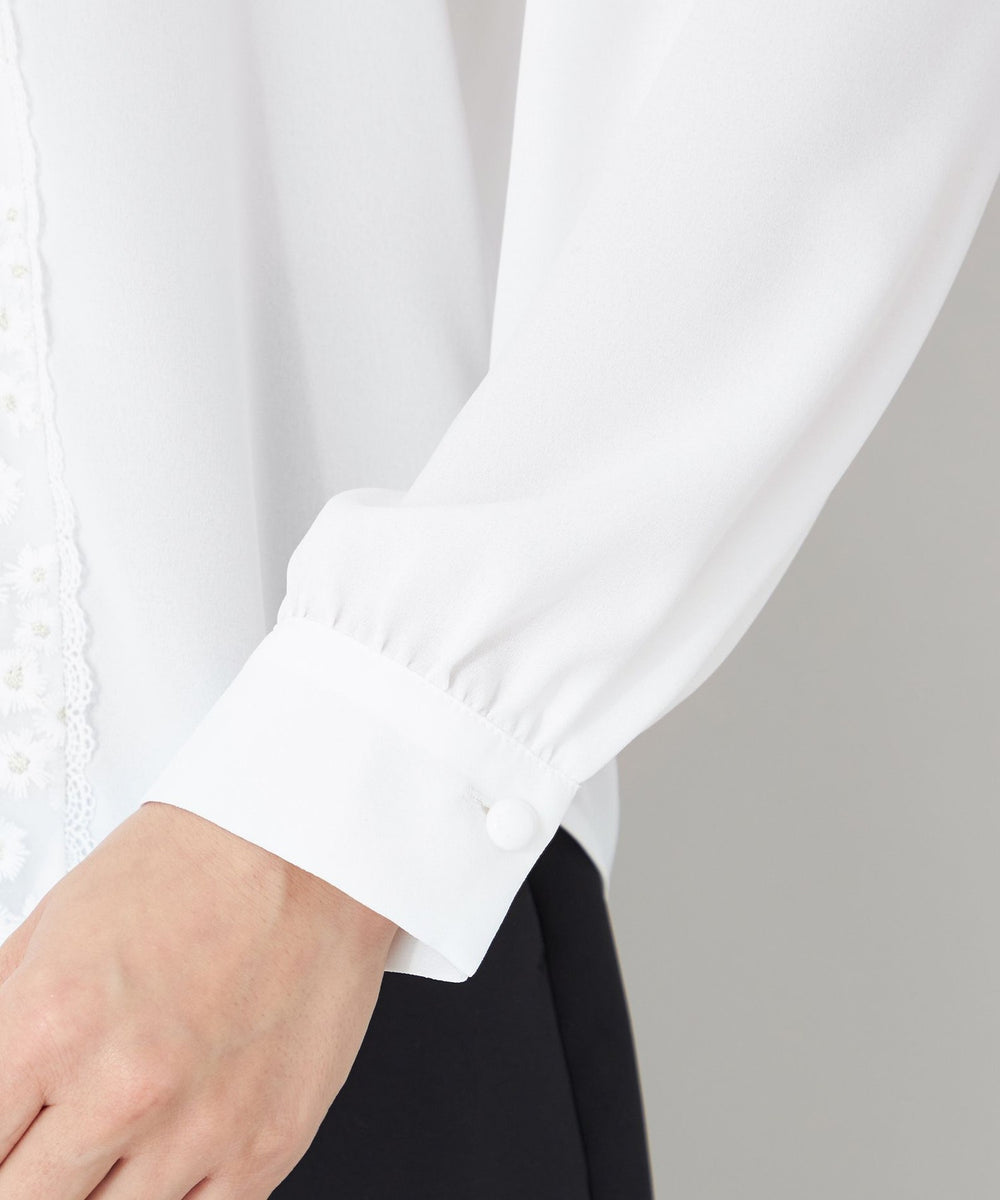 前身頃にフラワーチュール刺繍をあしらった華やかなブラウス。共布のリボンは取り外し可能で、気分やシーンに合わせたアレンジが楽しめます。インナーブラウスとしても活躍する汎用性の高さも魅力です。