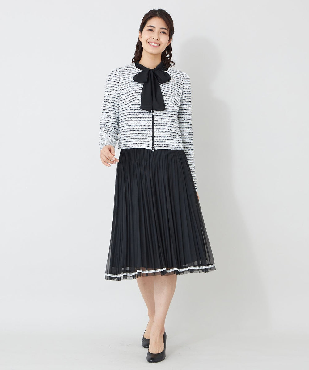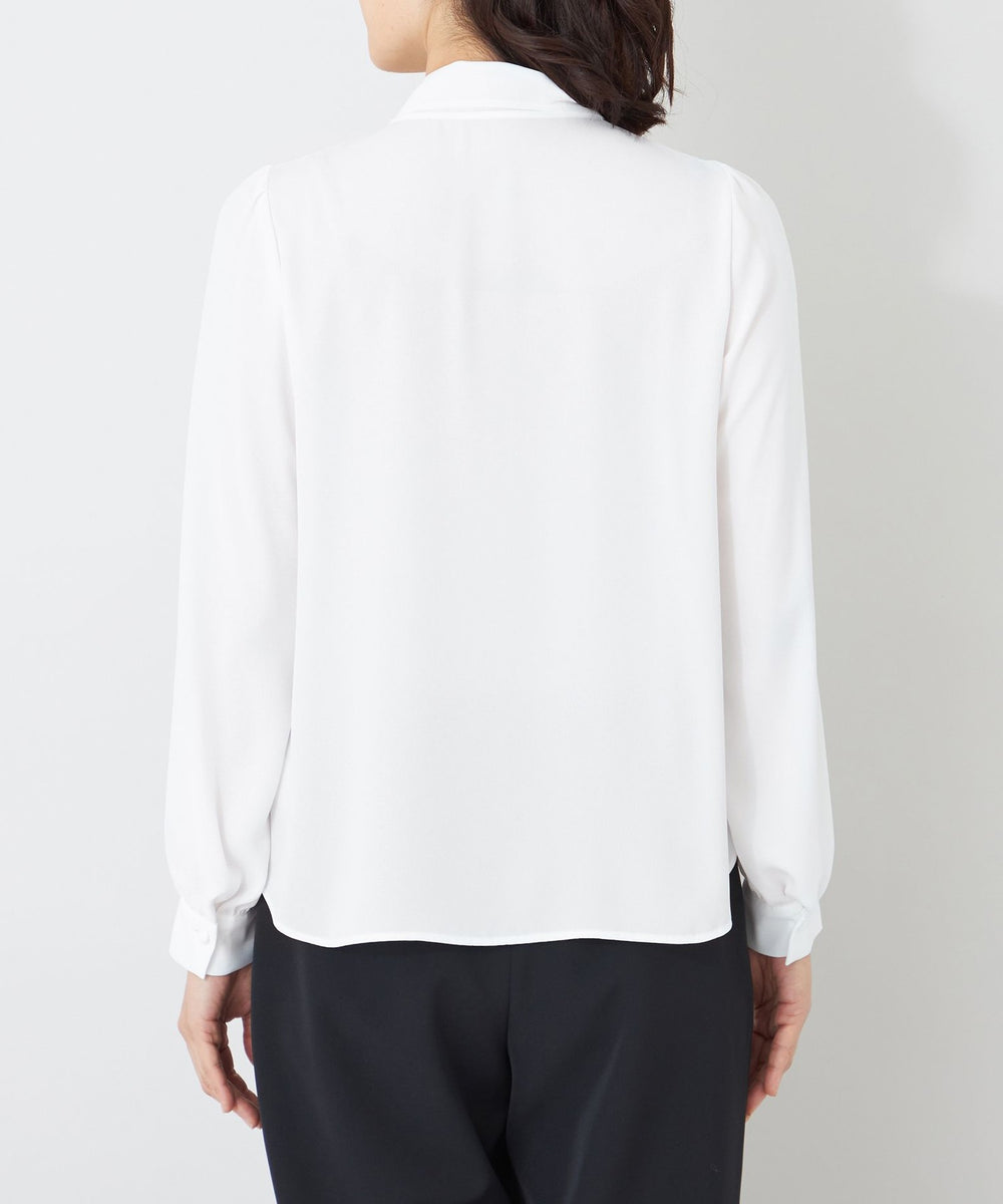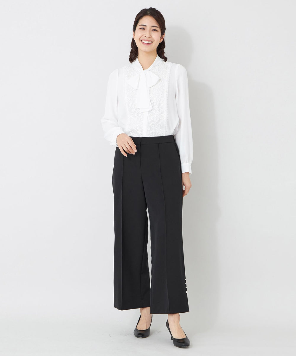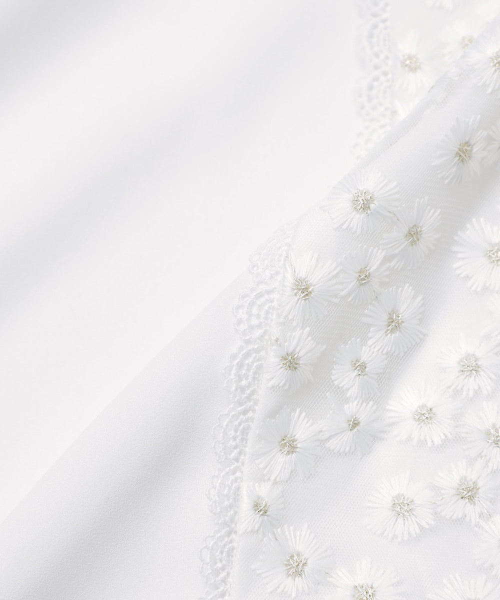 前身頃にフラワーチュール刺繍をあしらった華やかなブラウス。共布のリボンは取り外し可能で、気分やシーンに合わせたアレンジが楽しめます。インナーブラウスとしても活躍する汎用性の高さも魅力です。