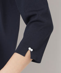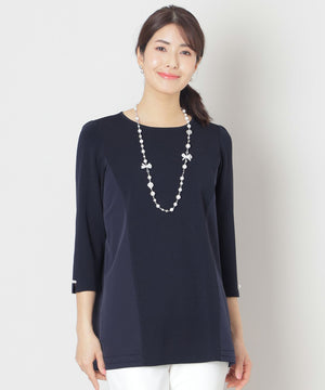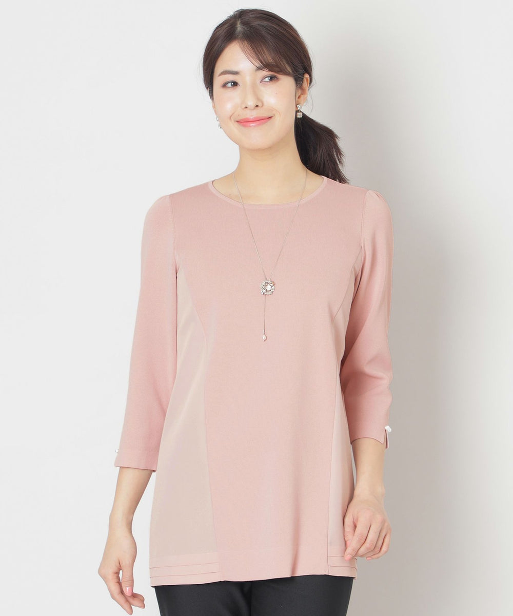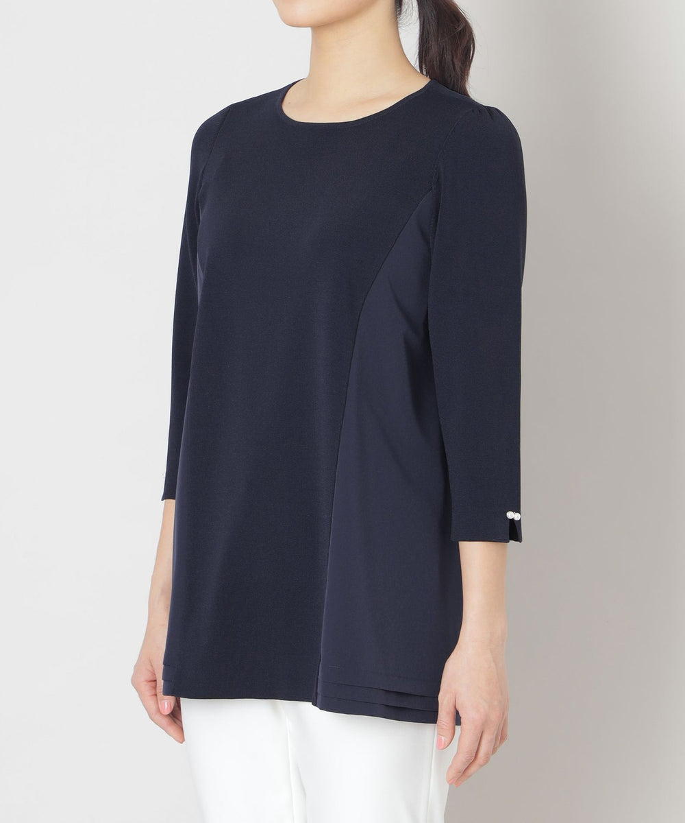 前身頃をニット、後身頃に布帛を使ったドッキングチュニックです。ヨーク部分と裾部分にピンタックデザインを施し、フリルデザインをバックスタイルにアクセントをつけたデザインチュニックです。袖にはパールビジューをあしらったエレガンスなデザインのチュニックです。