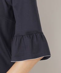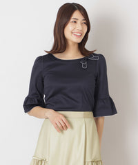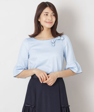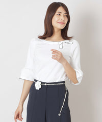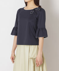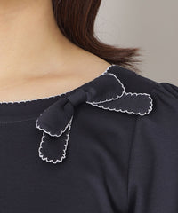 襟、袖口、リボンコサージュに配色のピコ刺しゅうをあしらった、袖切替えデザインがポイントのカットソーです。