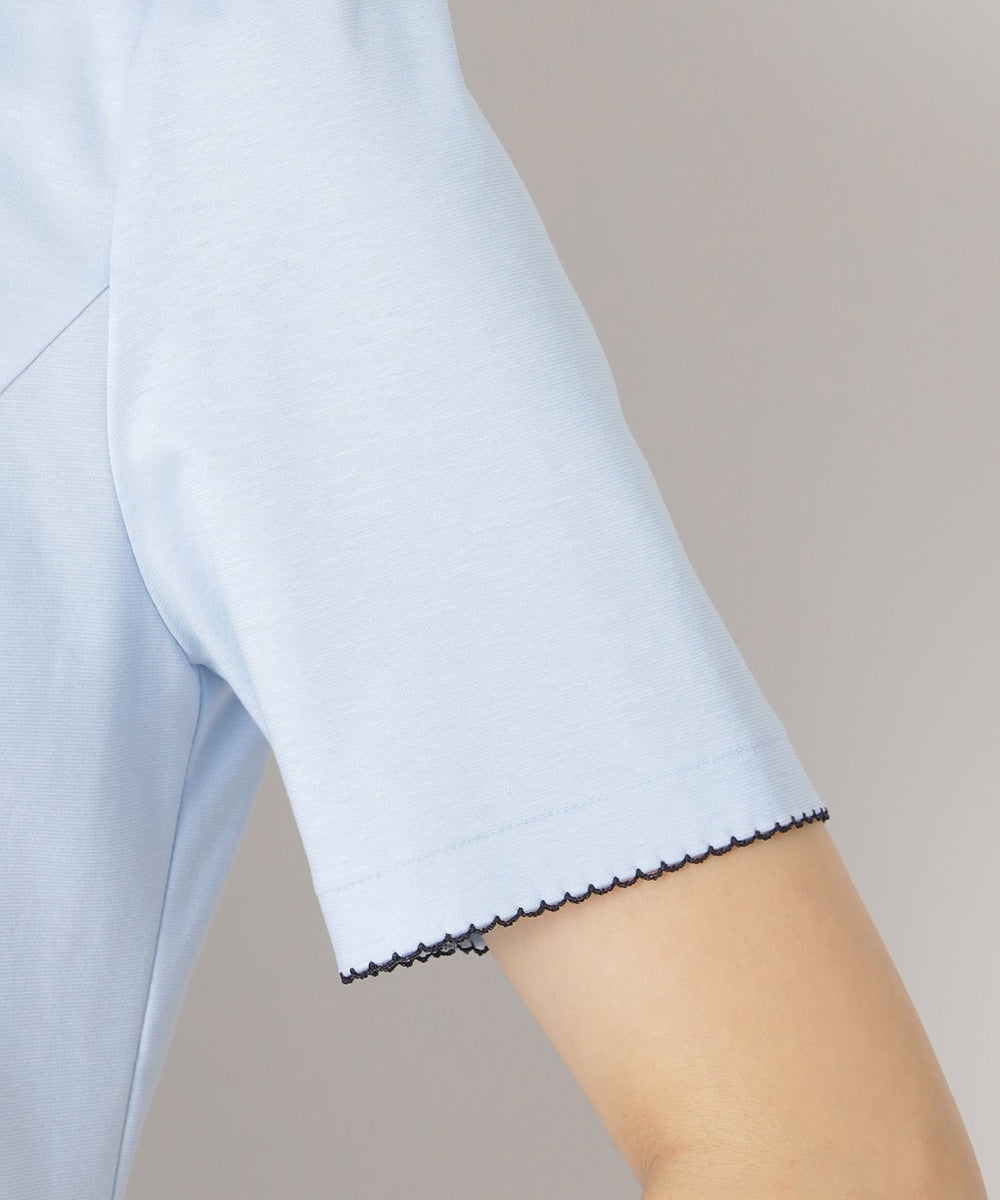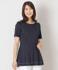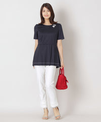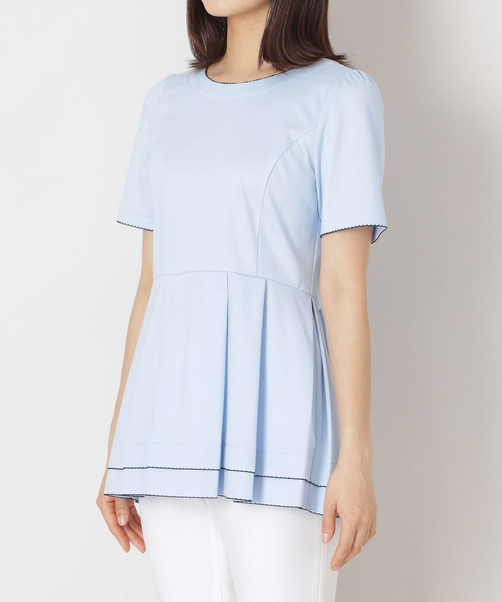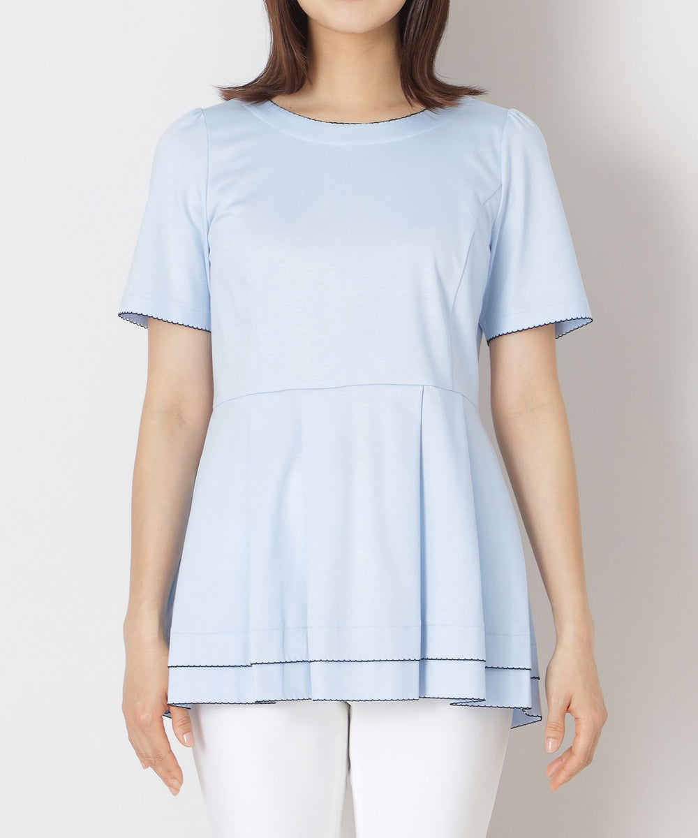 襟、袖口、裾に配色のピコ刺しゅうをあしらい、裾に2段のタックフレアを施したカットソーチュニックです。