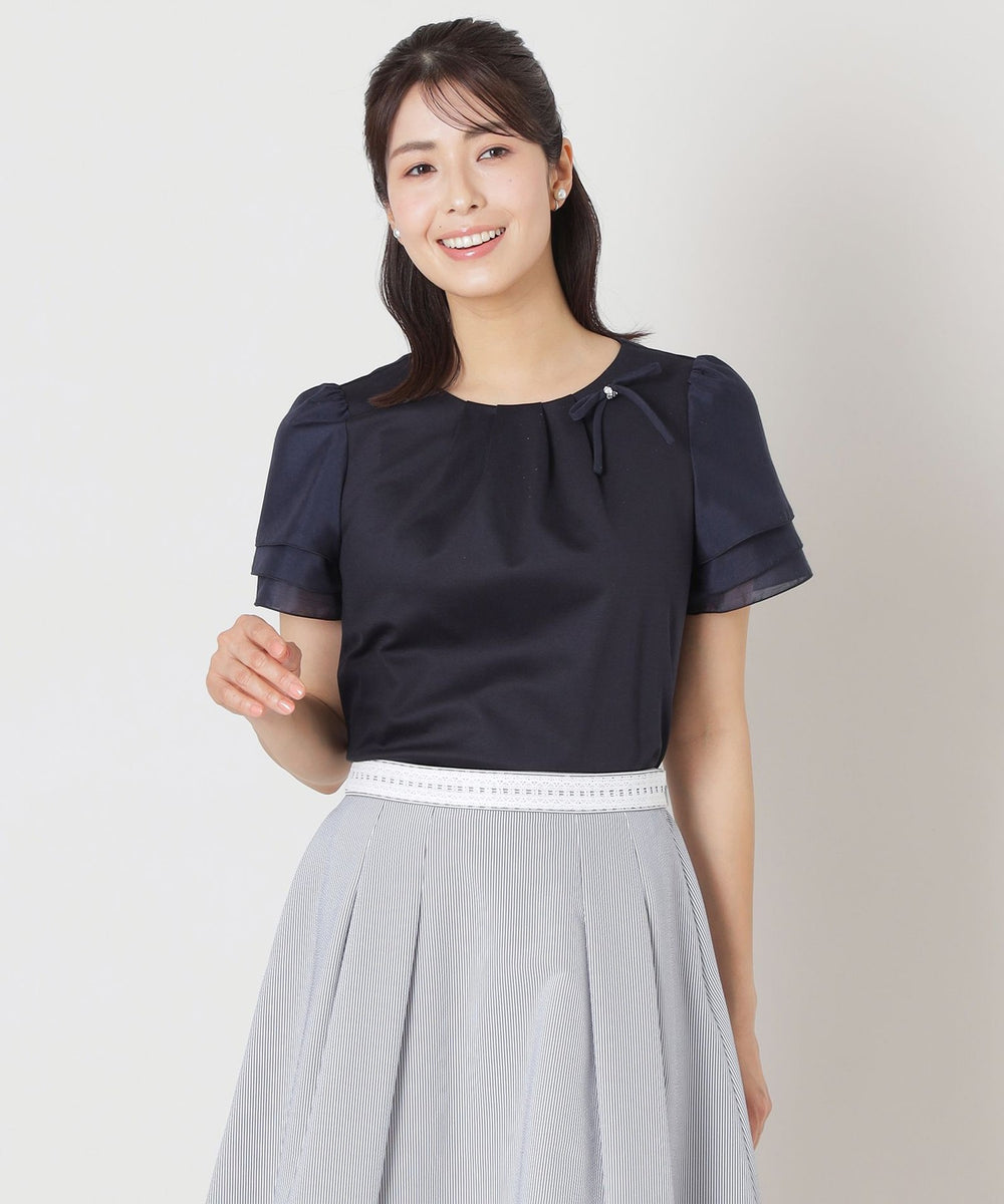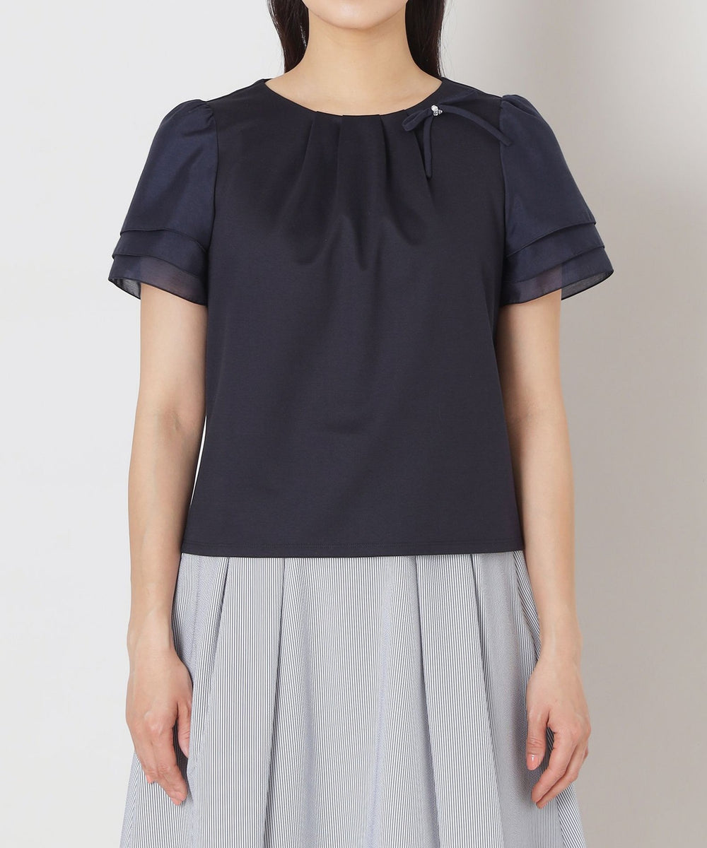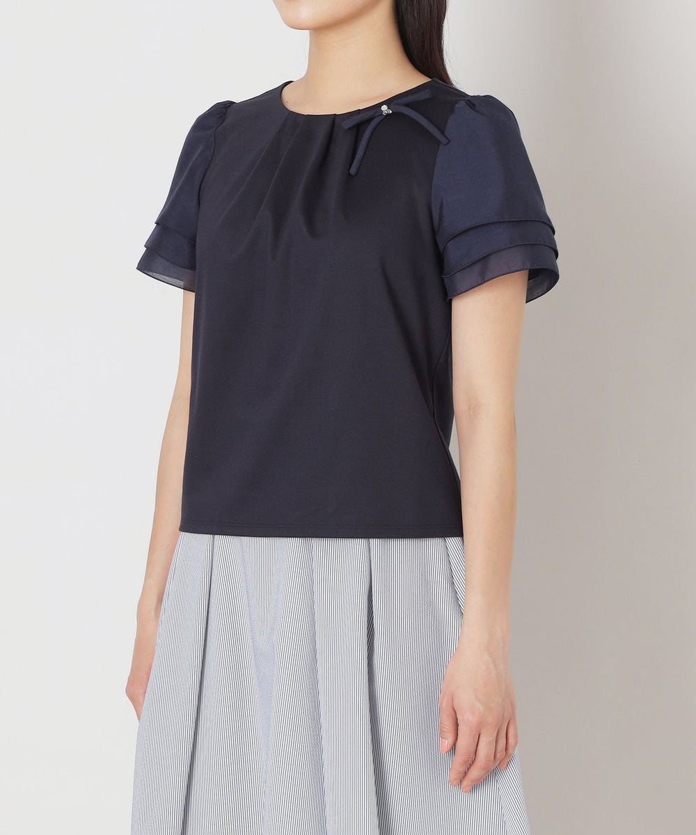 花びらのようにふんわりと重なる別布の3段レイヤードの袖に、リボンコサージュを添えた華やかな印象のドッキングカットソーです。
