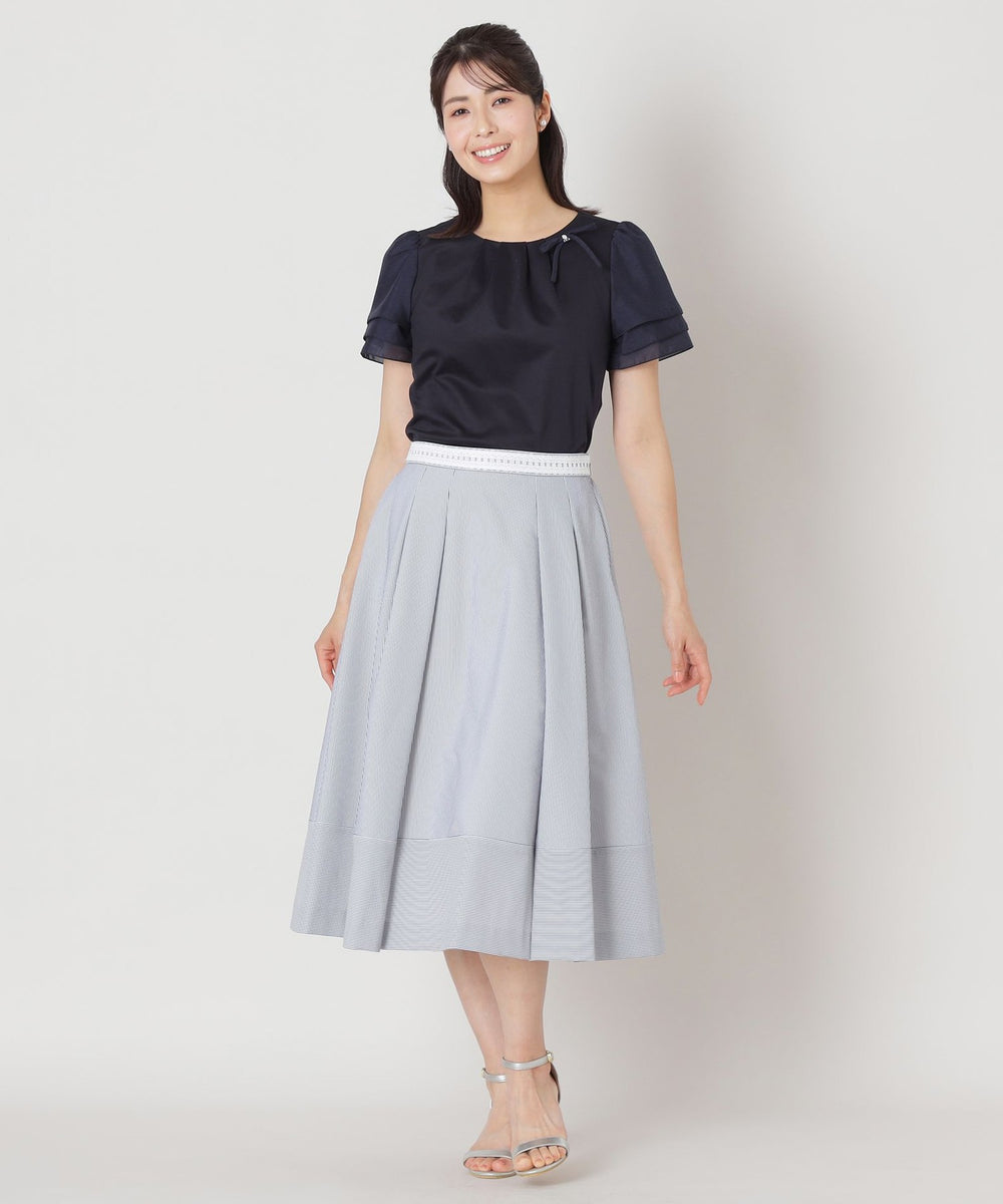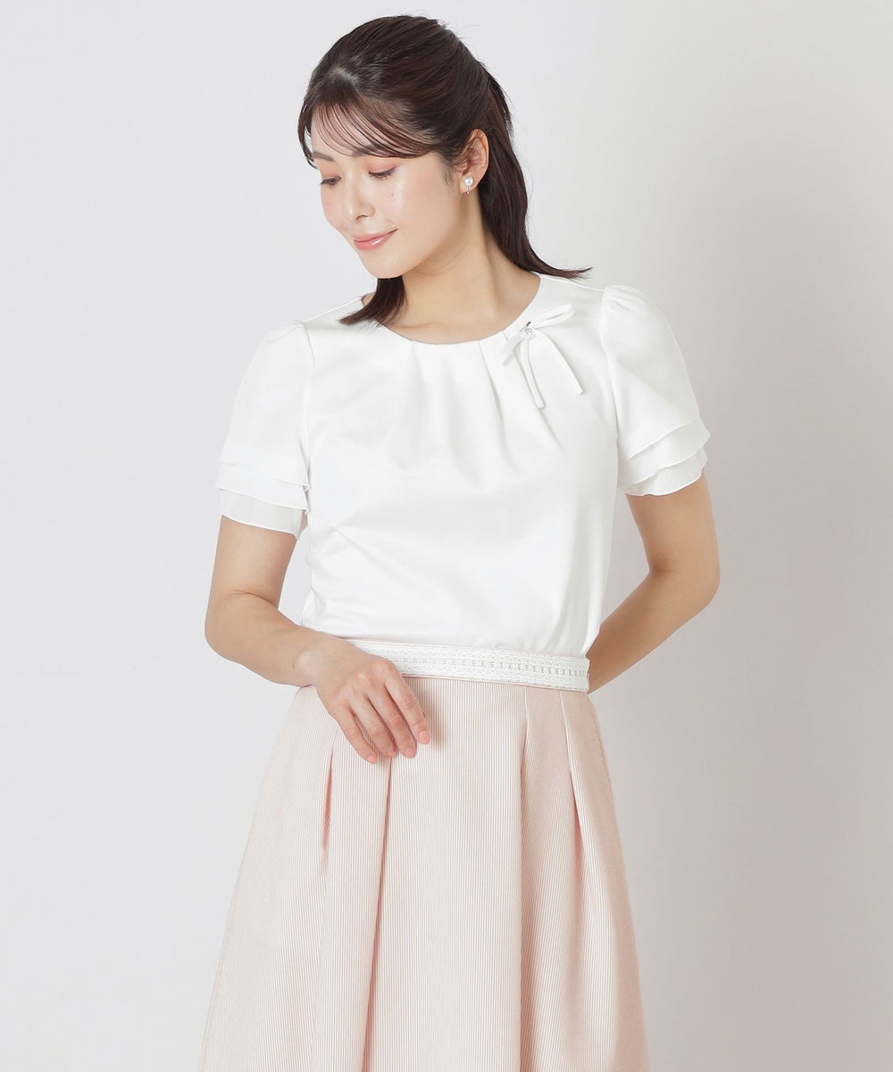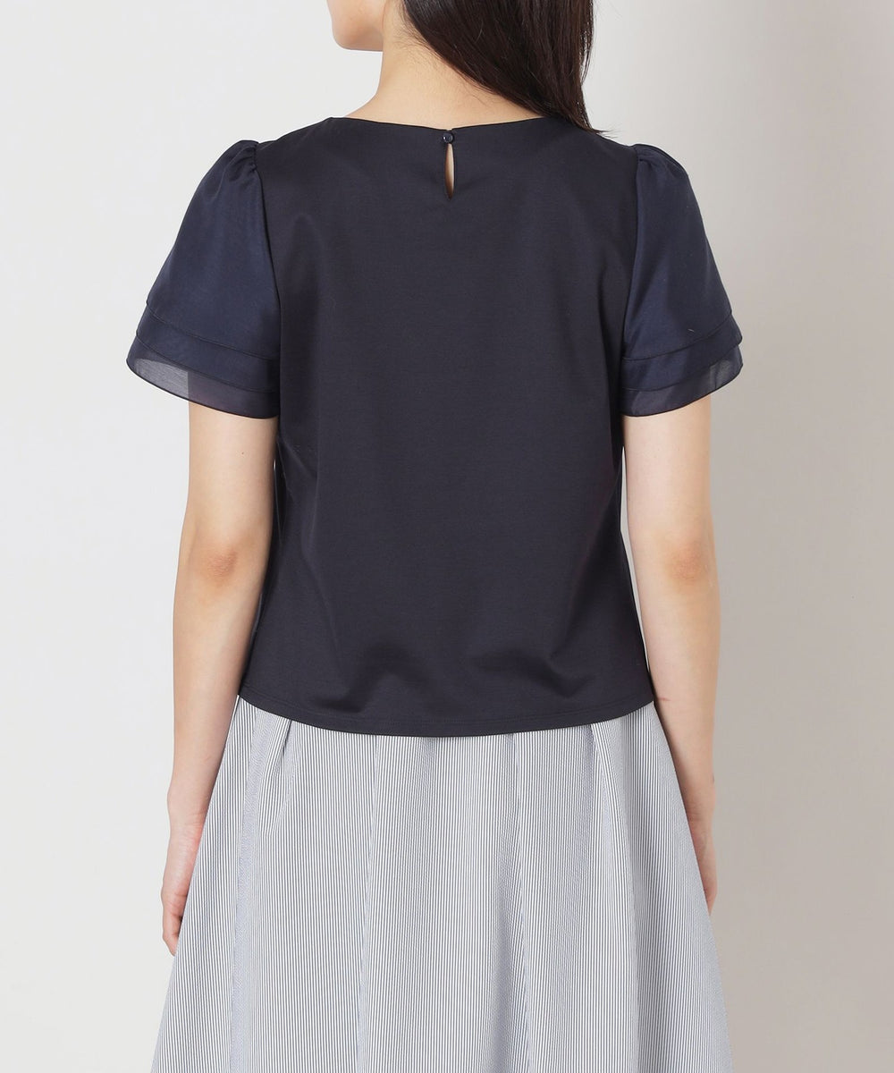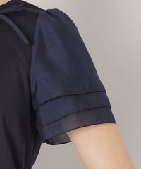 花びらのようにふんわりと重なる別布の3段レイヤードの袖に、リボンコサージュを添えた華やかな印象のドッキングカットソーです。