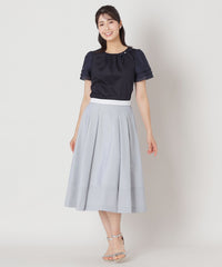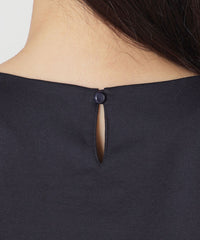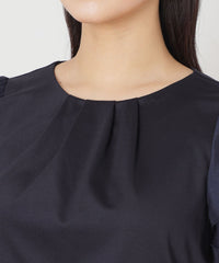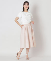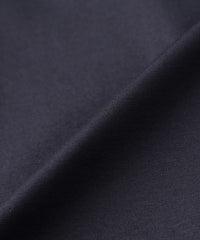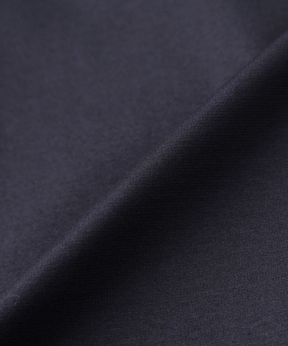 ハイゲージで編んでいるため、織物のようなきめ細やかな表情をしています。捲縮エステルを使用することで、伸縮のある生地になっています。加工では光沢を引き出すためシルケットとガス焼きを施し、毛羽を極限までカットしてドレープのきいた伸縮性のあるファブリックに仕上げています。別布部分はなめらかで光沢のある、シルクコットン調のサテン素材を使用しています。