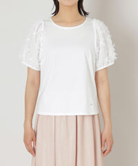 袖部分にリボンモチーフをあしらい、さりげない可愛らしさを添えたデザインが魅力の異素材切り替えで魅せるエレガントプルオーバーです。