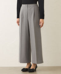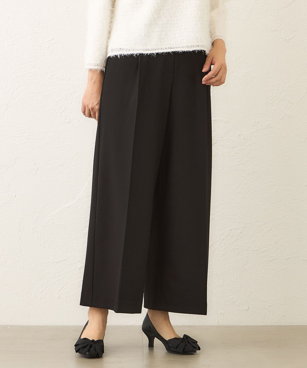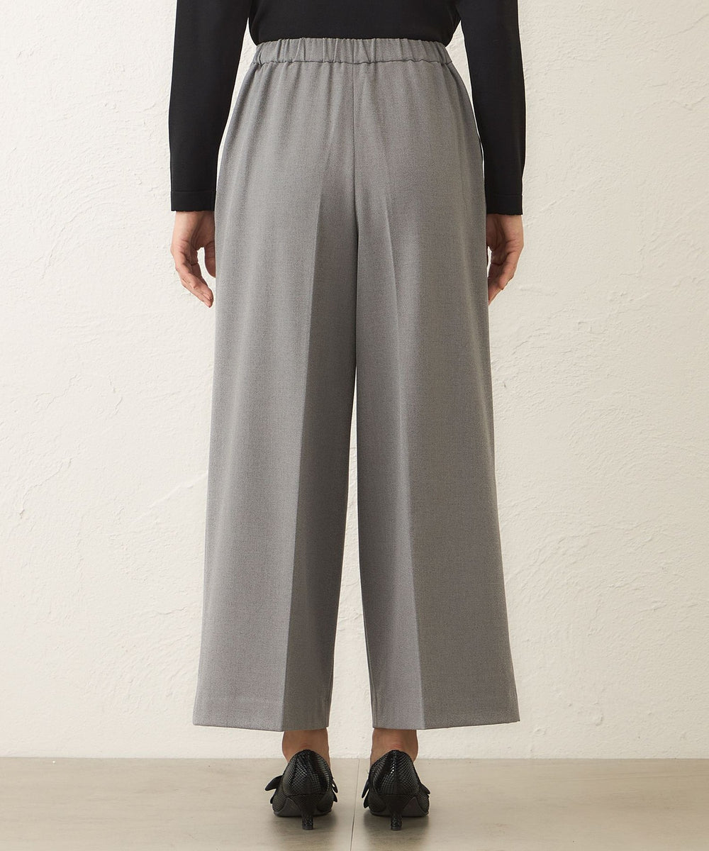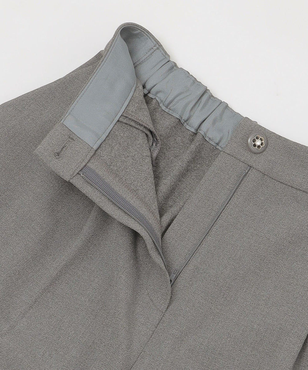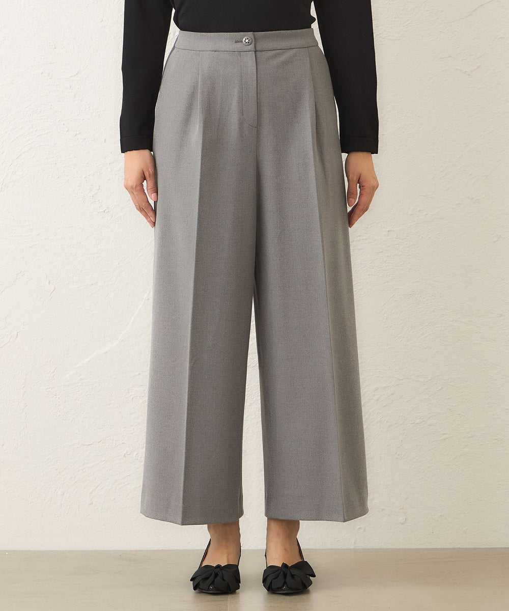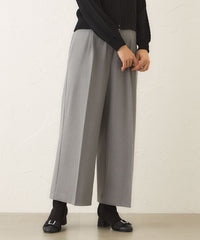 表側はきれいめなジョーゼット組織、裏側は起毛仕上げで温かみのある素材を使用したワイドパンツです。1本タックにセンタープレスを施し、上品で脚長効果のあるシルエットに仕上げました。ウエスト部分には、ラインストーン入りのフラワーモチーフボタンをあしらい、さりげない華やかさをプラスしています。