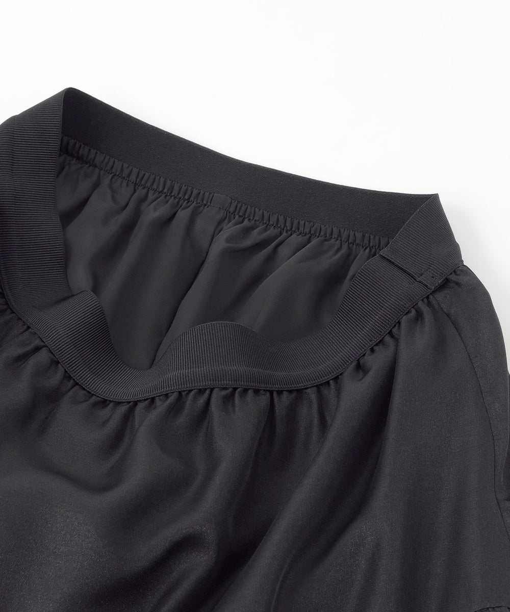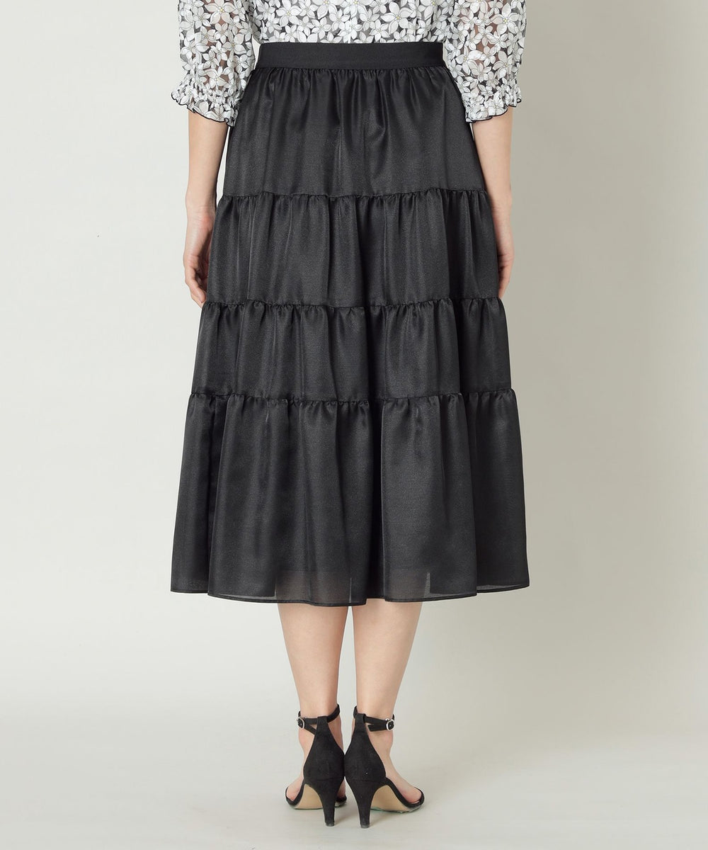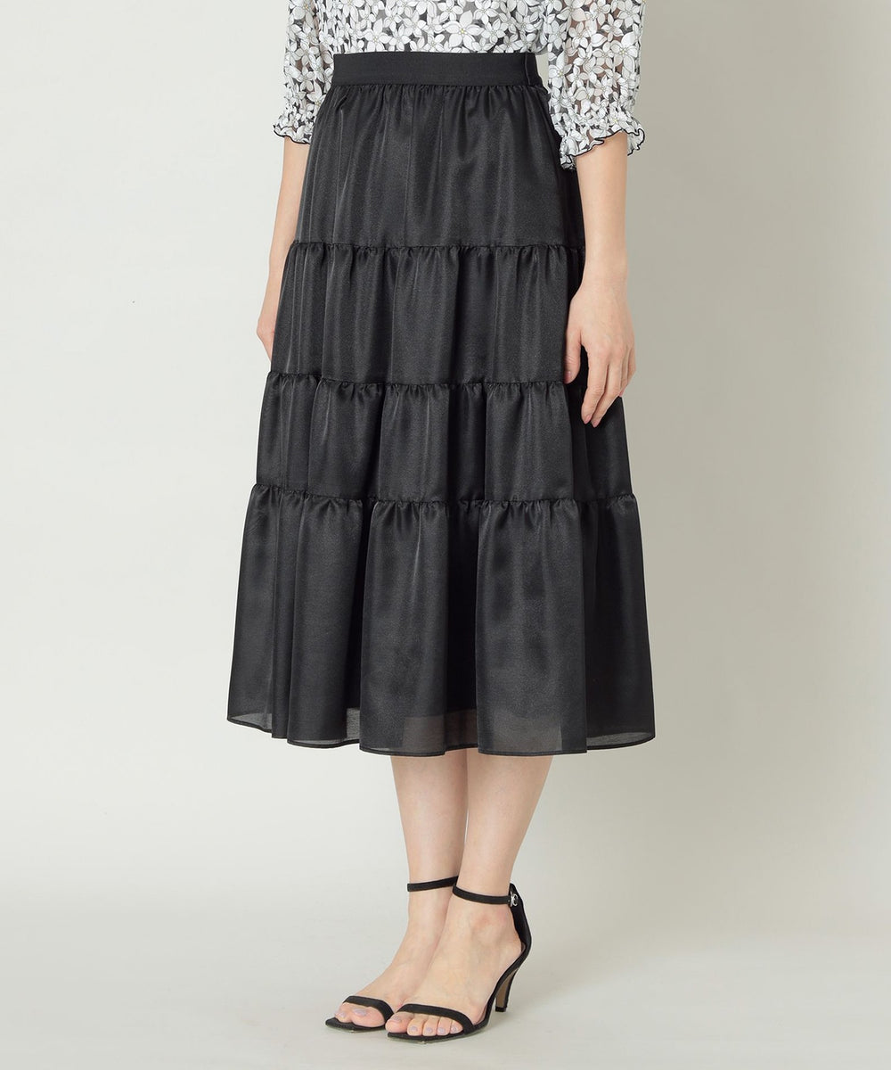 程よいハリ感と光沢感のある素材感により、ランダムティアードのシルエットが綺麗に表現され華やかな装いを演出できるスカートです。