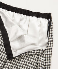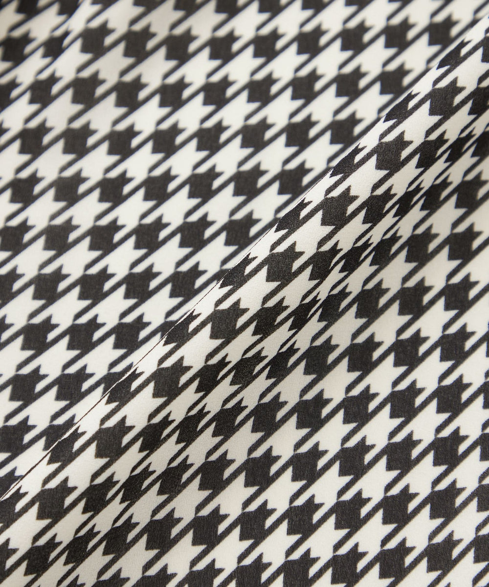程よい透け感と軽やかさが特徴の、国産梨地ジョーゼットプリント素材。減量加工にこだわることで、ふんわりとしたソフトな肌ざわりに仕上げました。クラシカルな千鳥柄が、上品で洗練された印象を演出します。