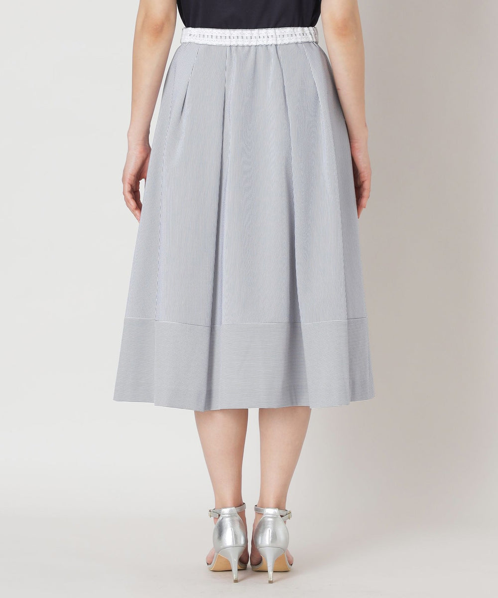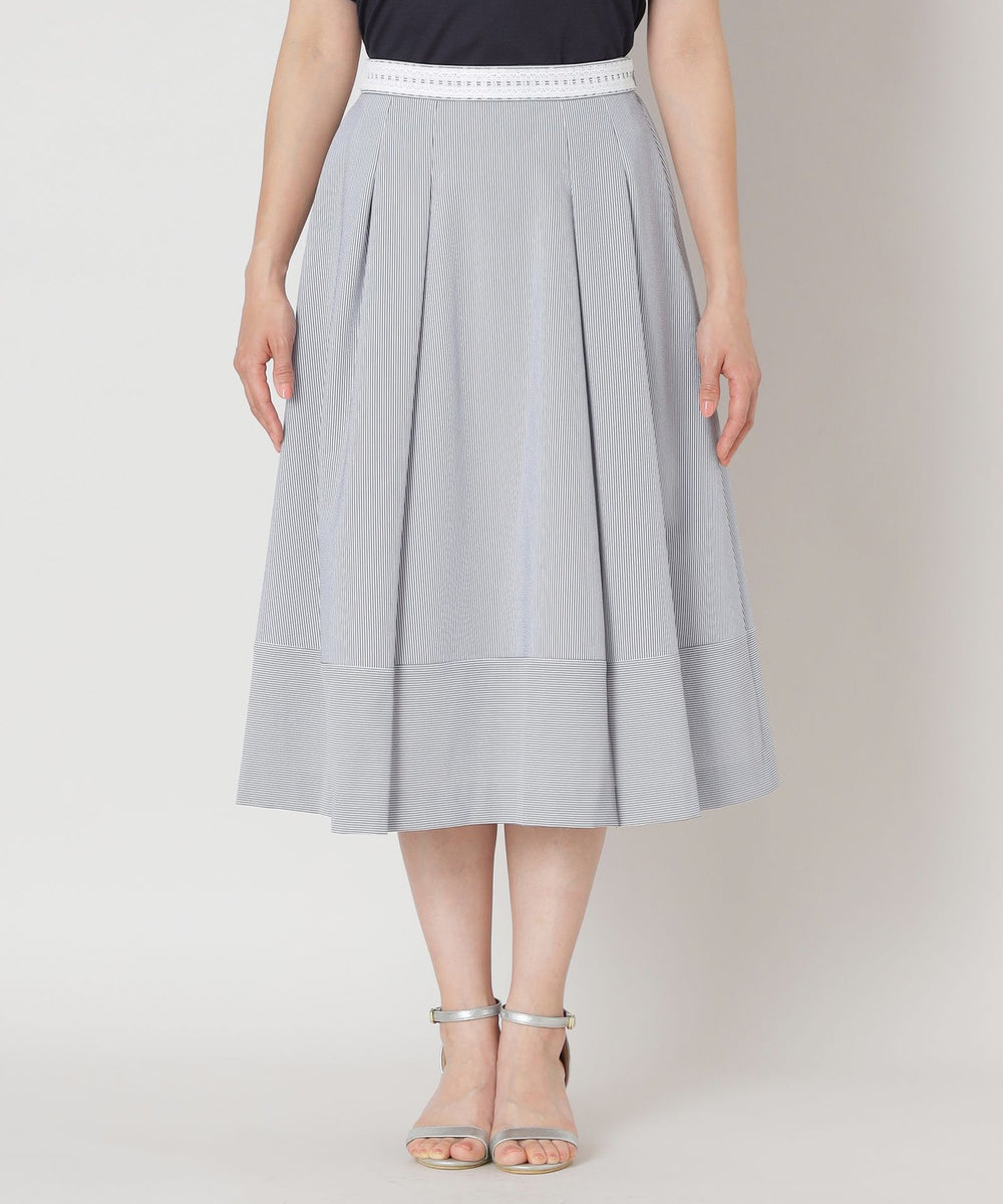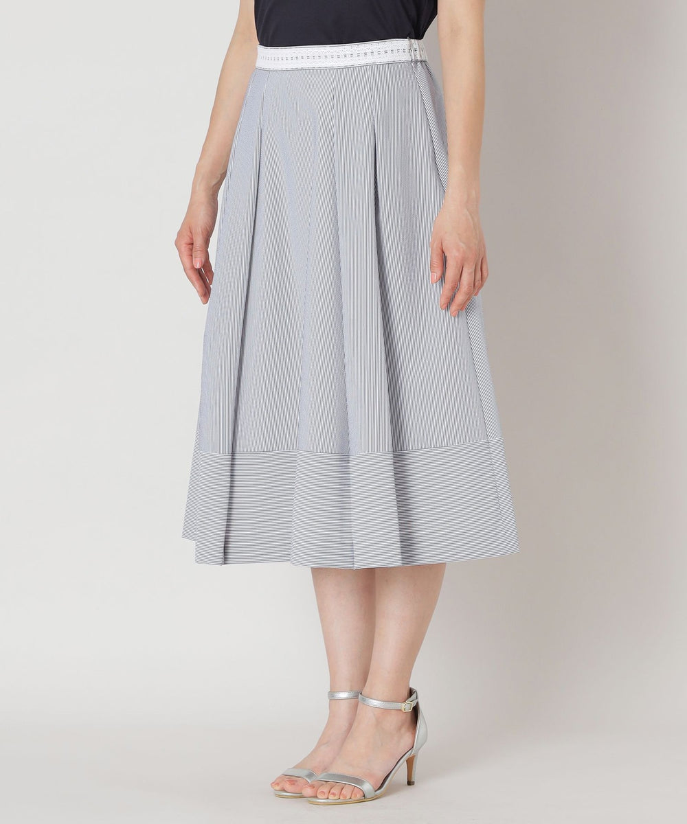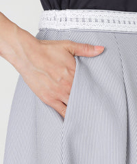 ウエストベルトにレースをあしらい、トップスをインした際にもさりげないアクセントになるデザインに仕上げています。タックは内向きのインタックで、裾部分は切替えを施し、ボーダー柄を横地使いにすることでデザイン性を高めました。ストライプ柄が爽やかなカジュアルスカートです。