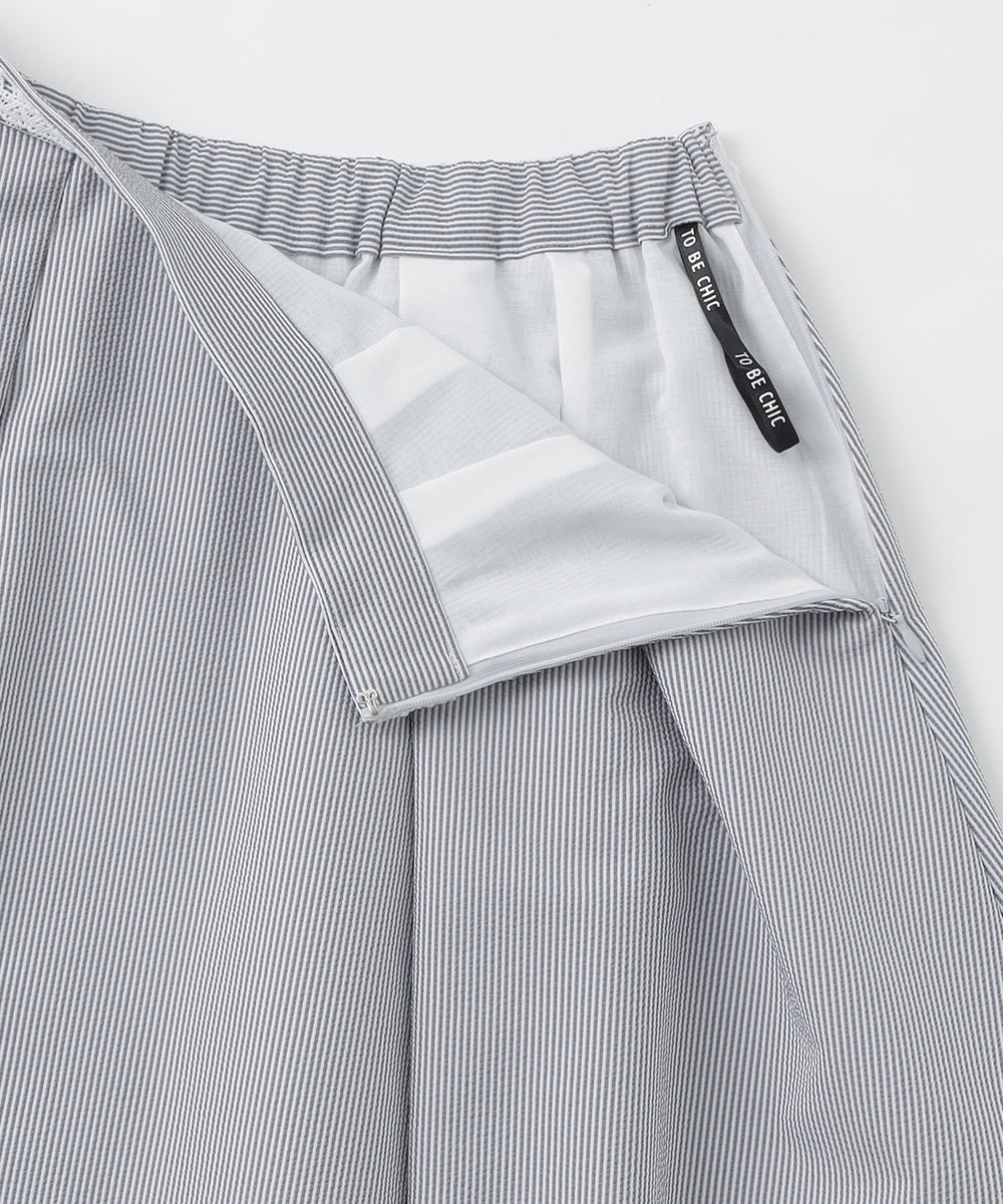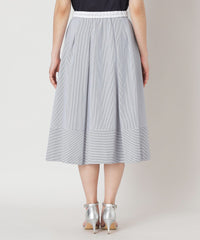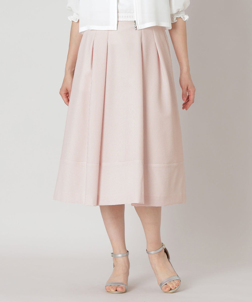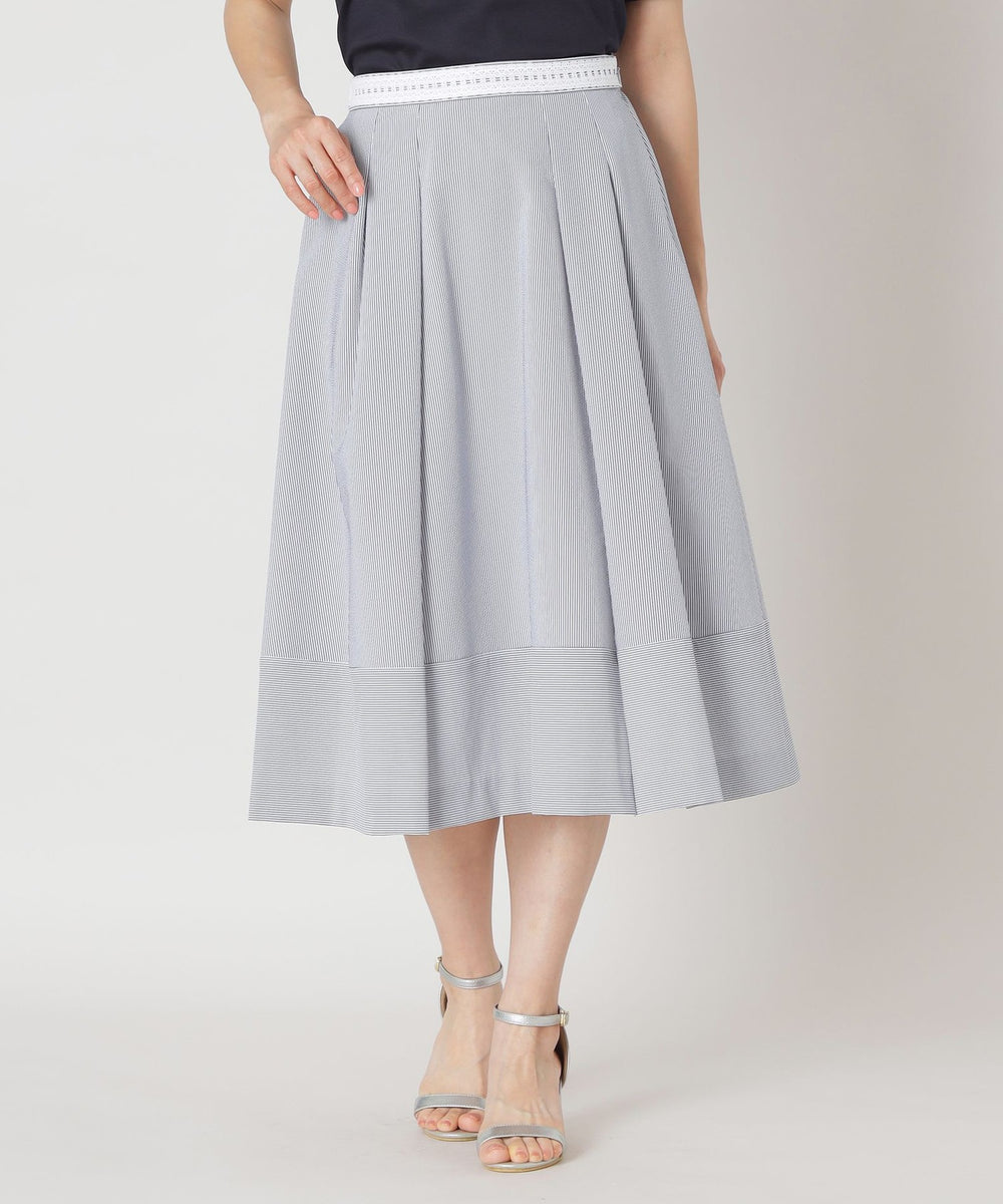 ウエストベルトにレースをあしらい、トップスをインした際にもさりげないアクセントになるデザインに仕上げています。タックは内向きのインタックで、裾部分は切替えを施し、ボーダー柄を横地使いにすることでデザイン性を高めました。ストライプ柄が爽やかなカジュアルスカートです。
